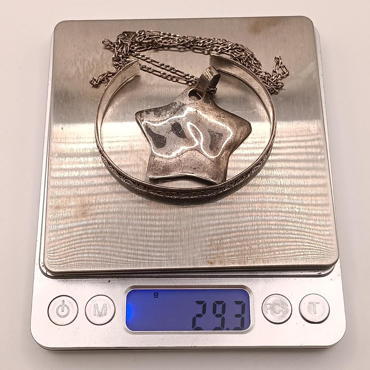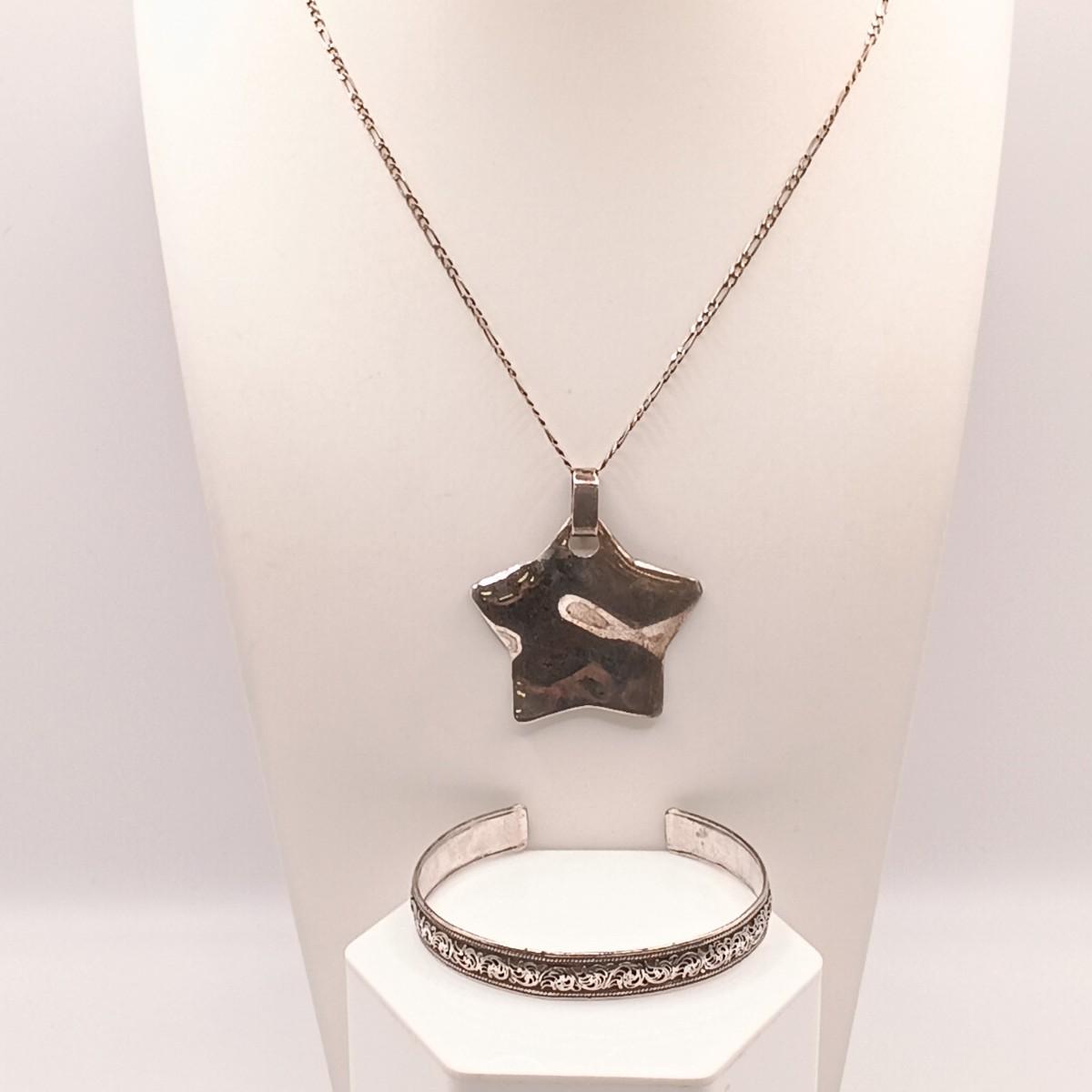 LOT 180: Vintage Sterling 925 Silver Cuff Bracelet and Star Pendant Necklace 29.3g