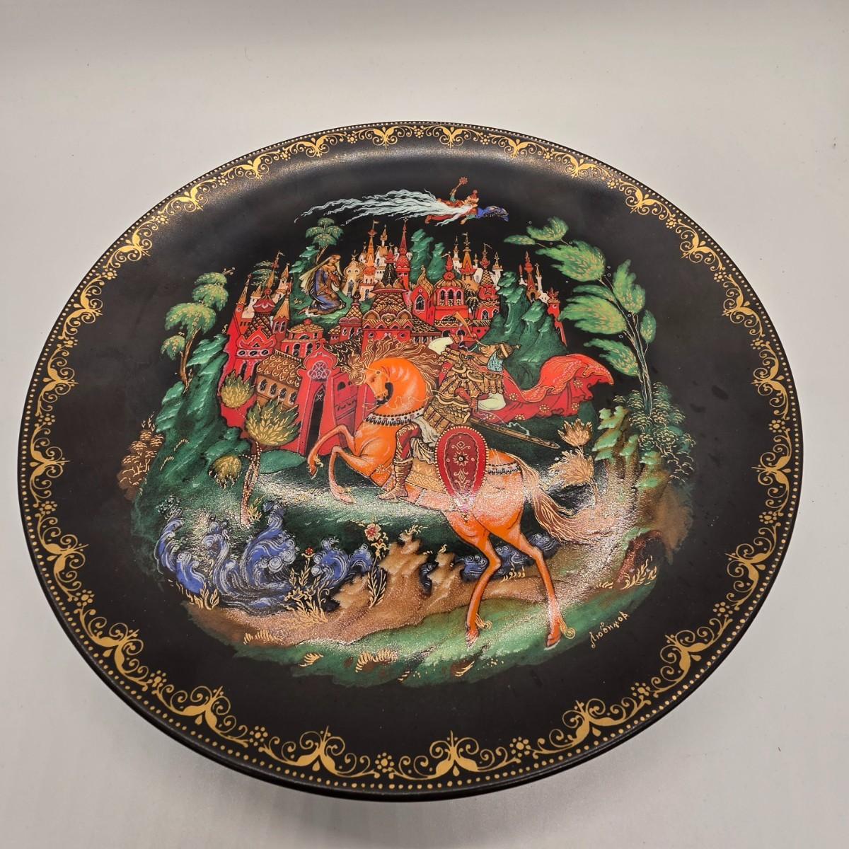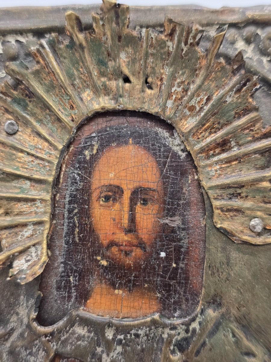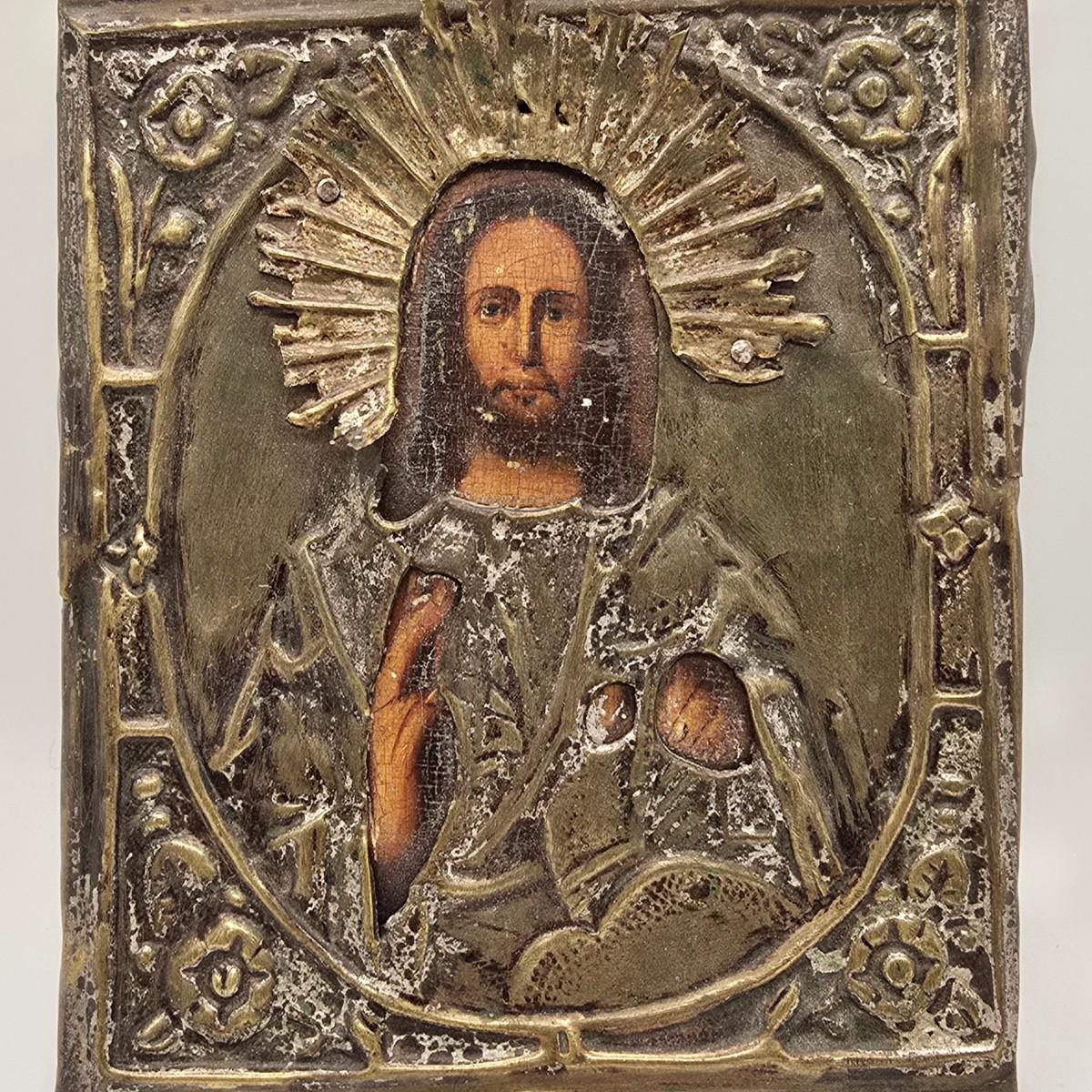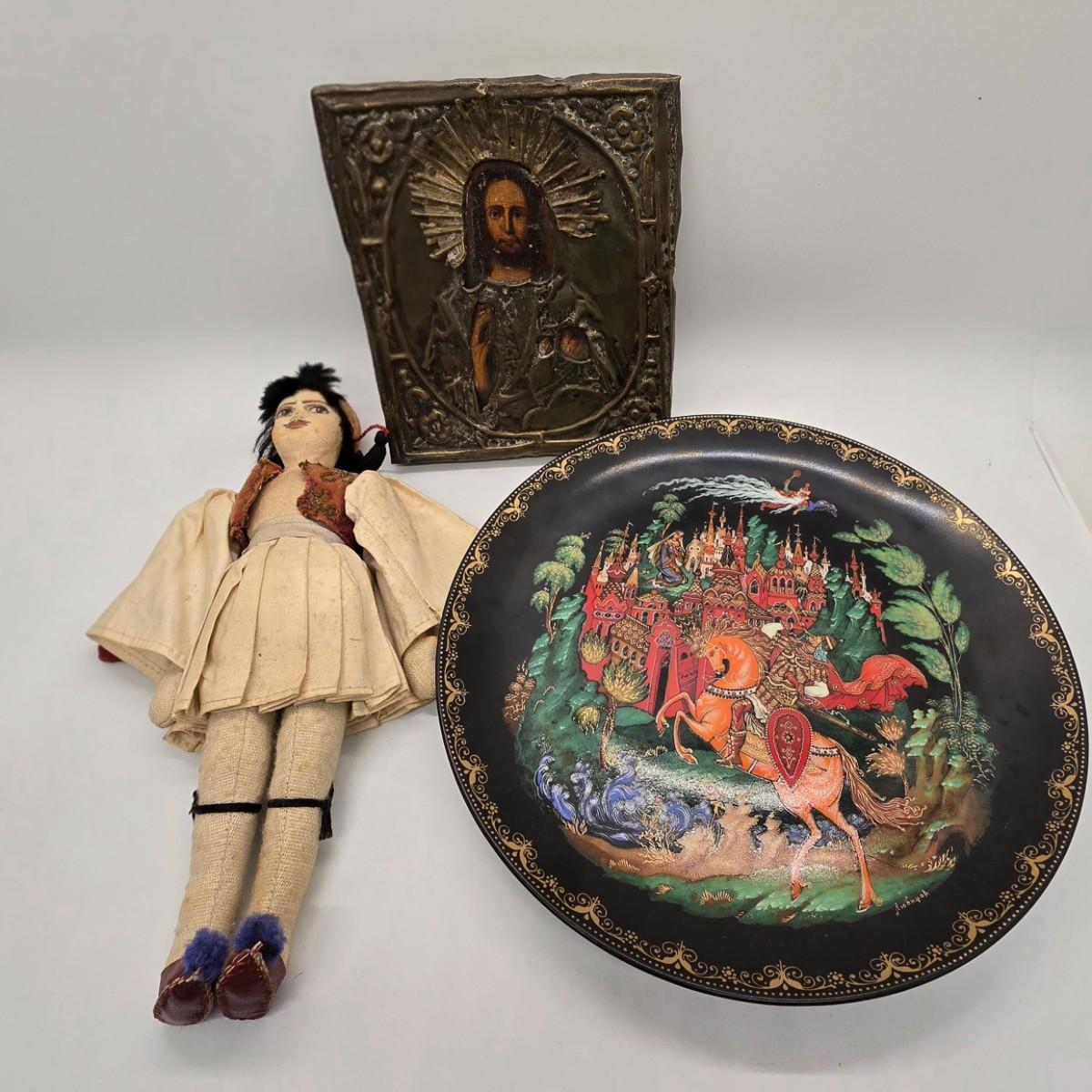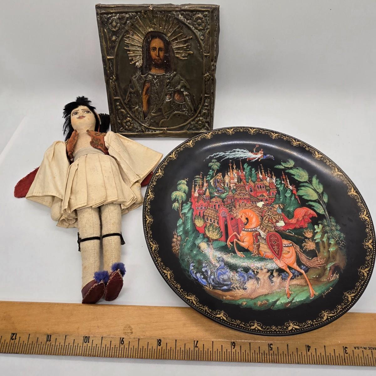 LOT 207: Russian Orthodox 19th century Jesus Christ Icon, First Edition "Russian Tales" Vinogradov Porcelain Factory Collector's Plate and Small Doll