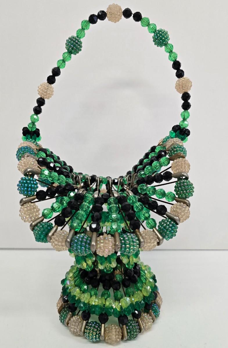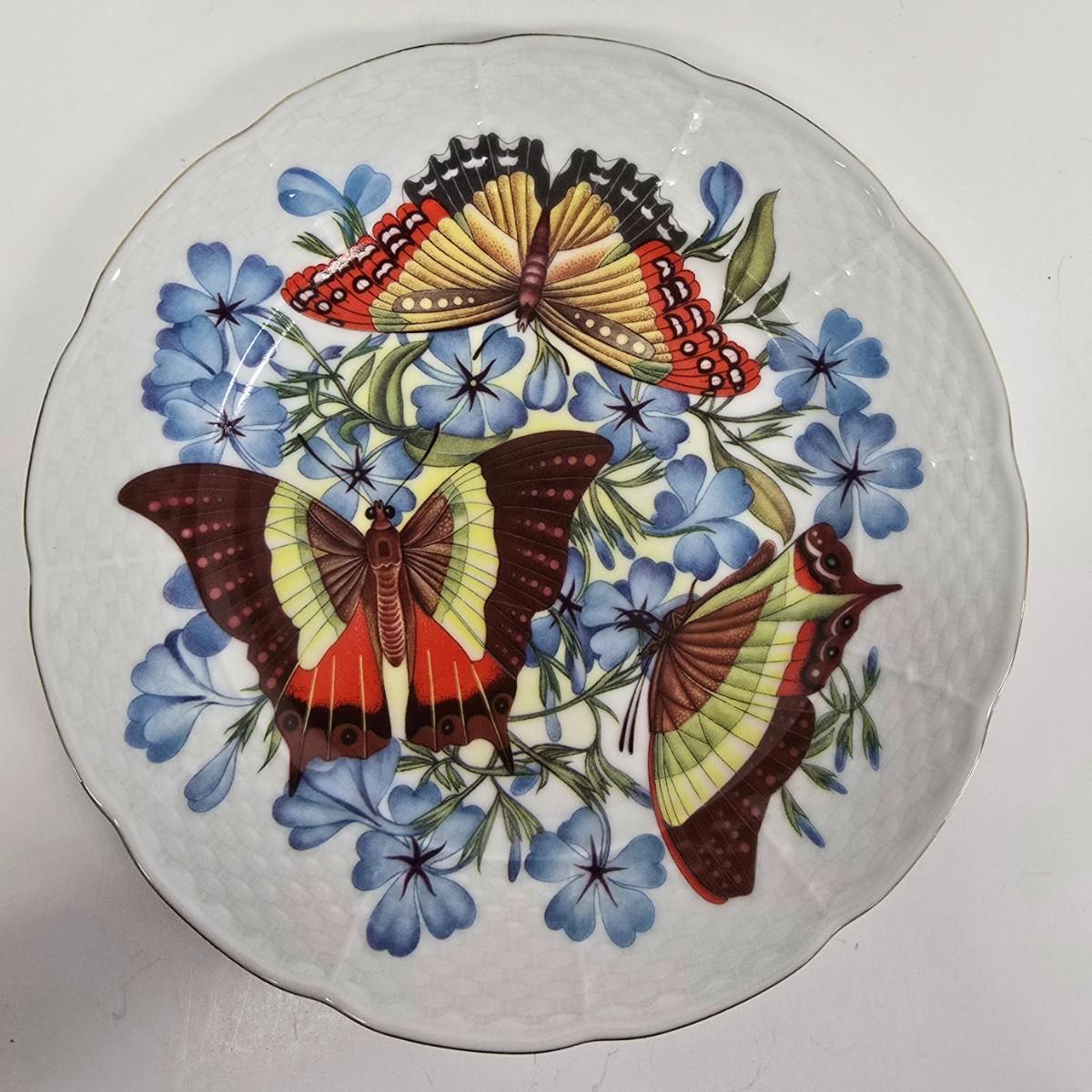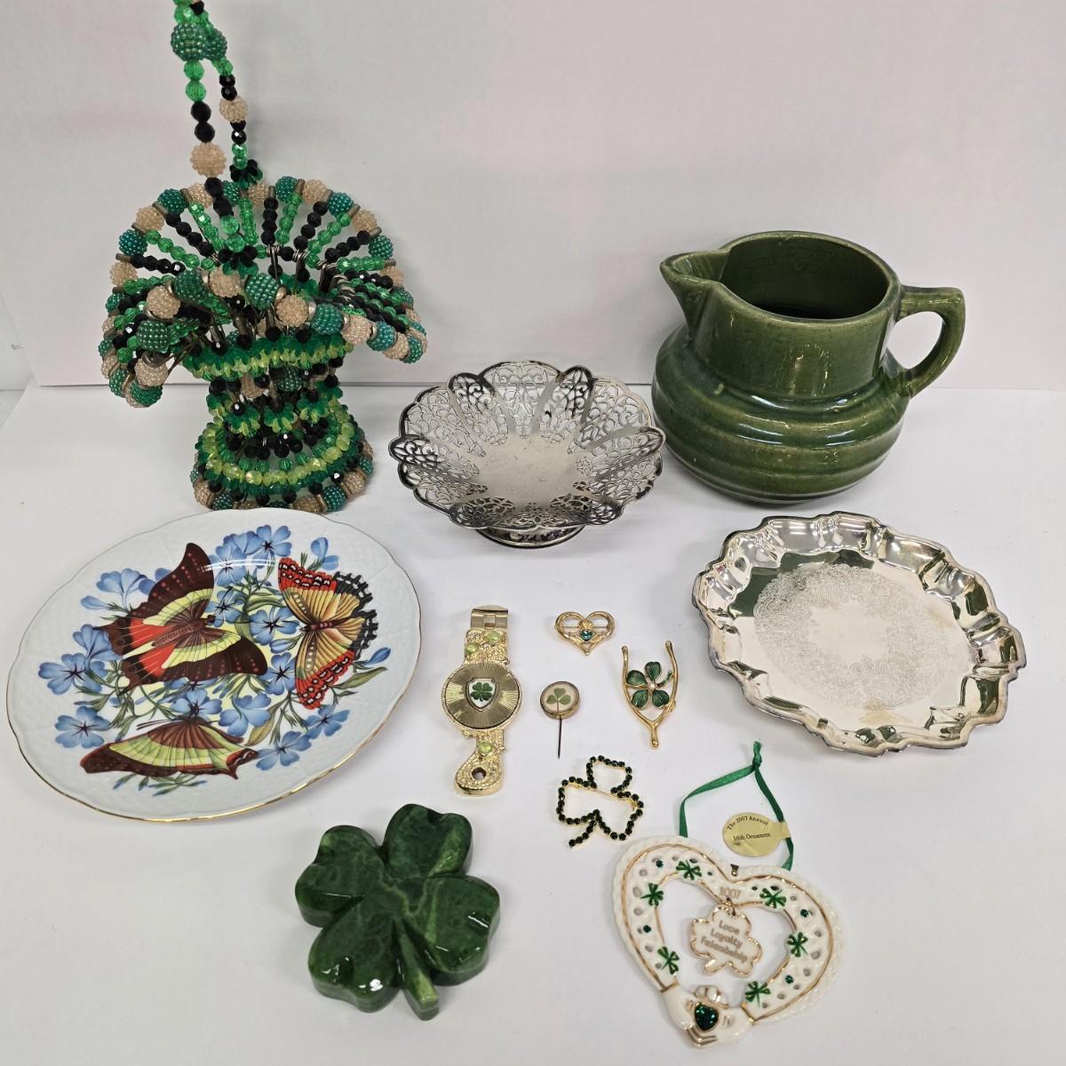 LOT 210: Godinger "1855 Email de Limoges" Collector's Plate, Glazed Ceramic Jug, Silver-plate Trays, Alabaster Carved Paperweight, Porcelain Ornament, Brooches, Can Opener and Beaded Basket