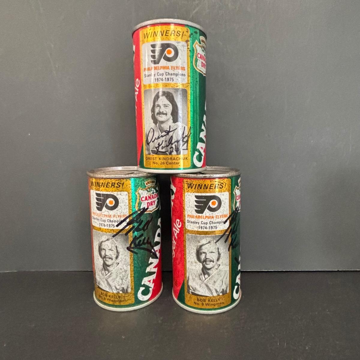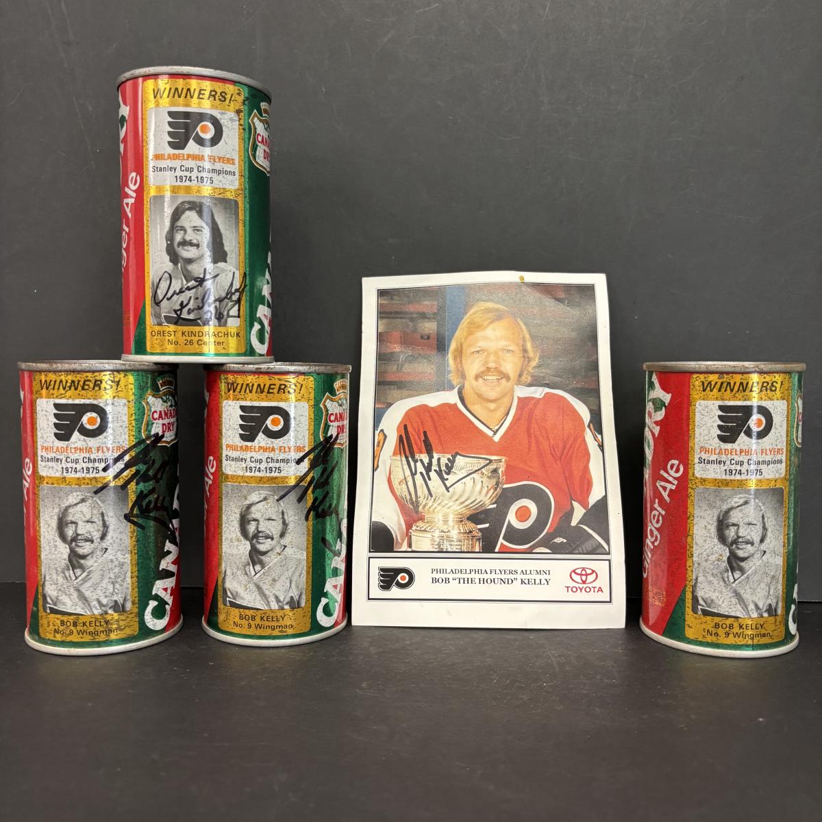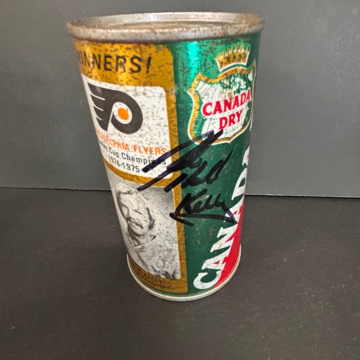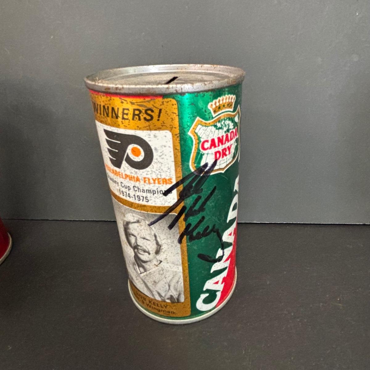 LOT 222: Autographed Canada Dry Philadelphia Flyers Banks, Bob Kelly Photograph & Unopened Can