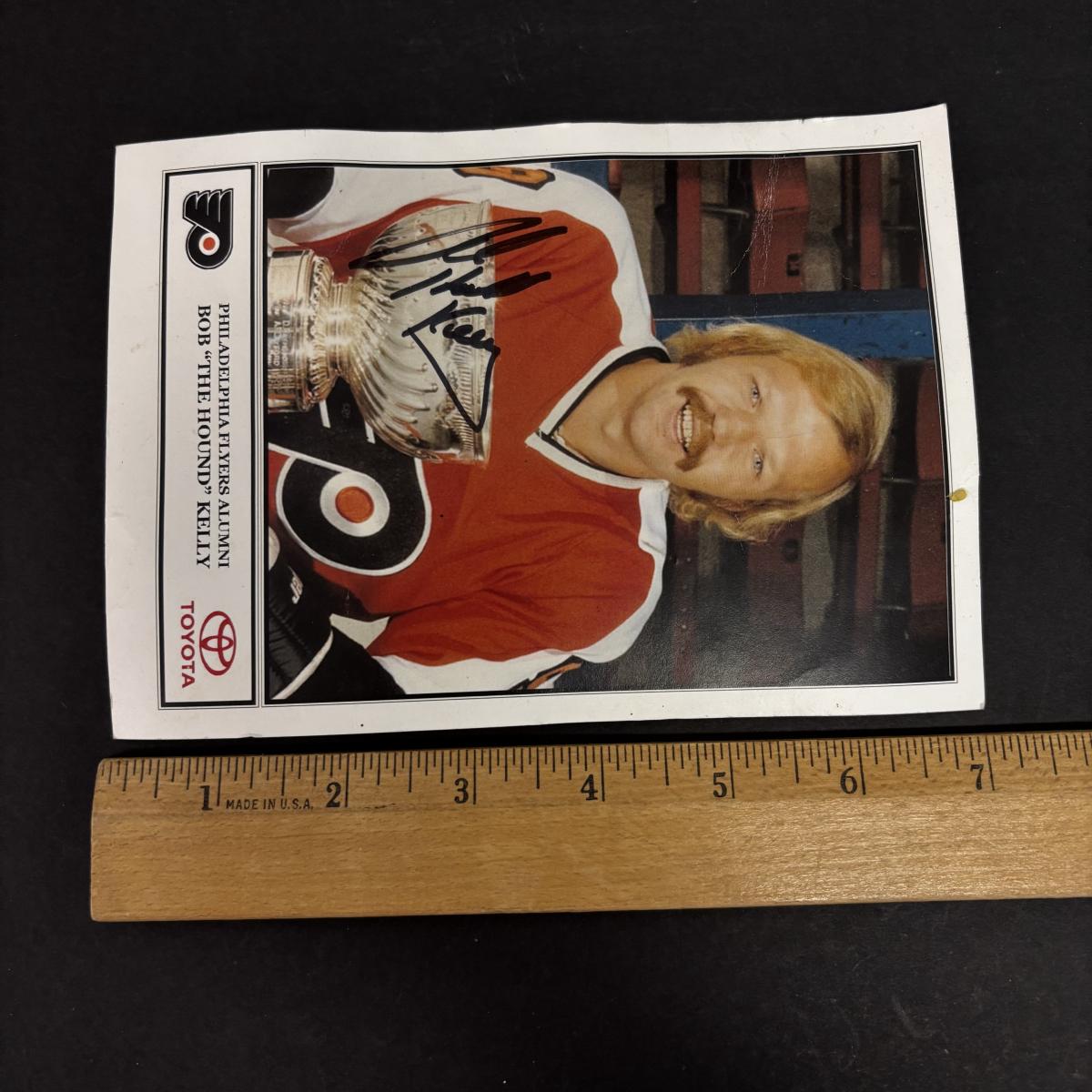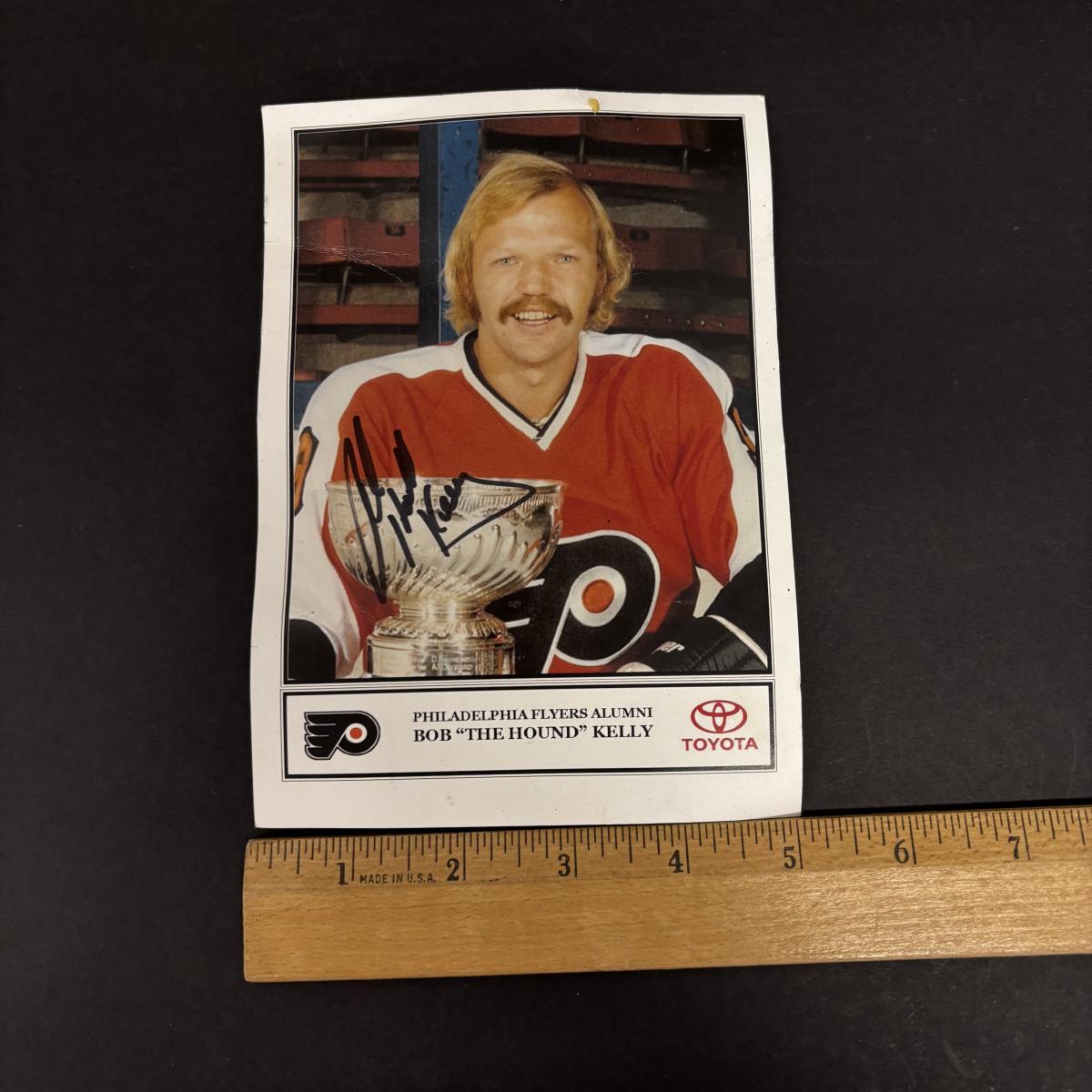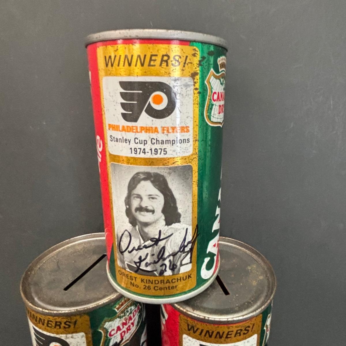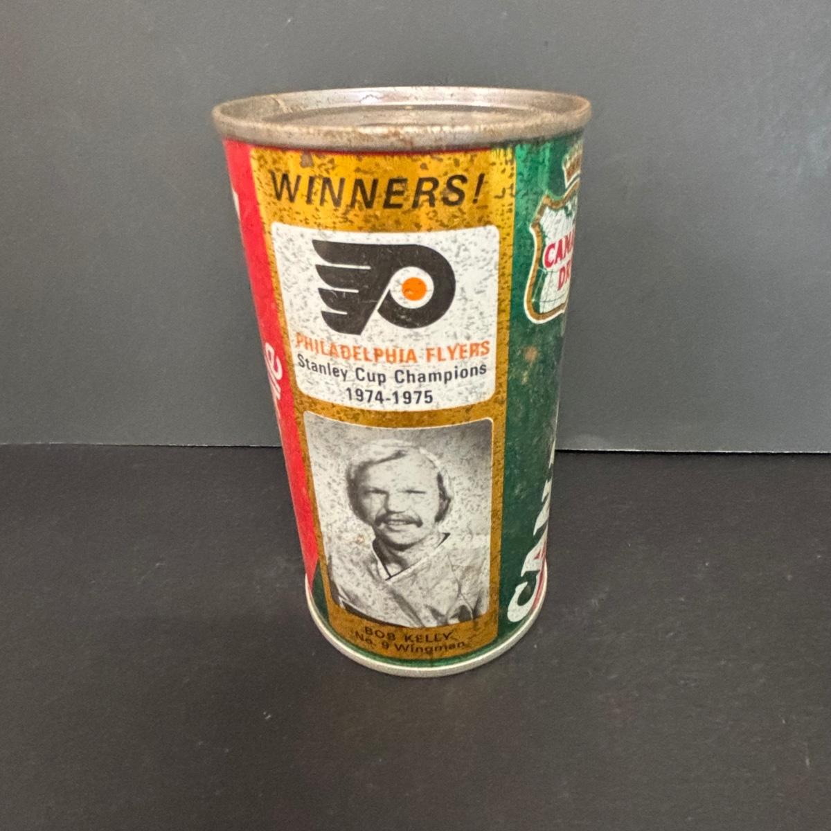 LOT 222: Autographed Canada Dry Philadelphia Flyers Banks, Bob Kelly Photograph & Unopened Can