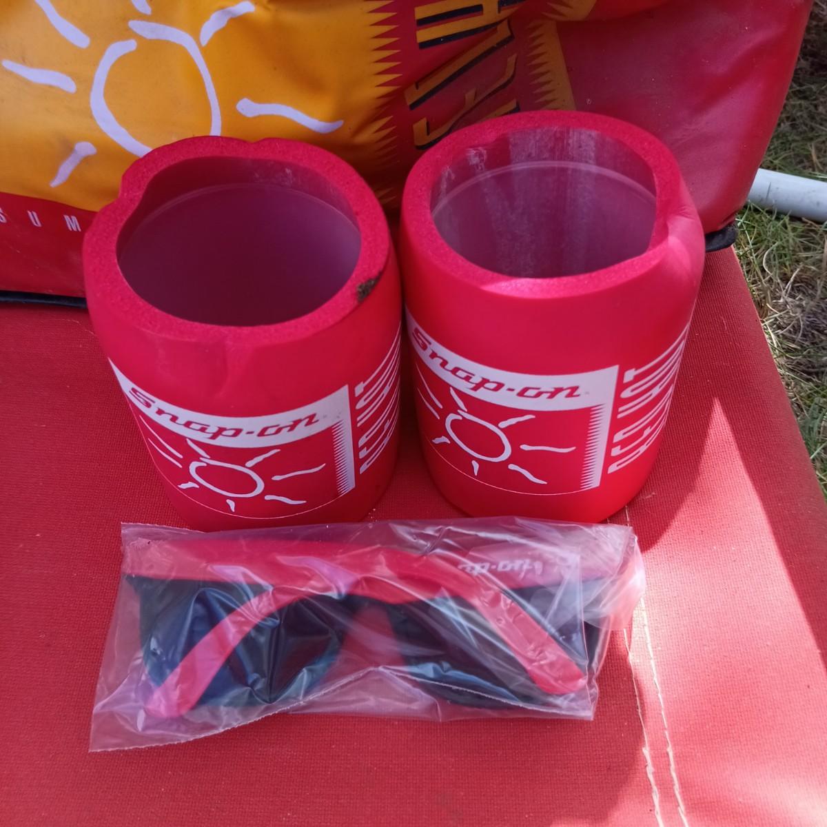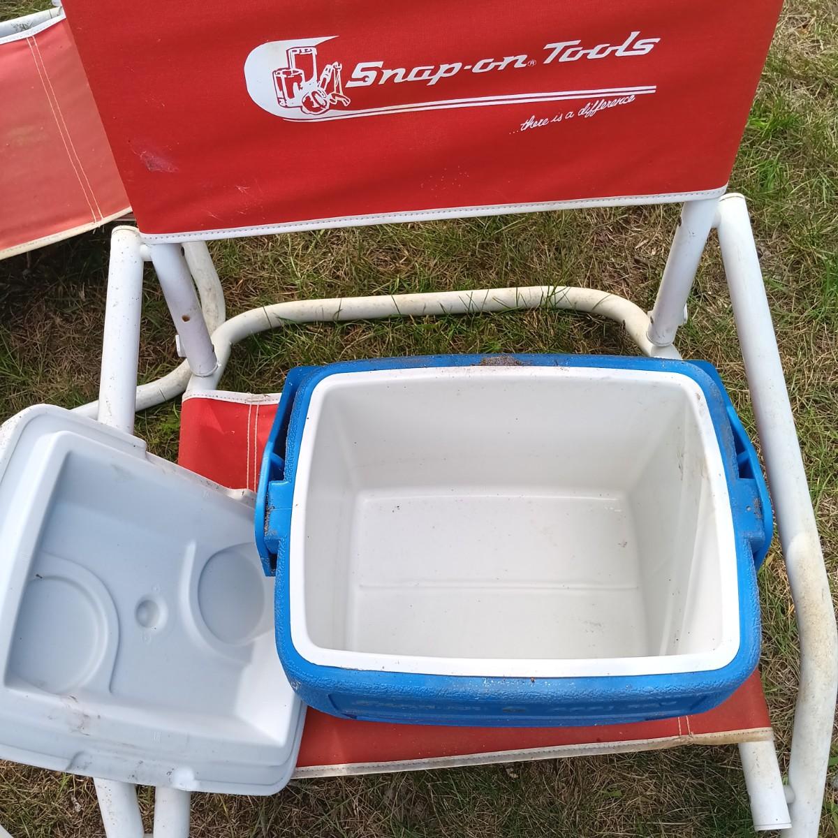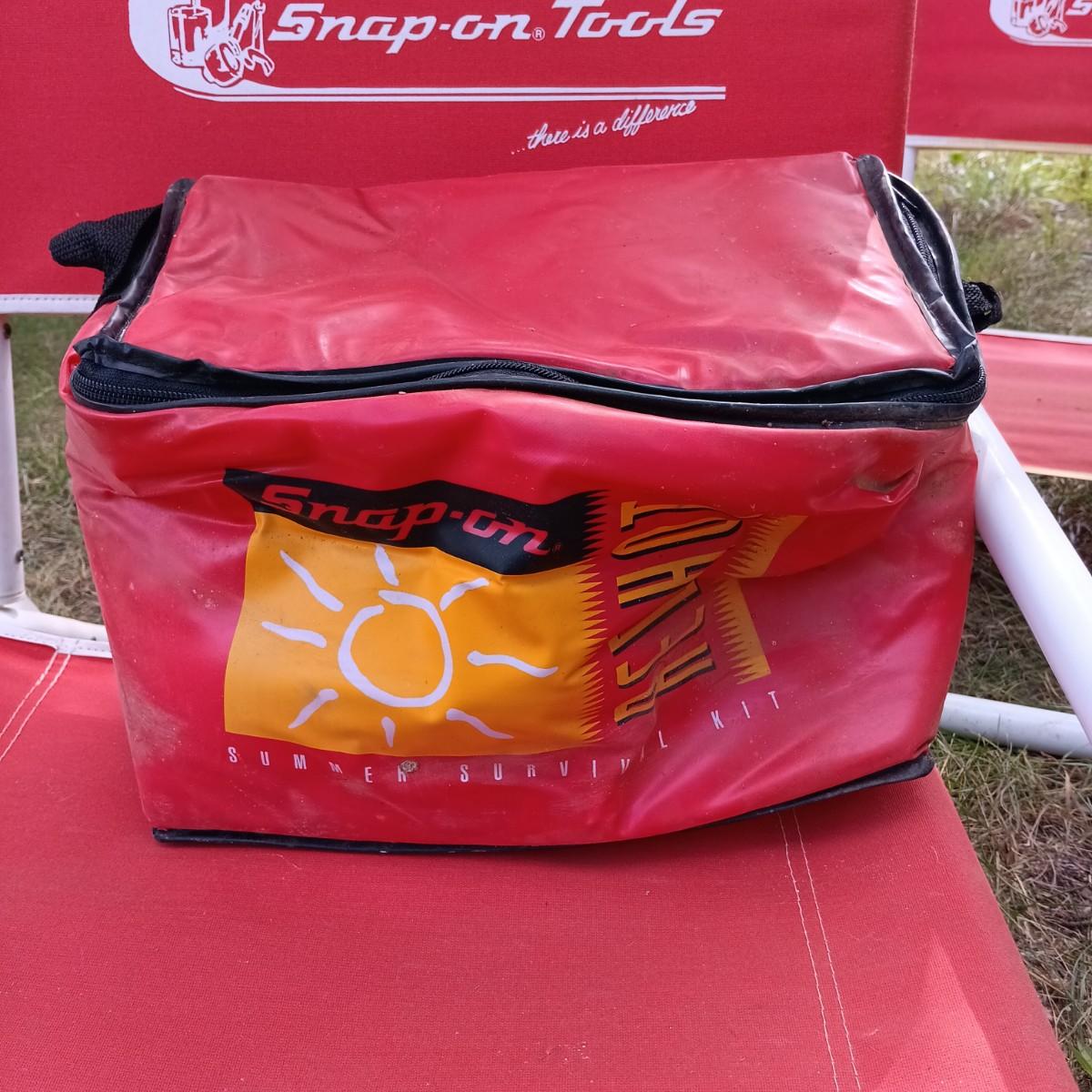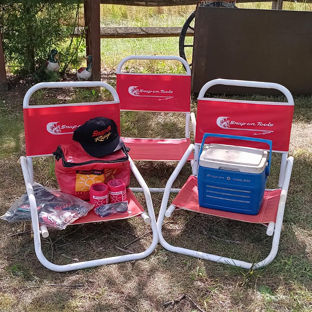 LOT 15: Snap-On Folding Beach Chairs with Blue Cool Box, Snap-On Racing Hat, Red Hot Shirt & More