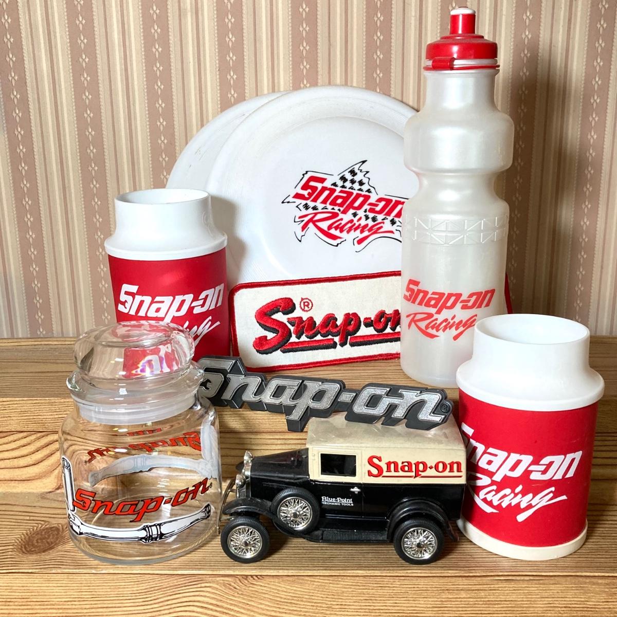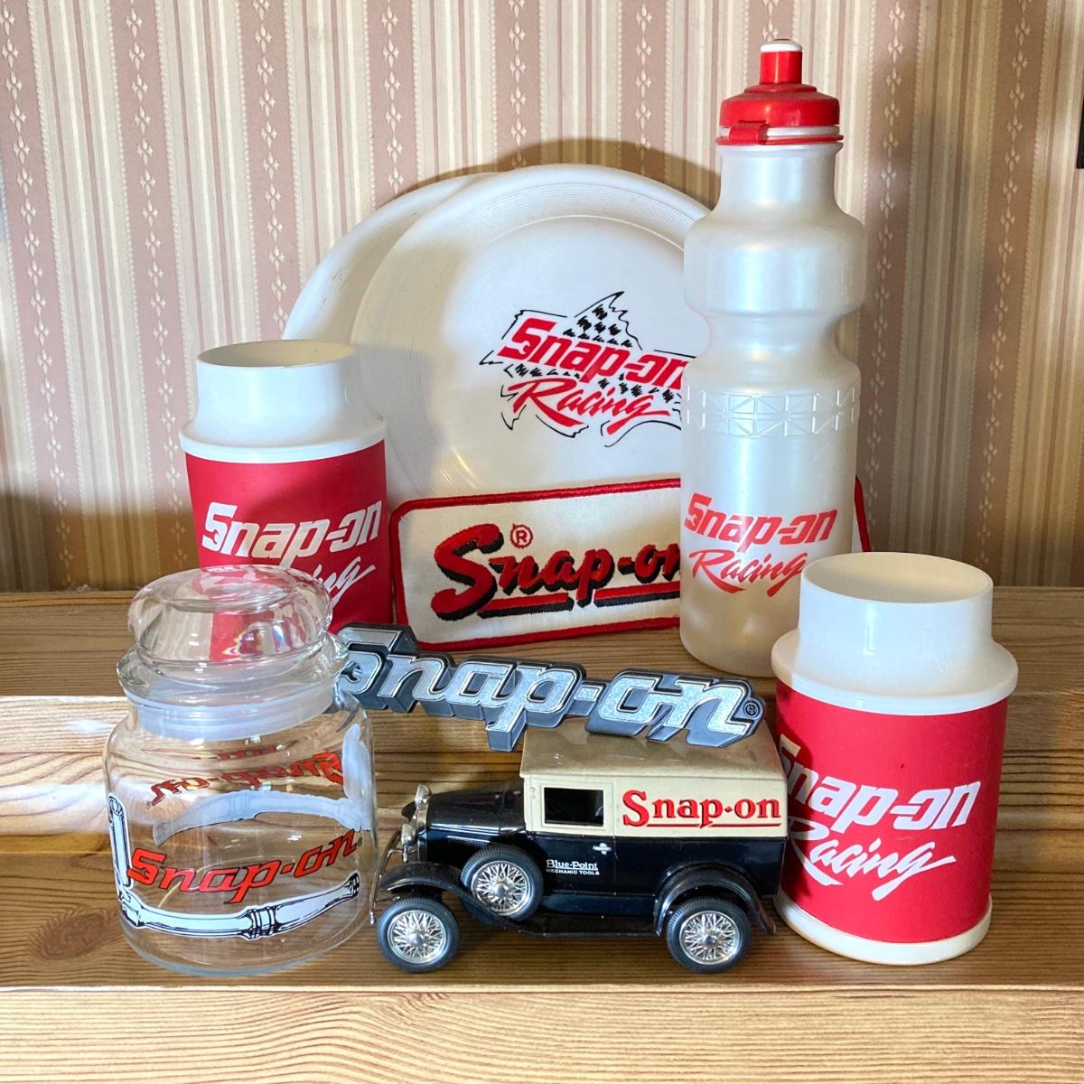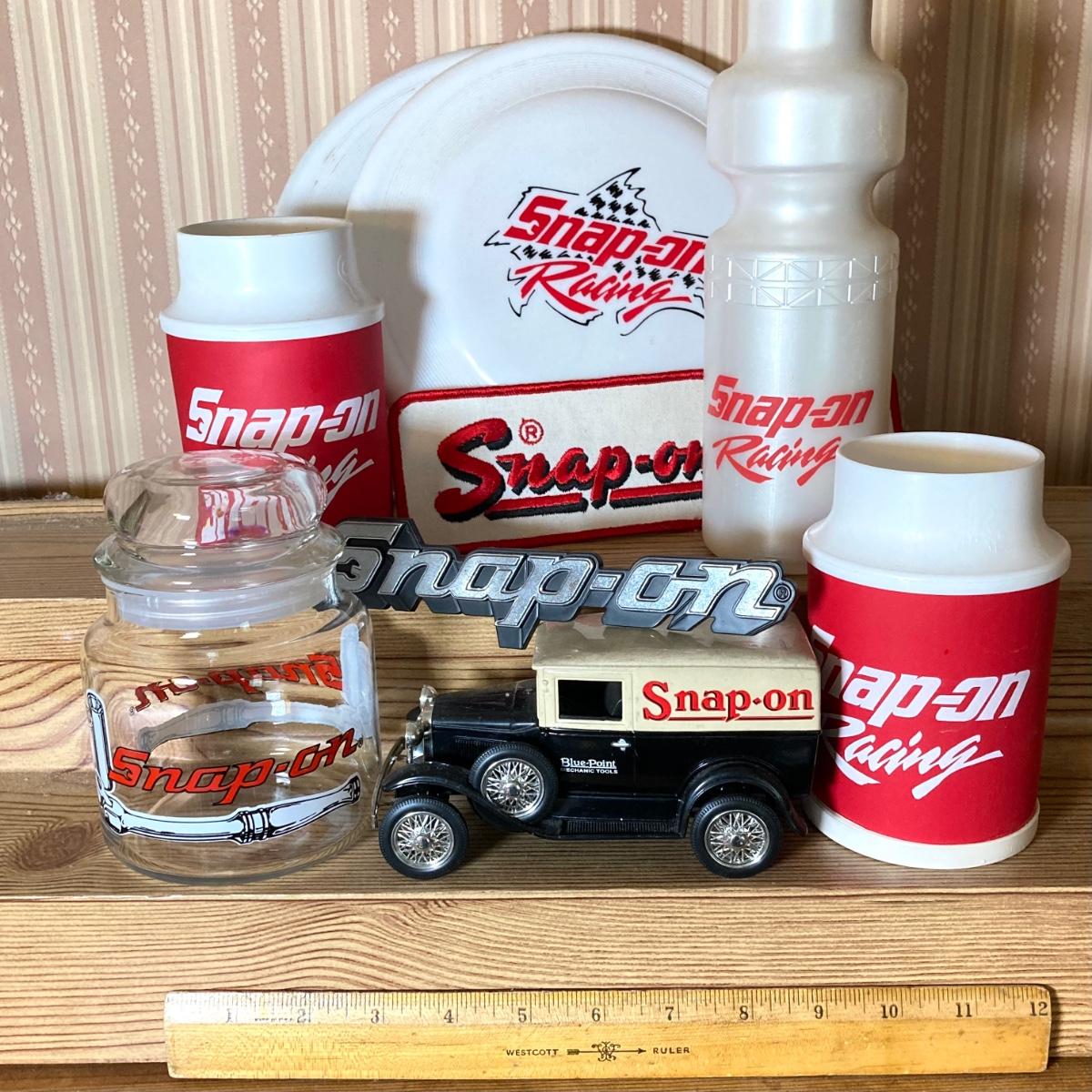 LOT 33: Snap-on Tools Drink Holders, Emblem / Badge, Glass Jar, Flying Discs, Liberty Classics Car Bank and More