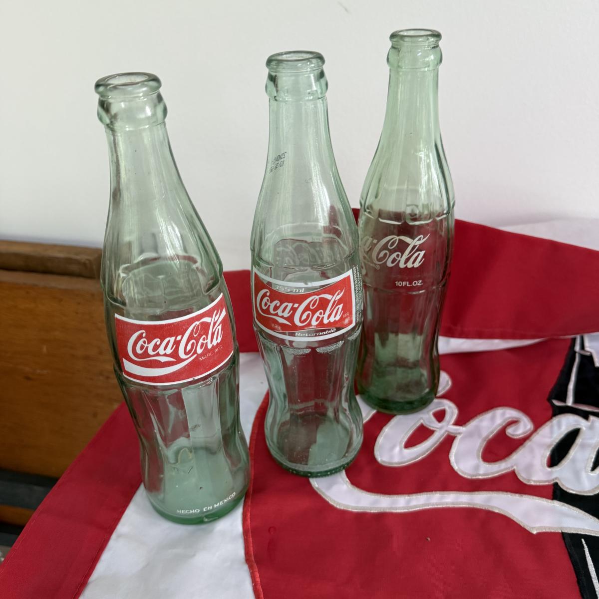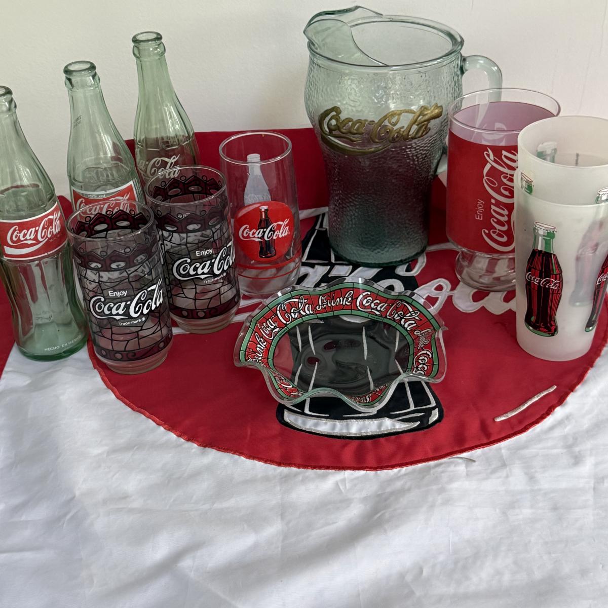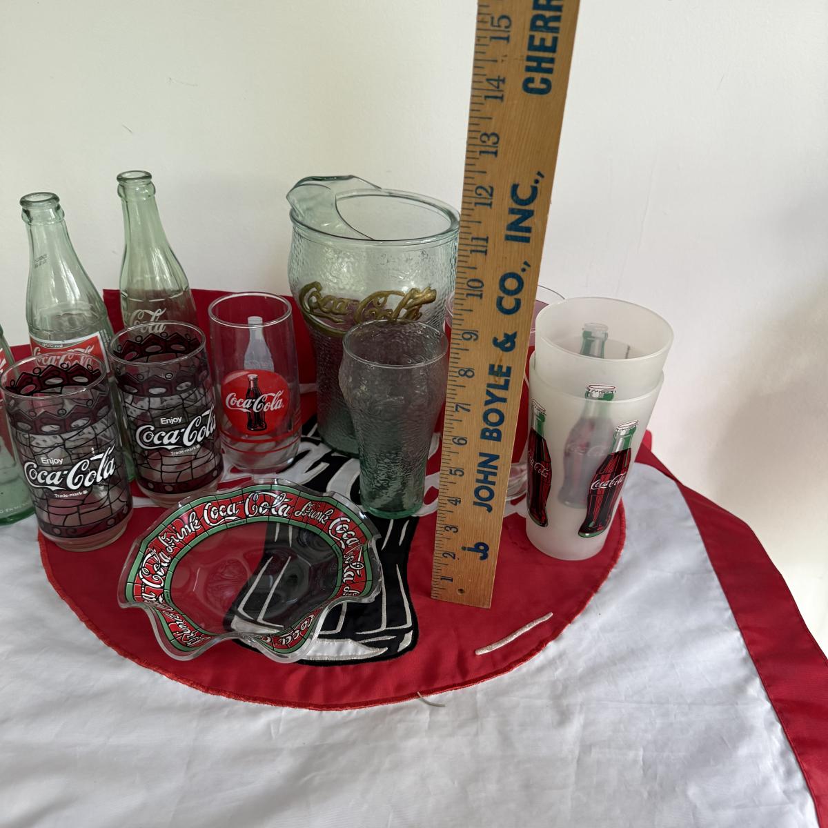 LOT 65: Coke/Coca Cola Glasses, Bottles, Pitcher, Dish and Flag