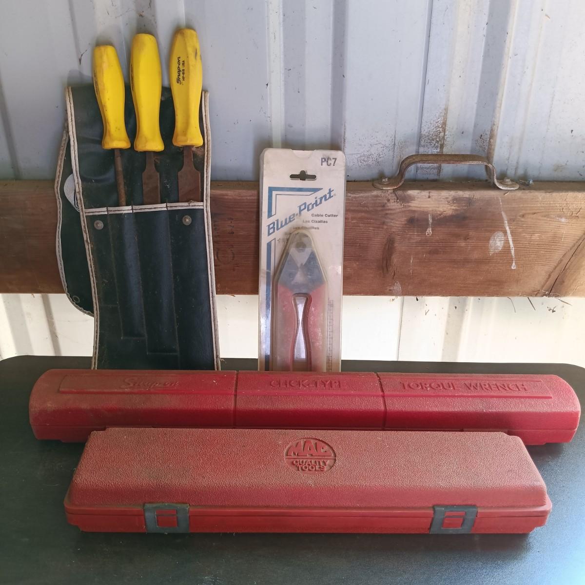 LOT 68: Snap-On TQFR250 Torque Wrench with MAC TWF675 Torque Wrench, Blue Point Cable Cutters & Snap-On File Set