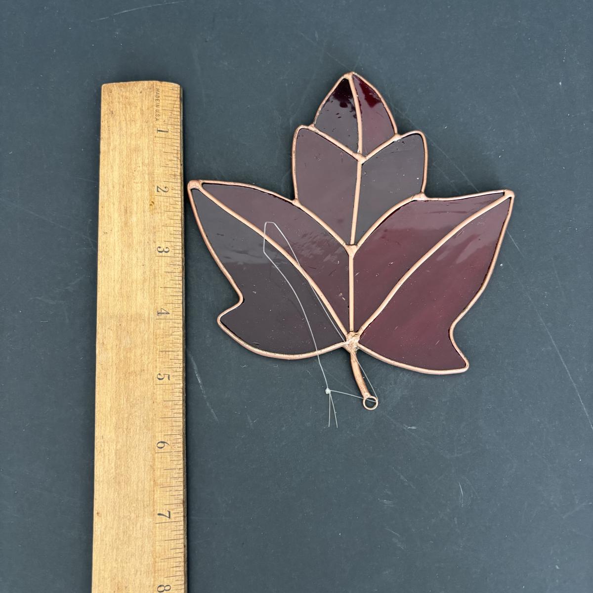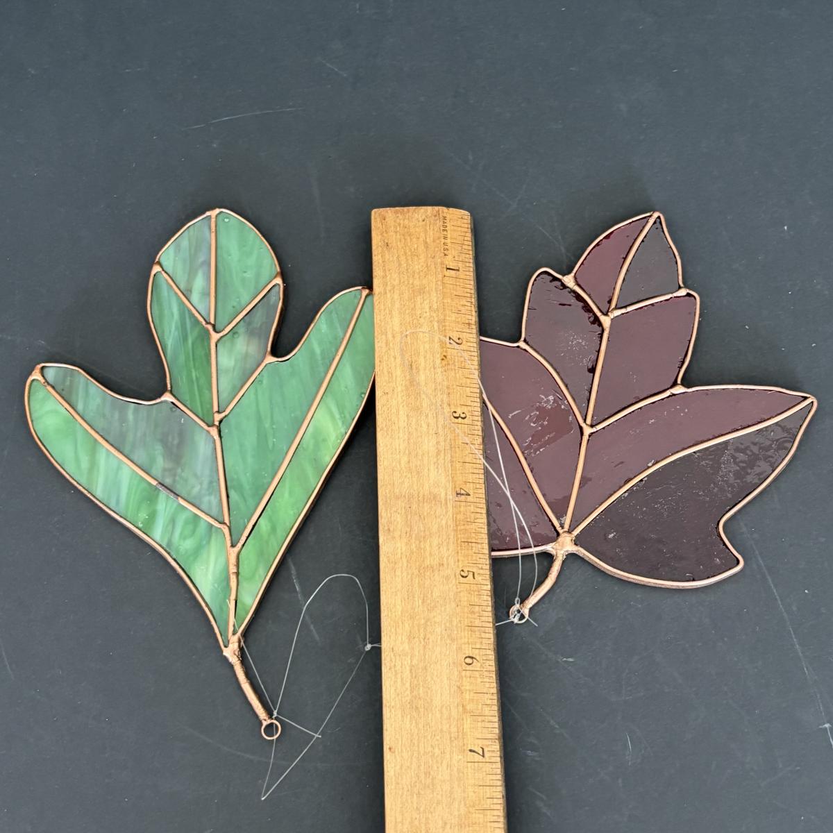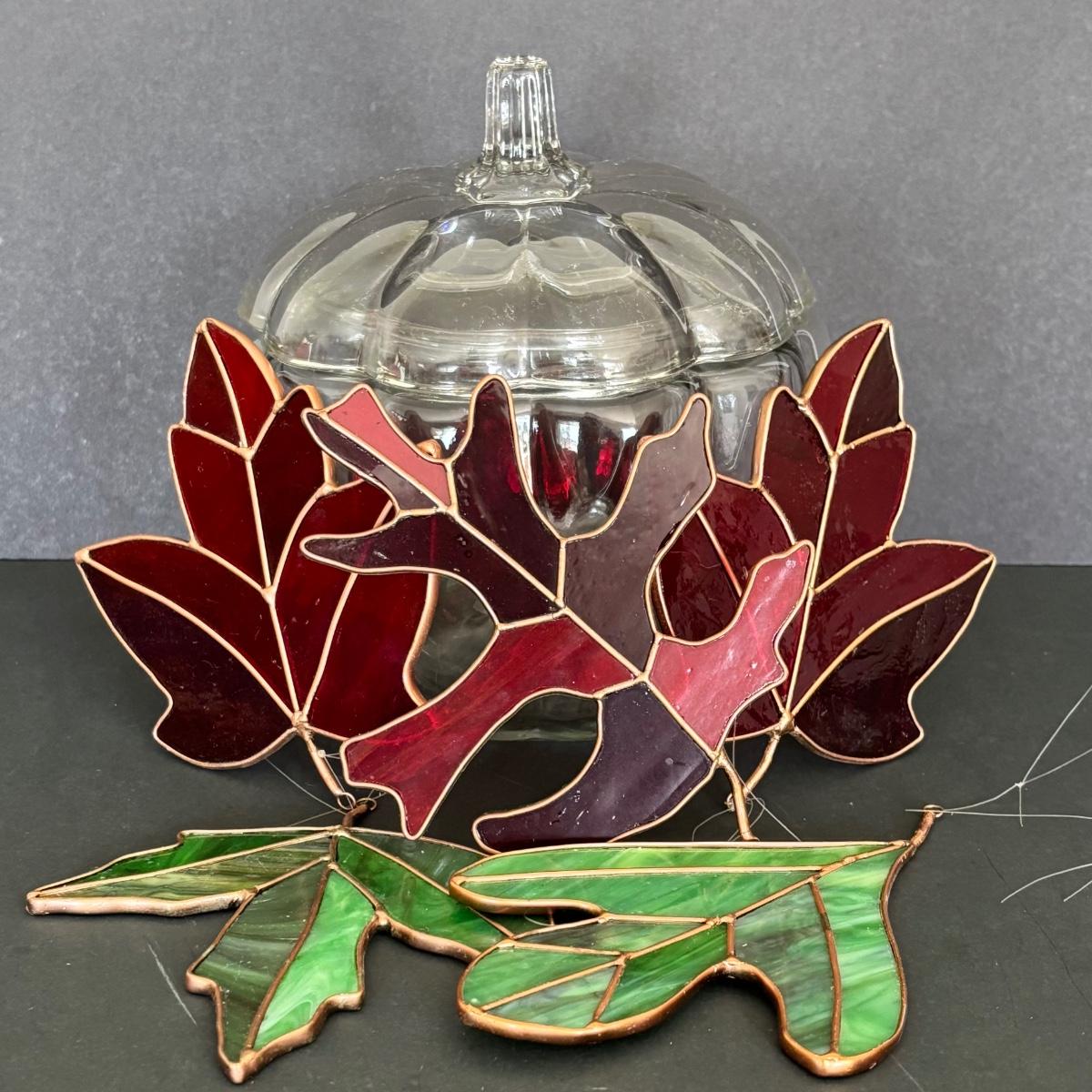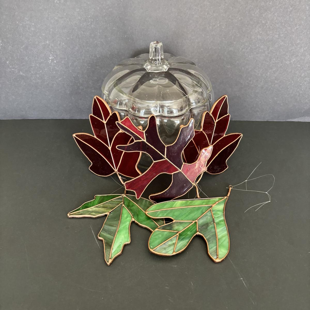 LOT 85: Set of 5 Stained Glass Leaves & Anchor Hocking Glass Pumpkin Jar