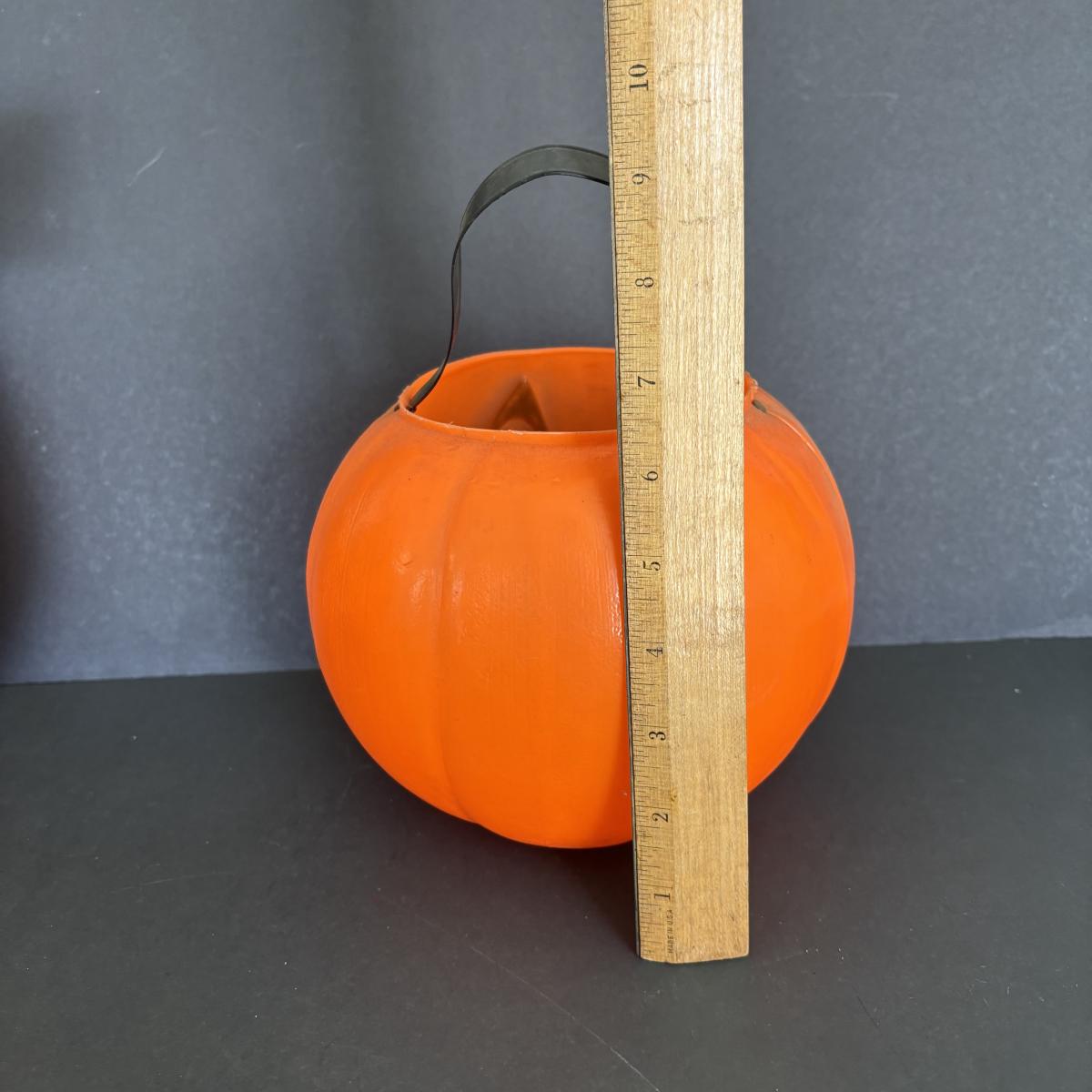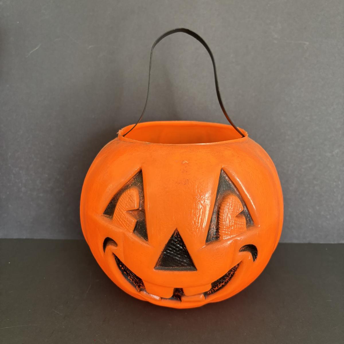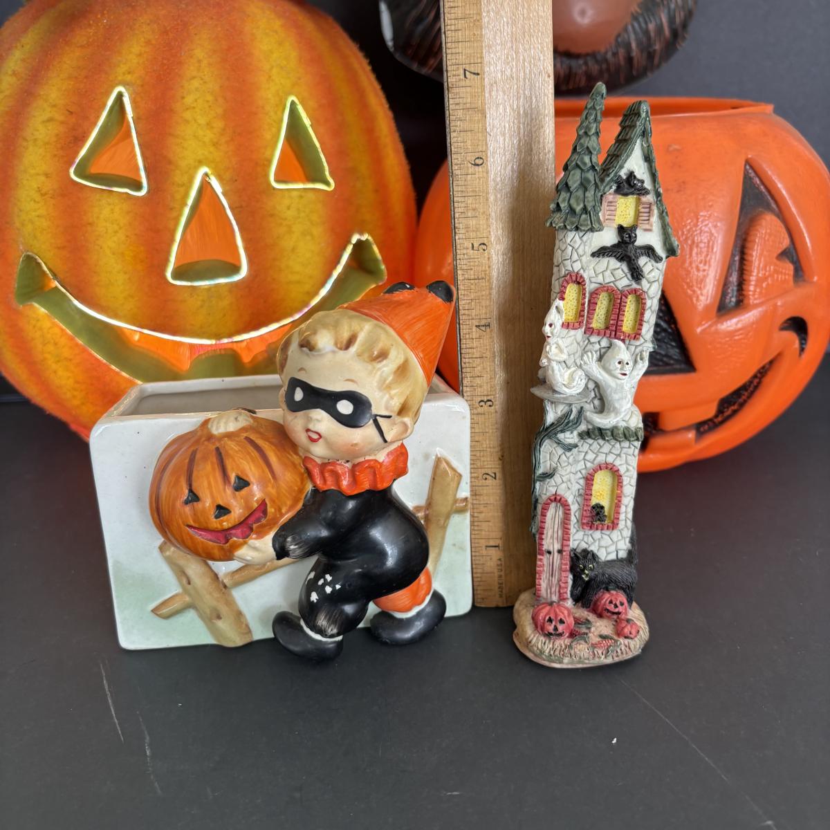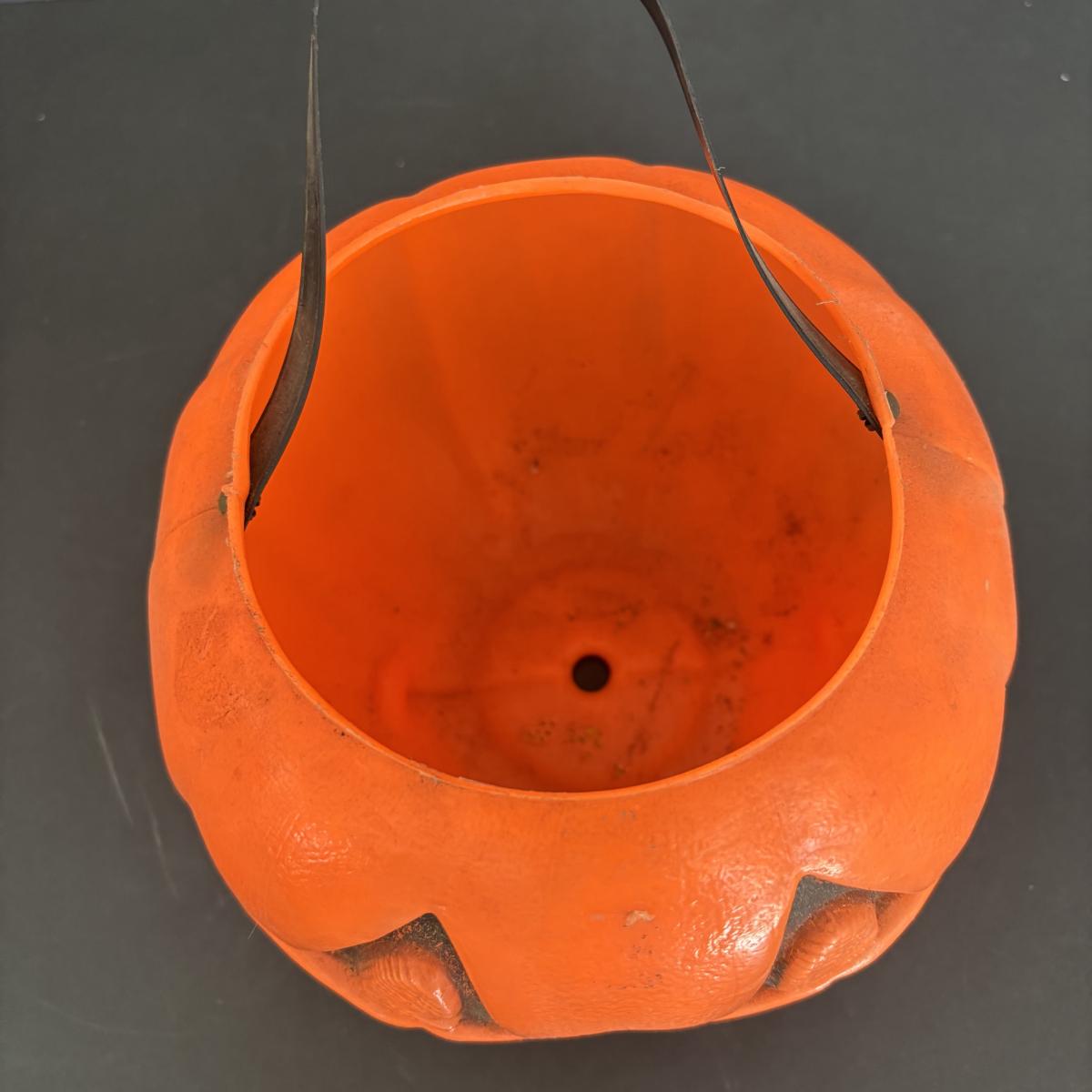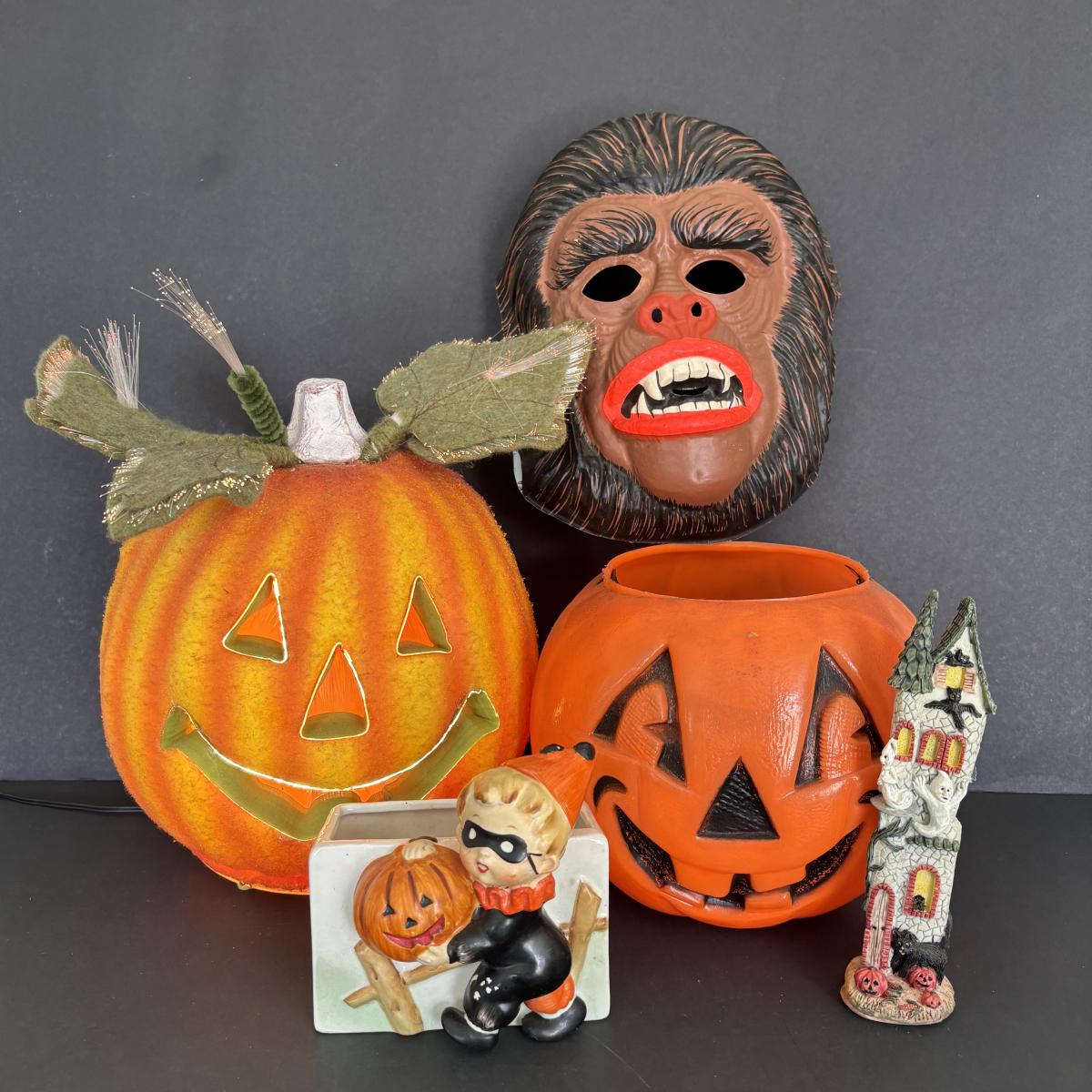 LOT 86: Vintage Halloween Pumpkin Candy Bucket, Relpo Planter & Gorilla Mask along with a 10" Fiber Optic Pumpkin ?