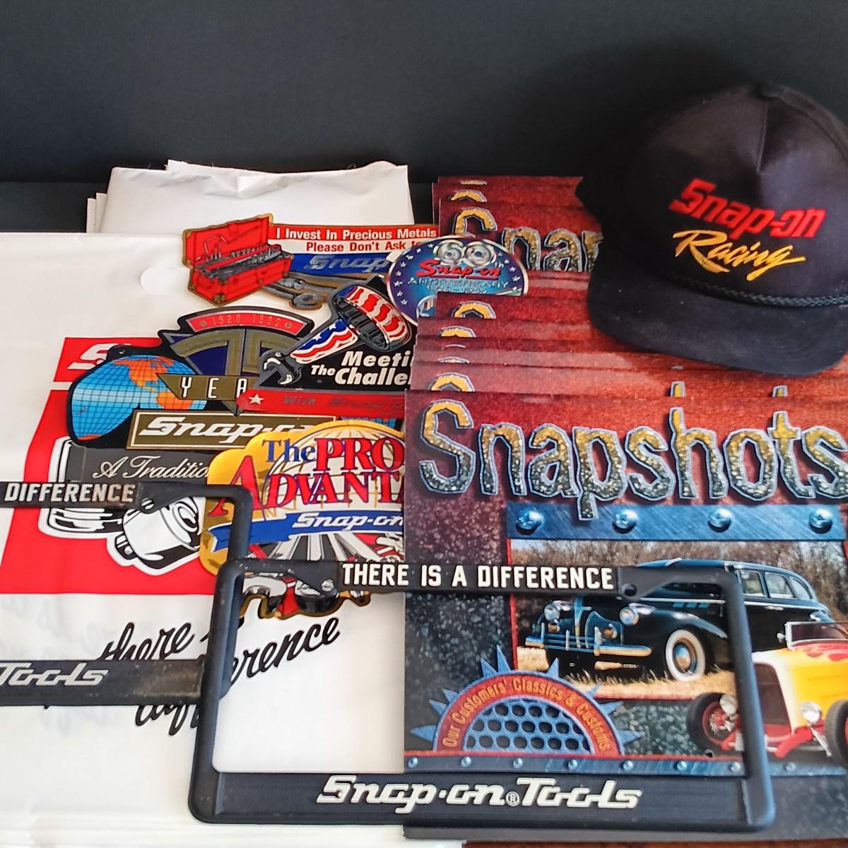 LOT 185: Snap-On License Plate Frames, Stickers, Plastic Bags, Snap-On Racing Cap & Snapshots 1997 Calendars