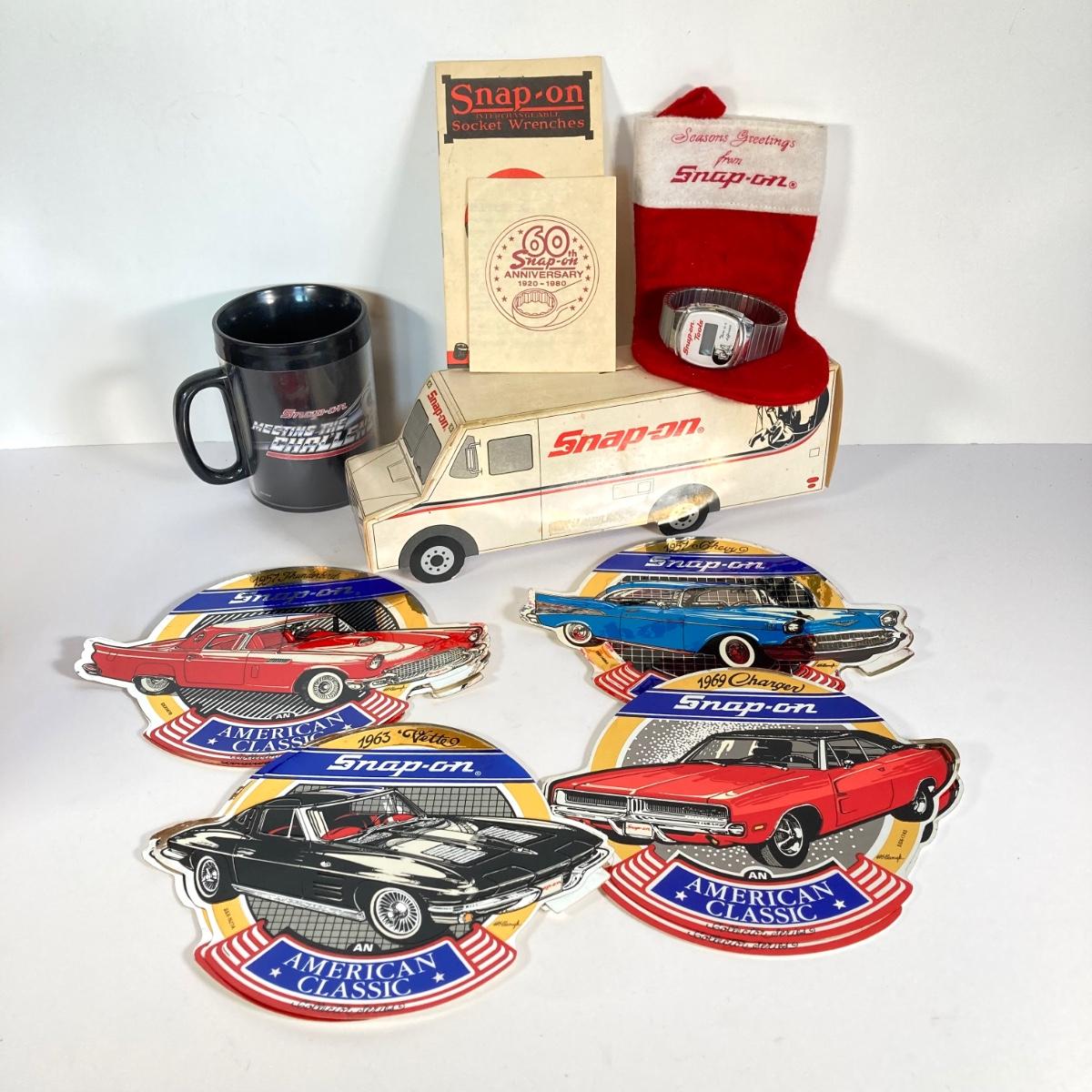 LOT 195: Snap-on Quality Work Socks in Cardboard Bank Truck, American Classics Decals, Digital Watch, Christmas Stocking and More