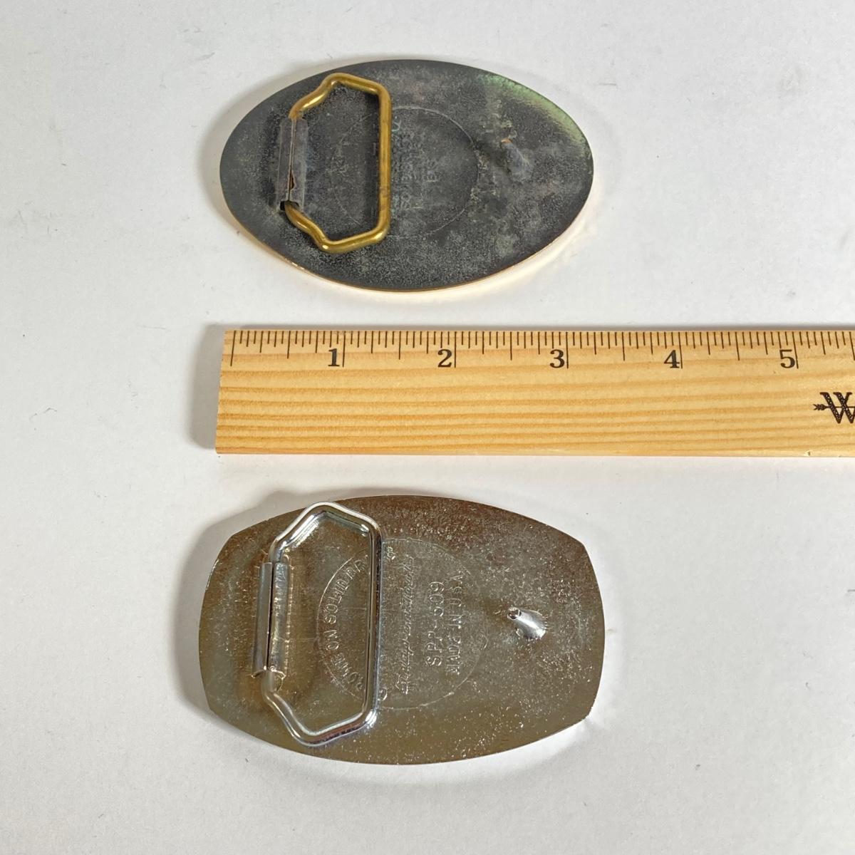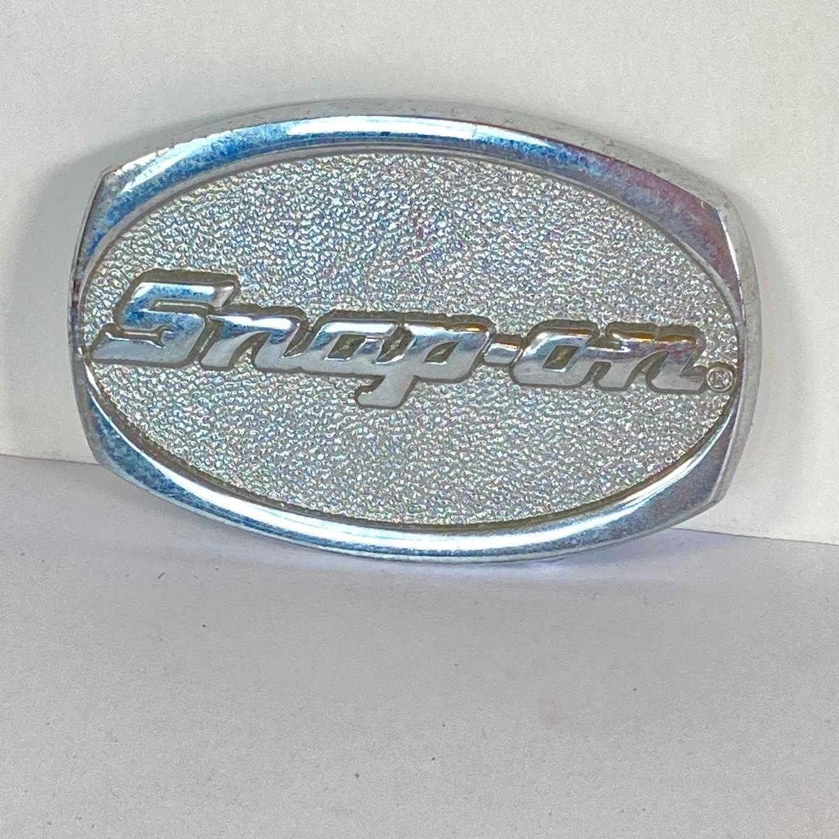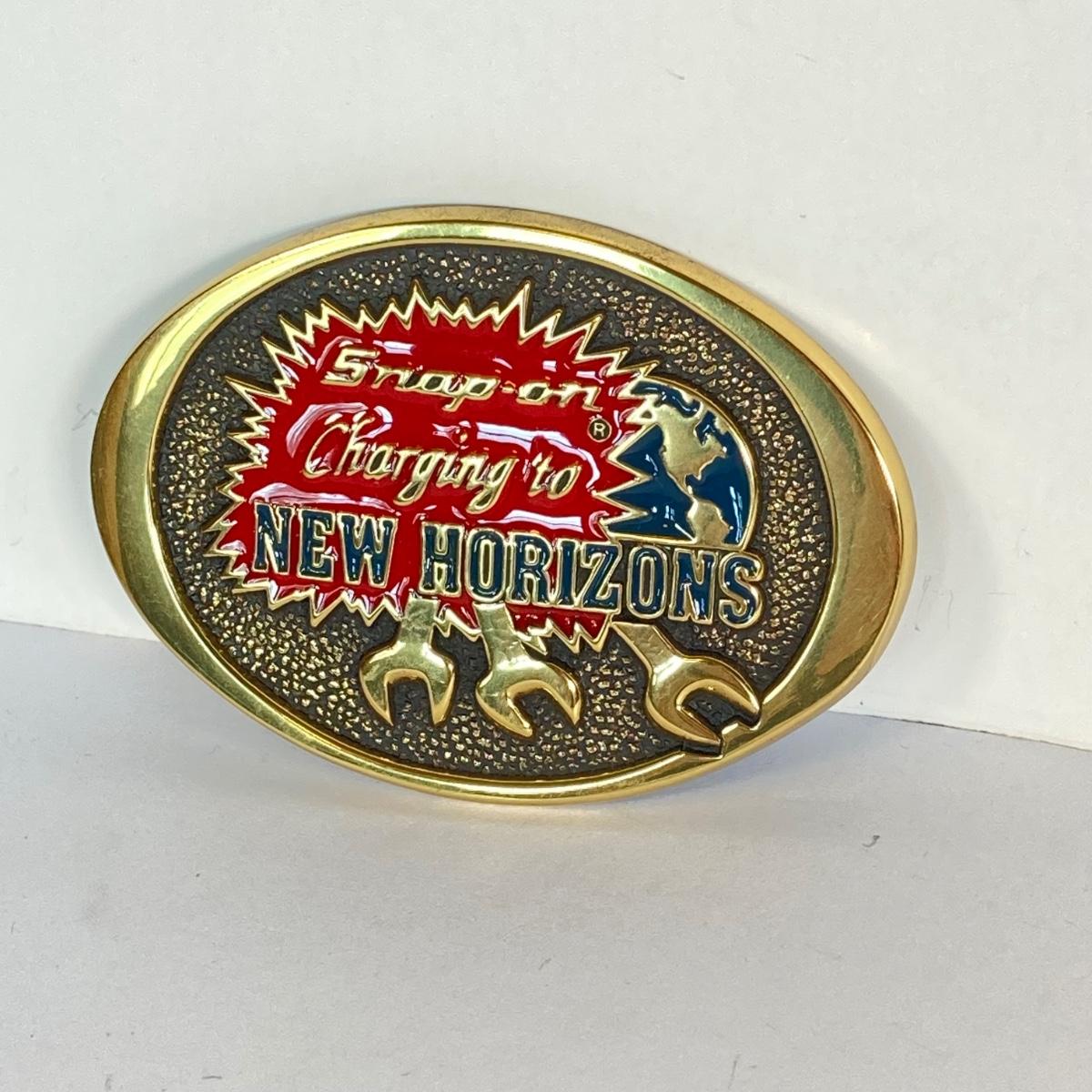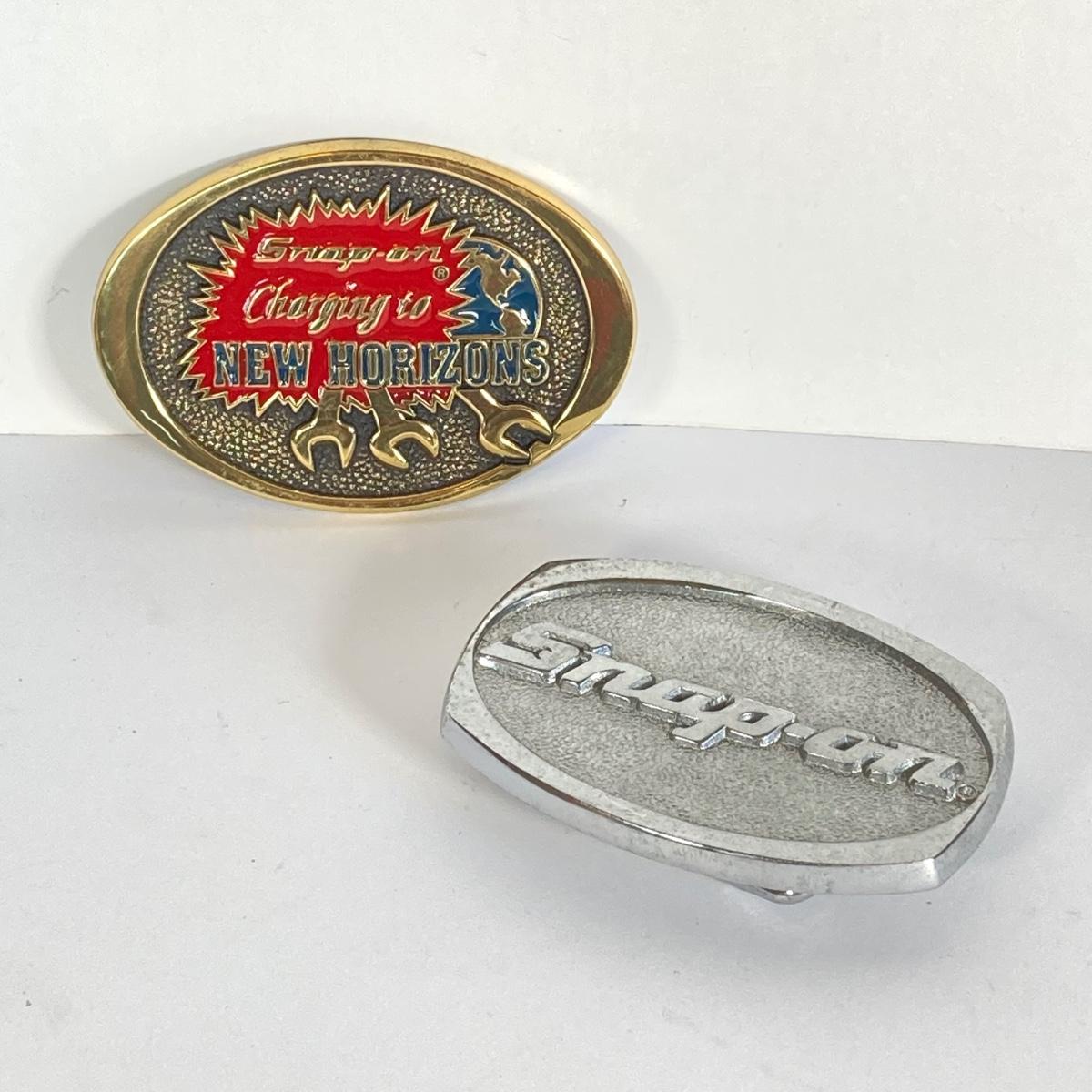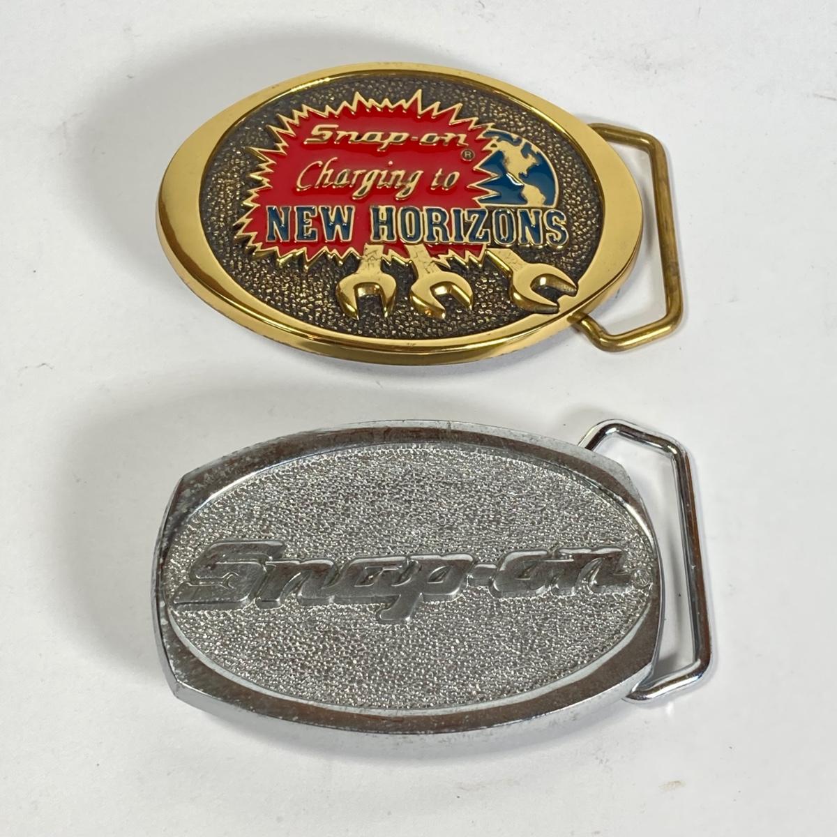 LOT 196: Pair of Snap-on Belt Buckles - Charging to New Horizons (Solid Brass) and Snap-on (Chrome on Solid Brass)