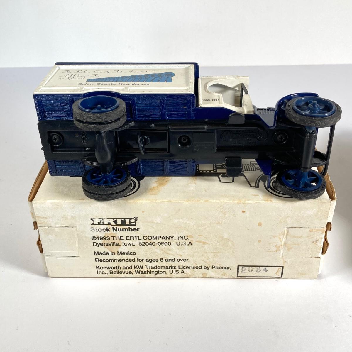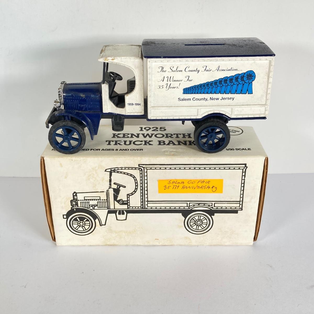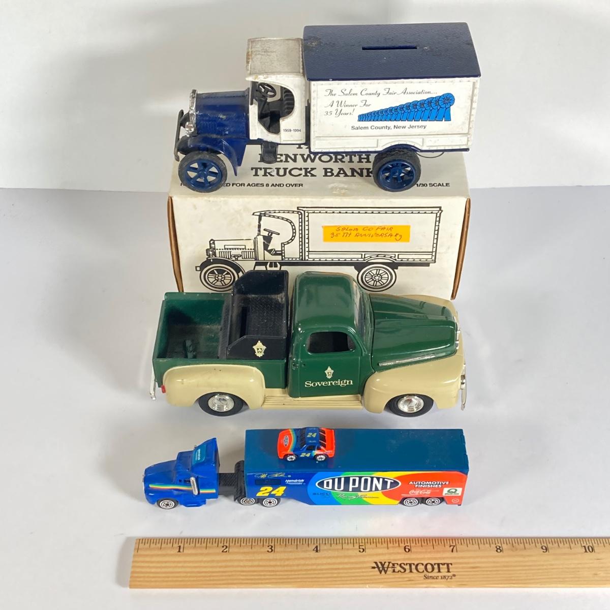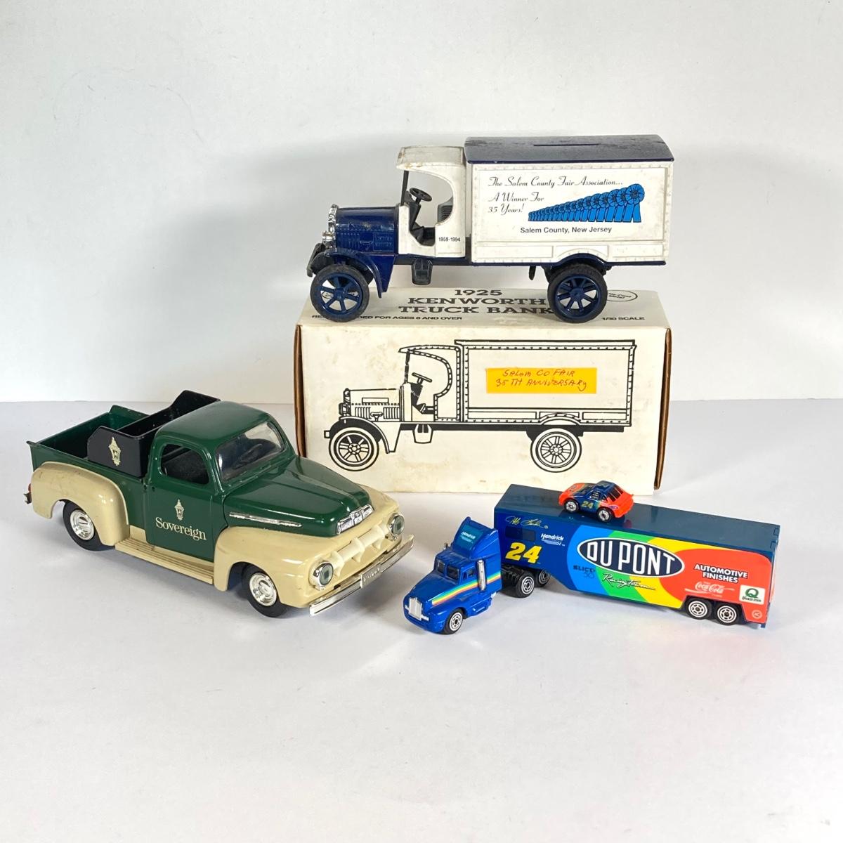 LOT 200: Salem County Fair Association Ertl 1925 Kenworth Toy Truck Bank, Sovereign Toy Truck and Miniature Dupont #24 Tractor Trailer with Micro Mini Car