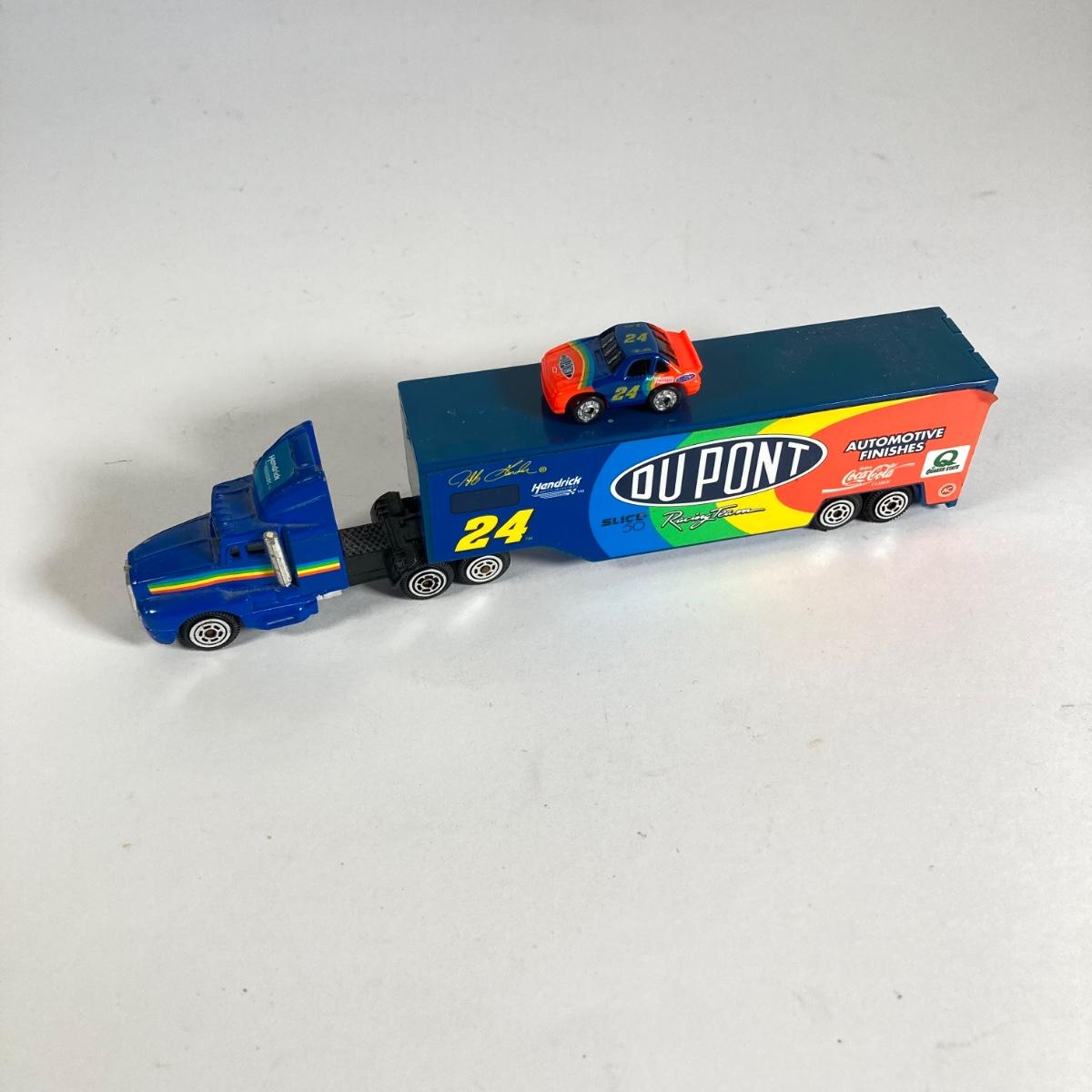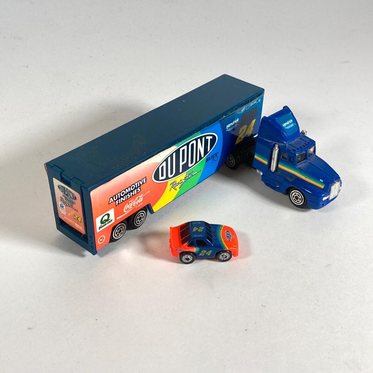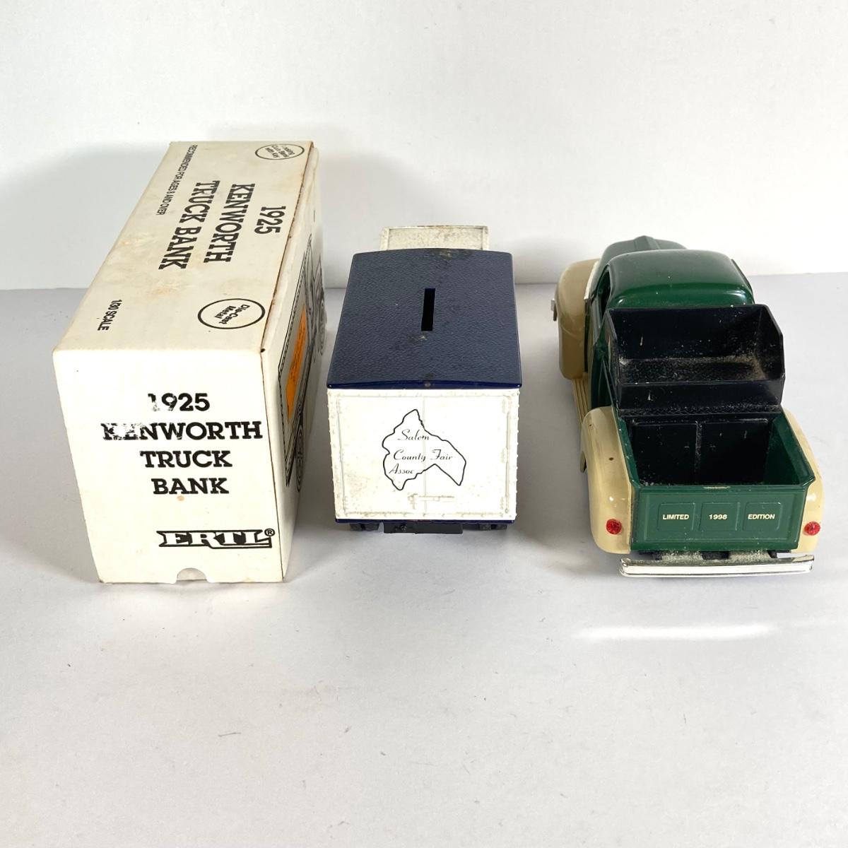 LOT 200: Salem County Fair Association Ertl 1925 Kenworth Toy Truck Bank, Sovereign Toy Truck and Miniature Dupont #24 Tractor Trailer with Micro Mini Car