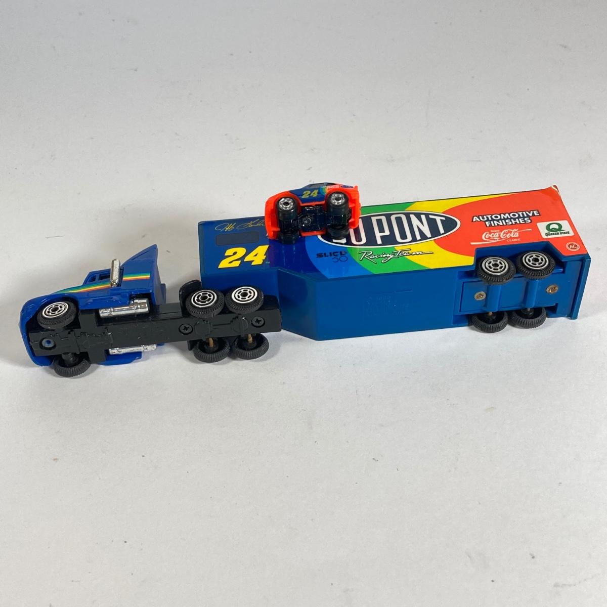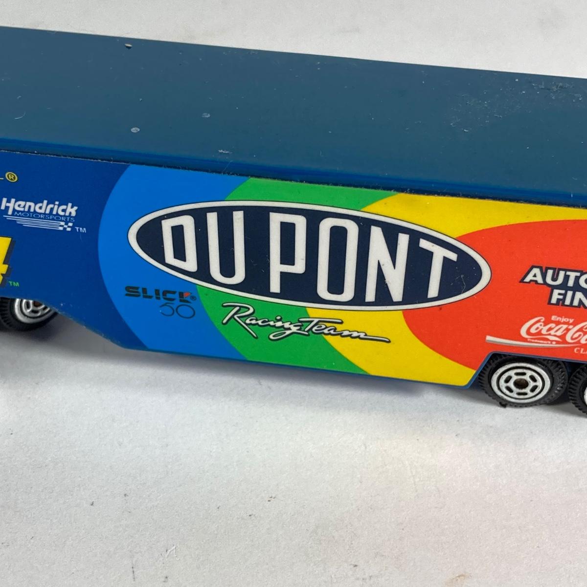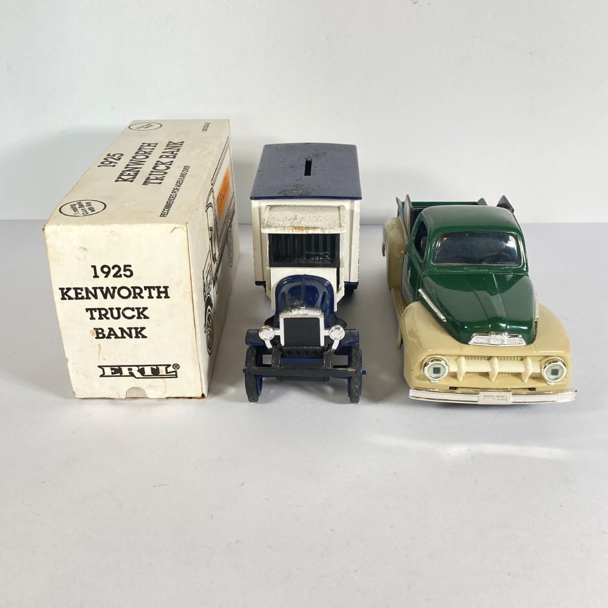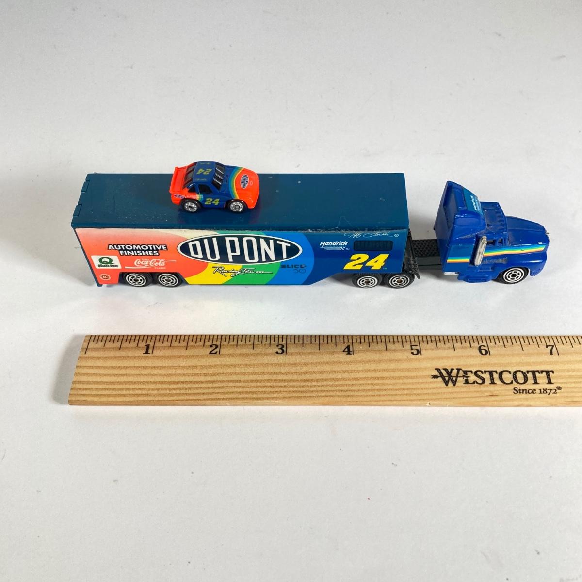 LOT 200: Salem County Fair Association Ertl 1925 Kenworth Toy Truck Bank, Sovereign Toy Truck and Miniature Dupont #24 Tractor Trailer with Micro Mini Car