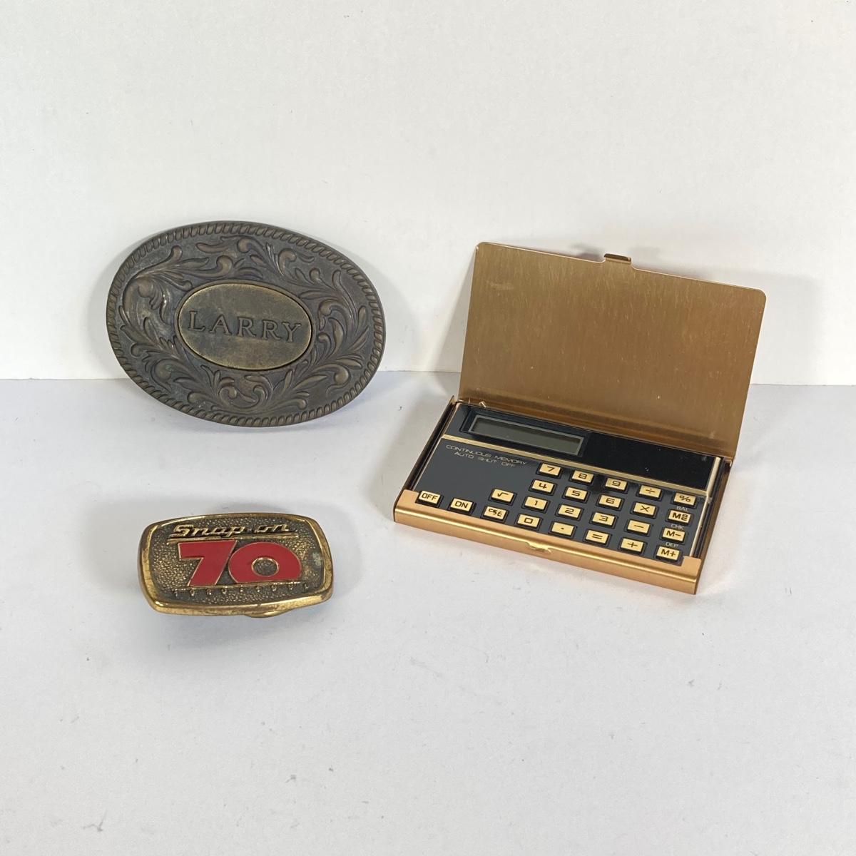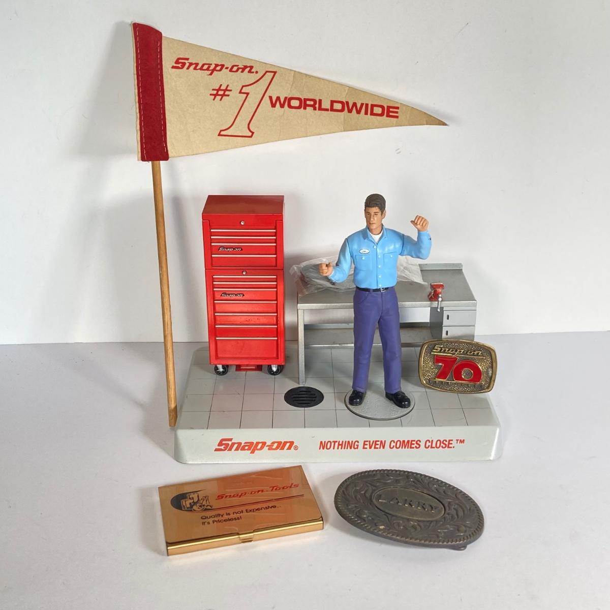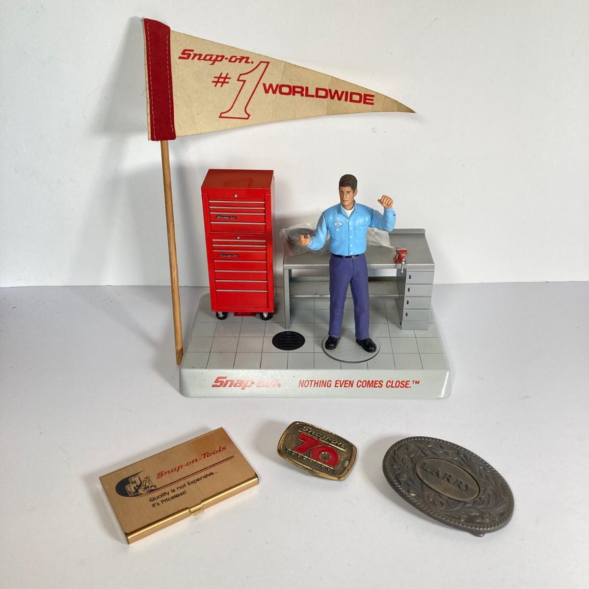 LOT 201: Snap-on Joe's Service "Nothing Even Comes Close" Motion Bank, #1 Worldwide Pennant, Business Card Holder / Calculator and Belt Buckles