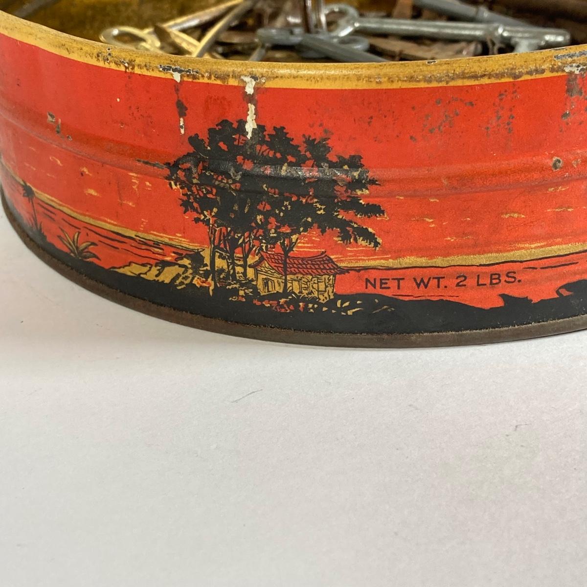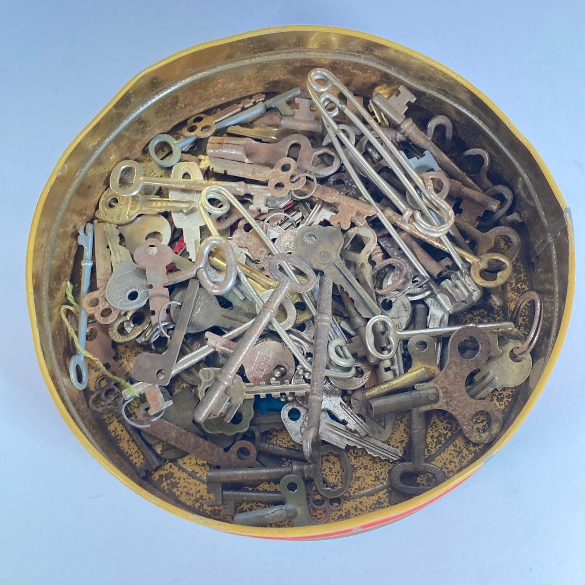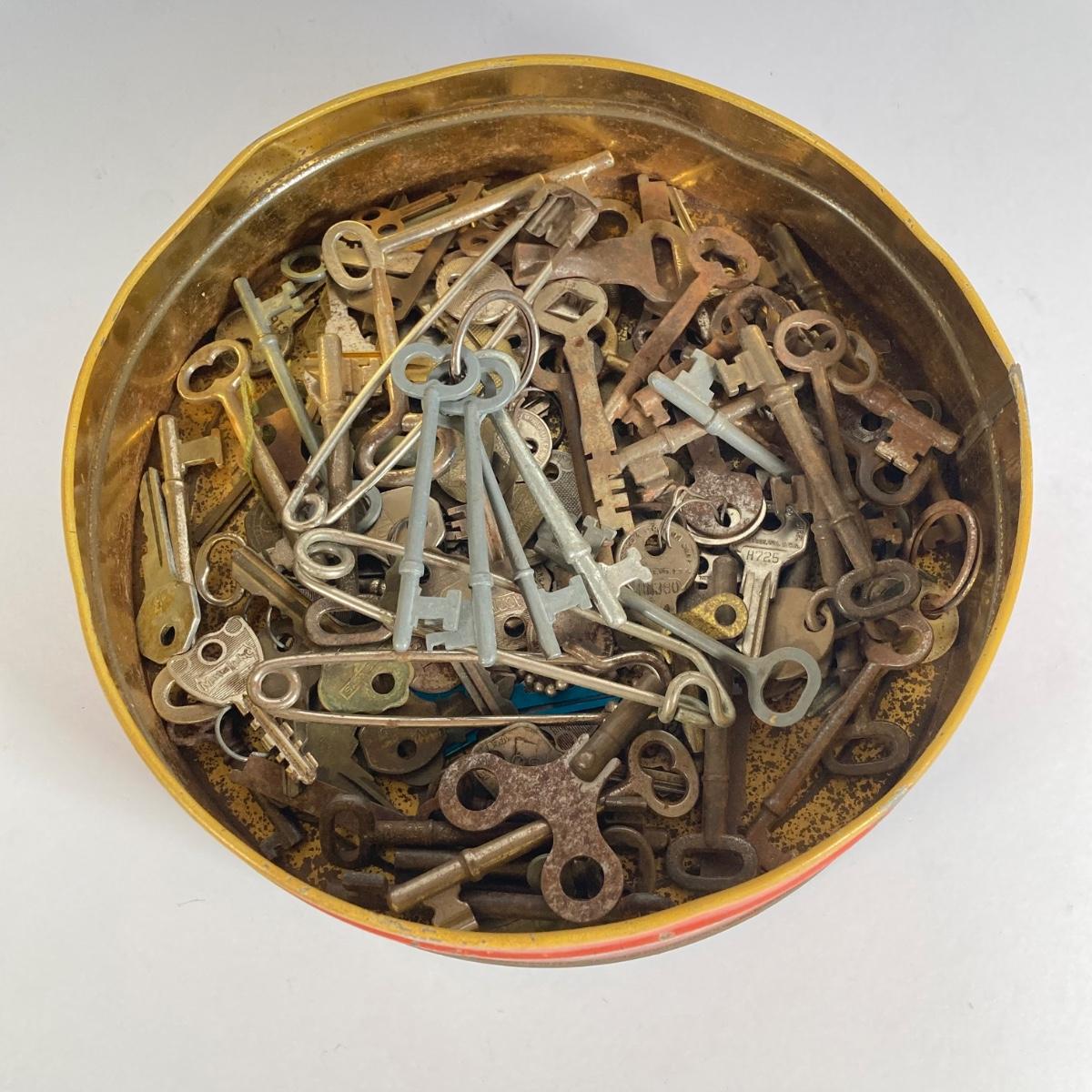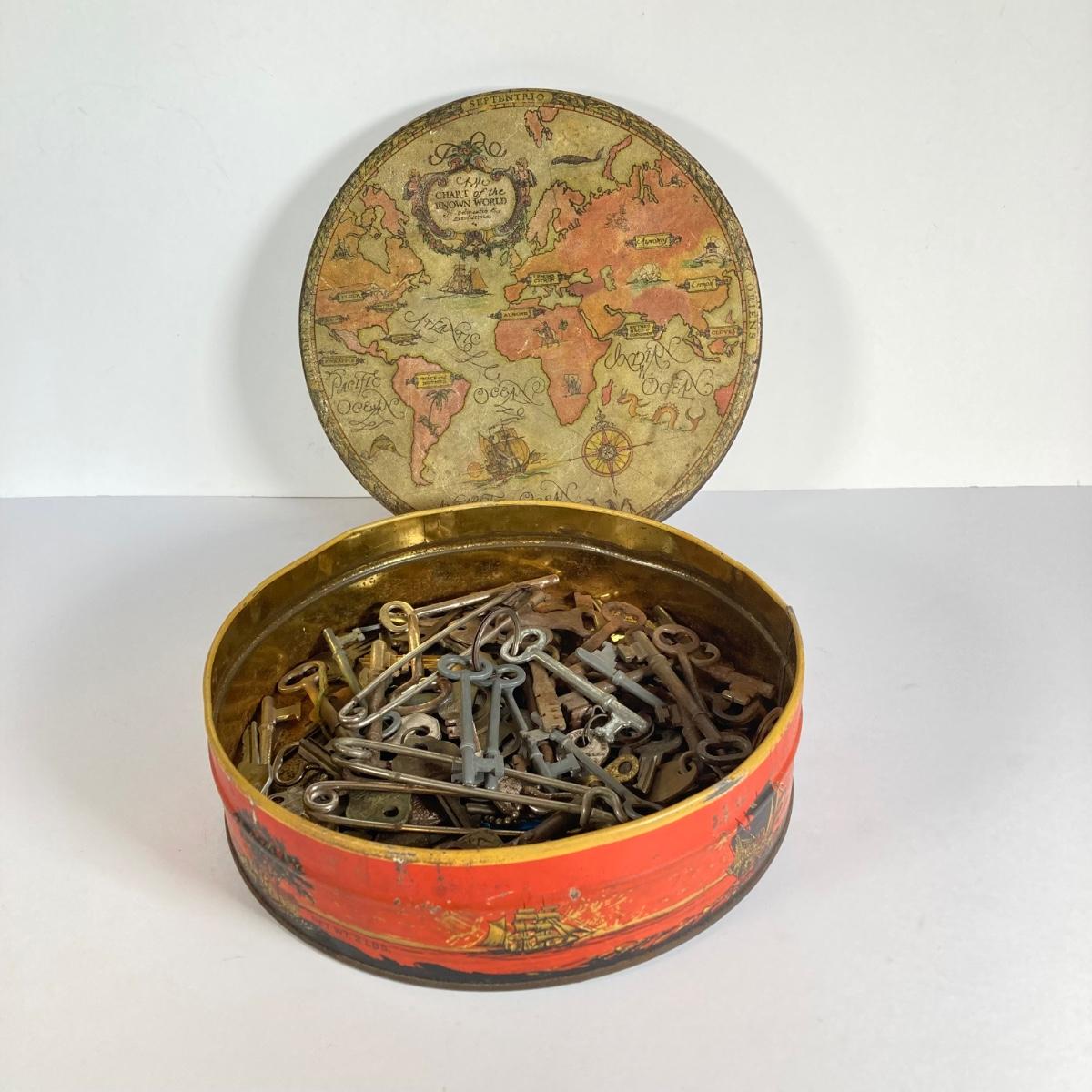 LOT 207: Antique / Vintage Key Collection in Chart of the Unknown World Tin