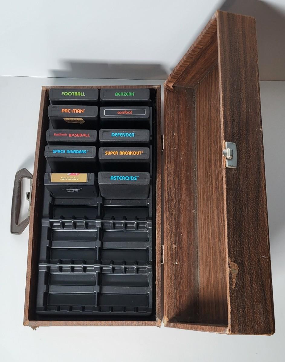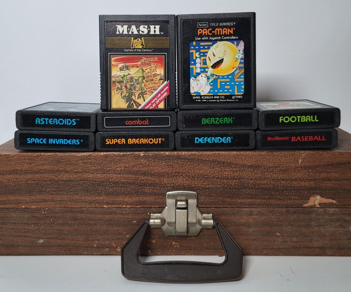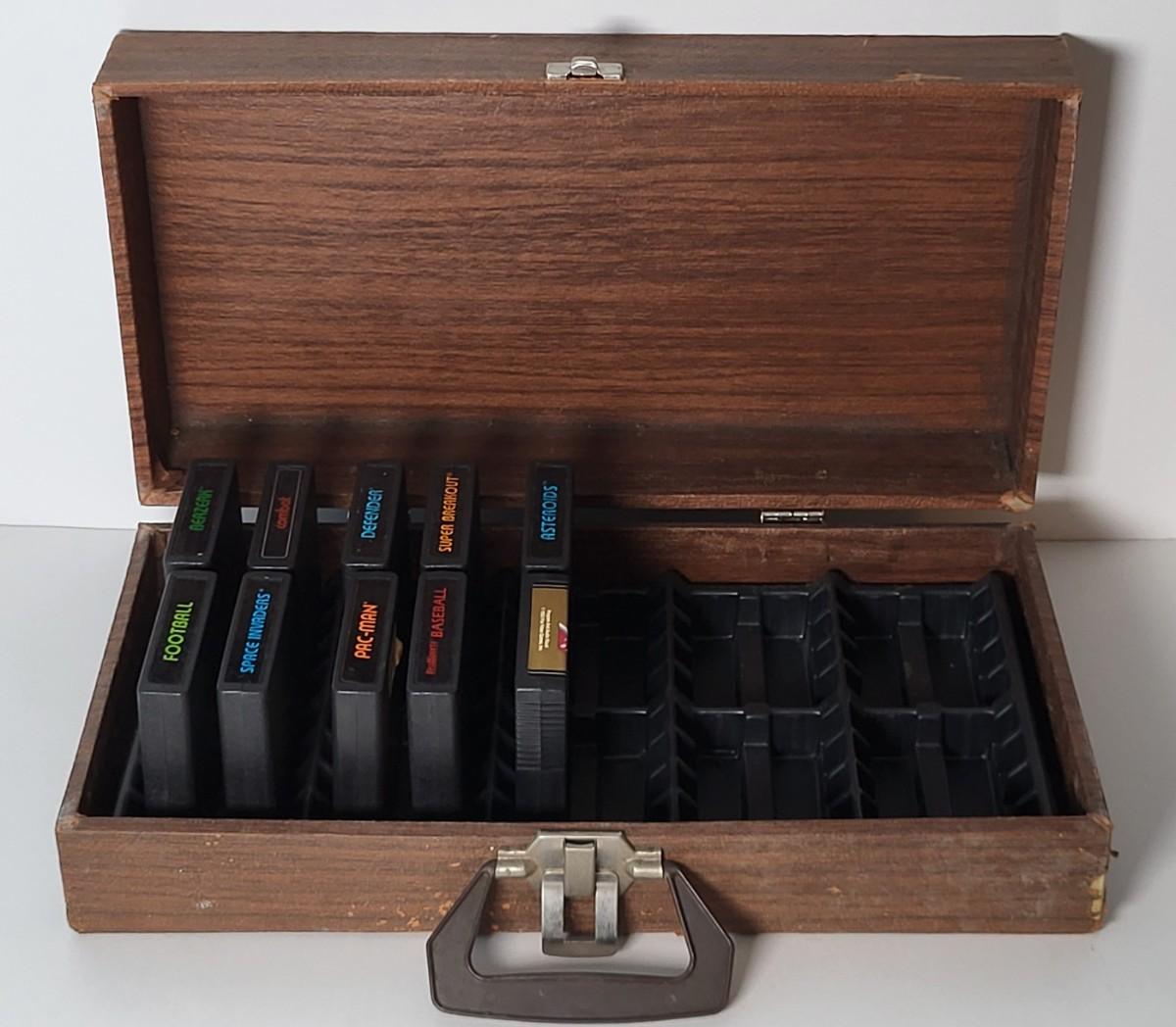 LOT 244: Vintage Wooden Case of Atari Video Game Cartridges Featuring Pac-Man, Space Invaders and More