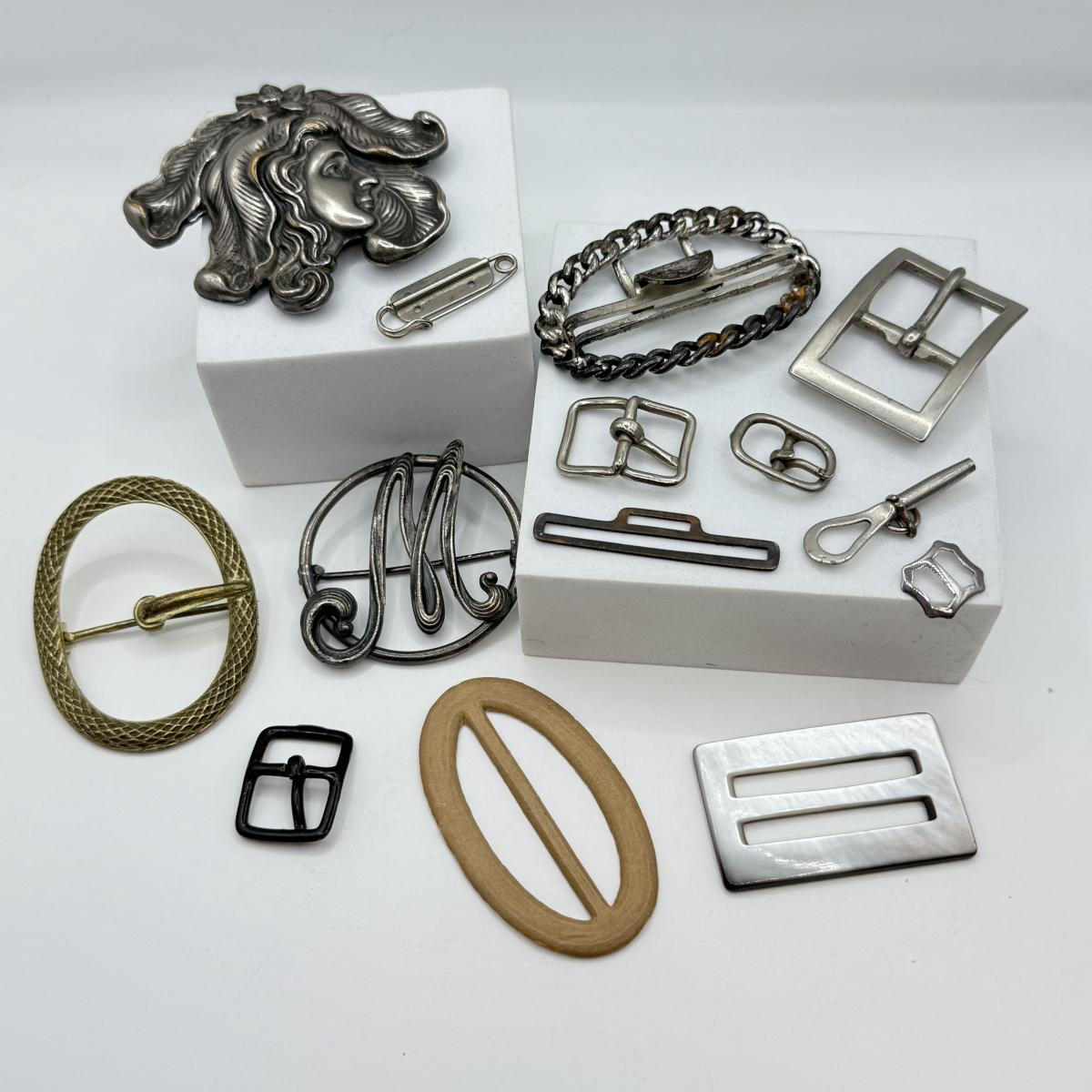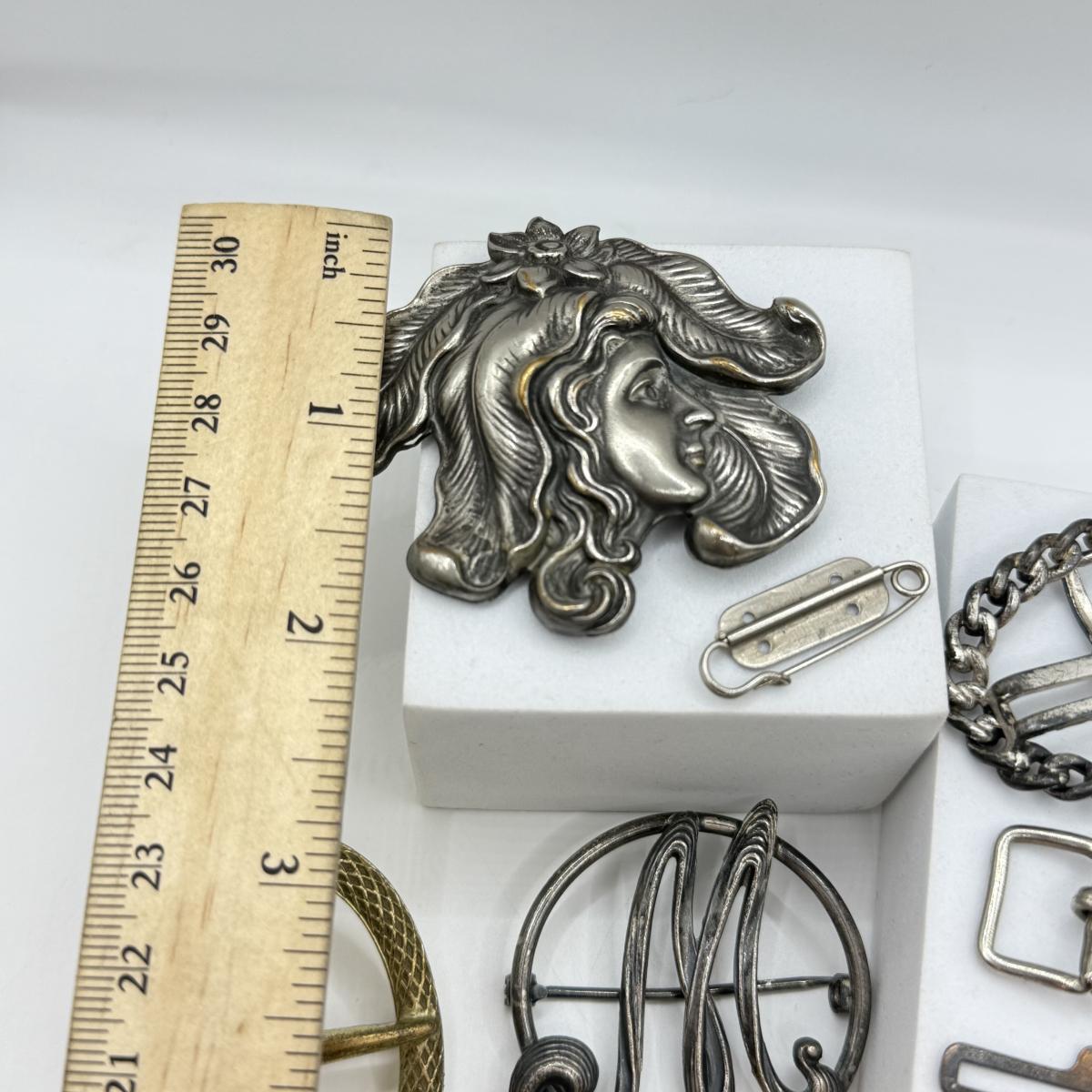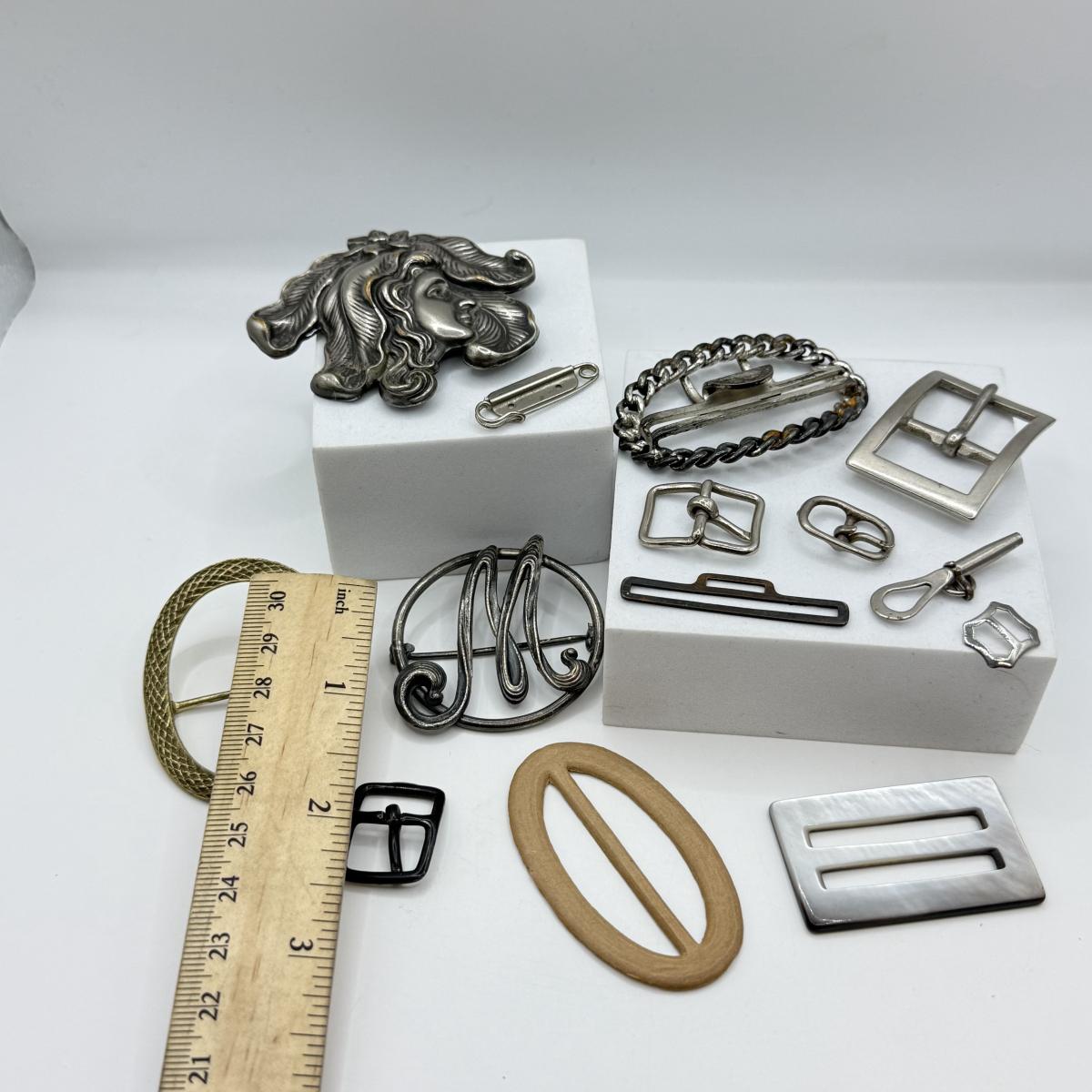 LOT 15: Antique Silvertone Brooches w/ Collection of Various Buckles