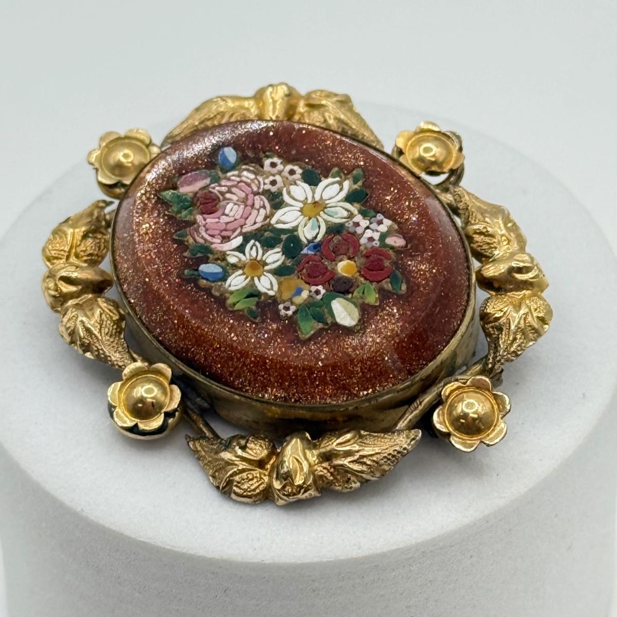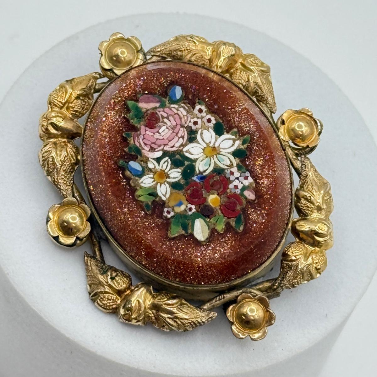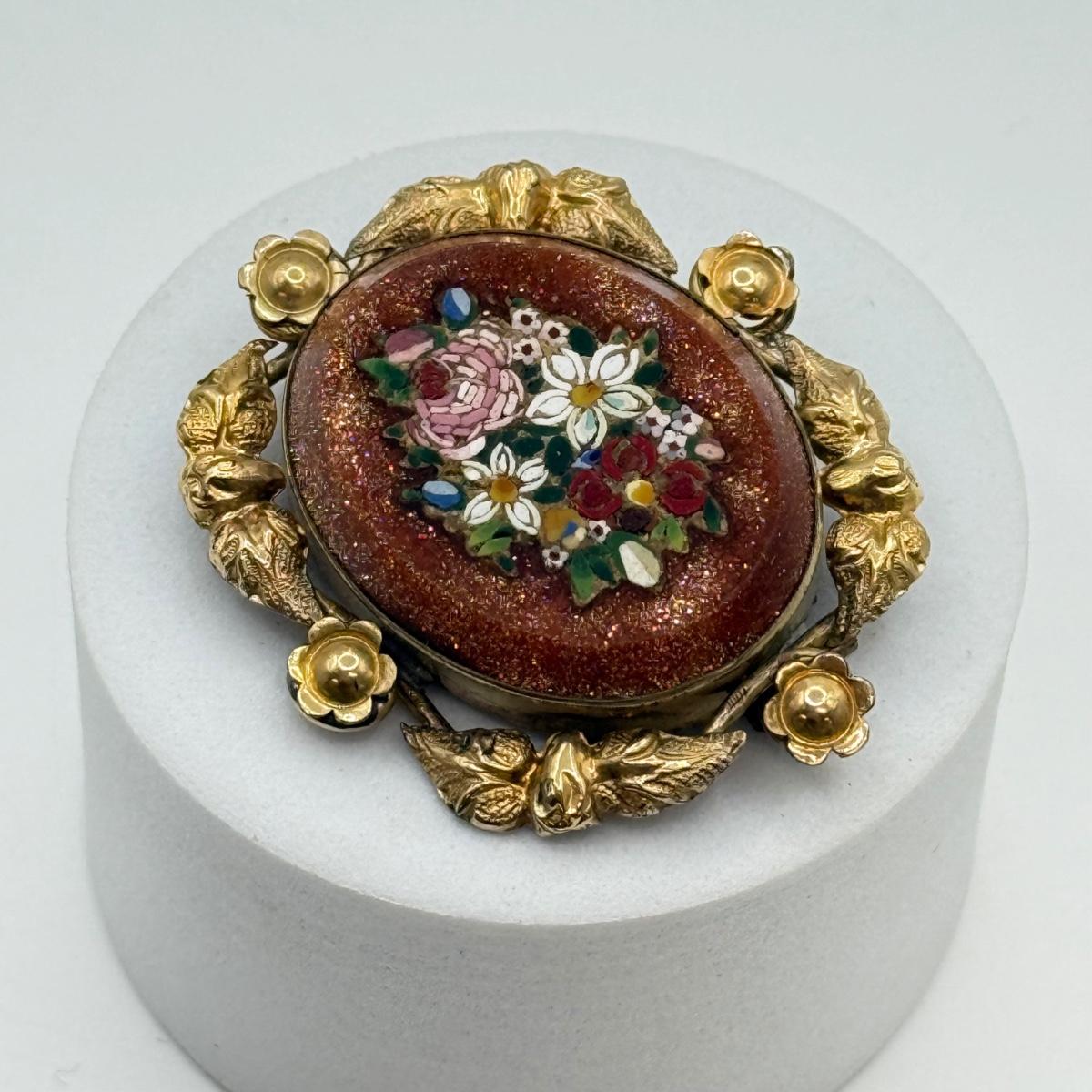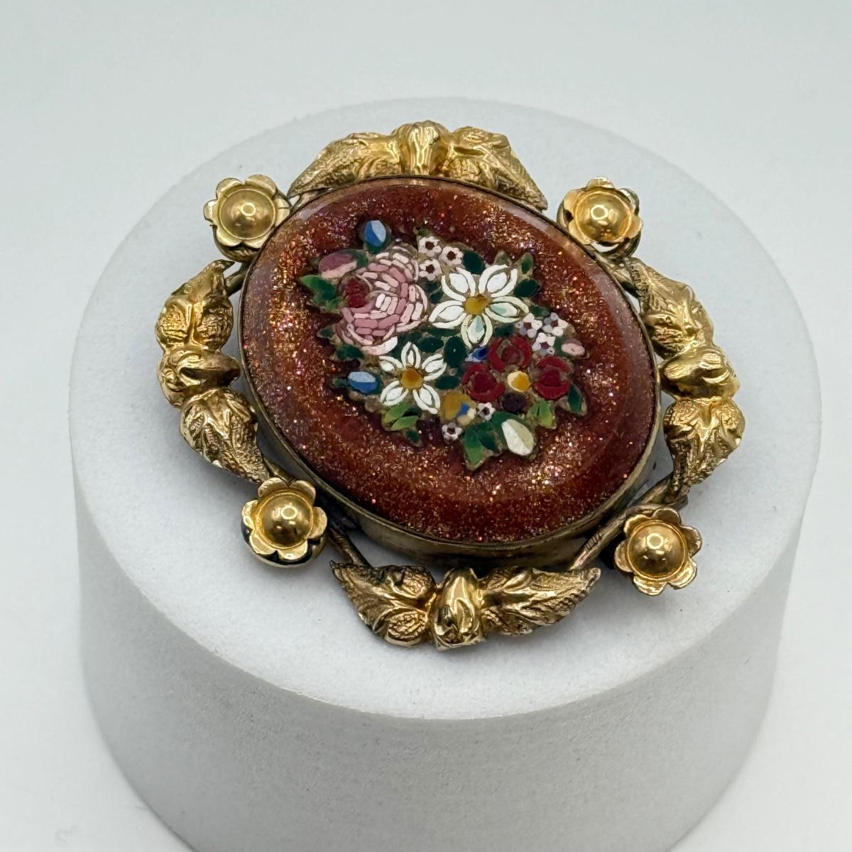 LOT 31: Antique Micro Mosaic Pierre Dura Goldstone Gold Filled Floral Brooch