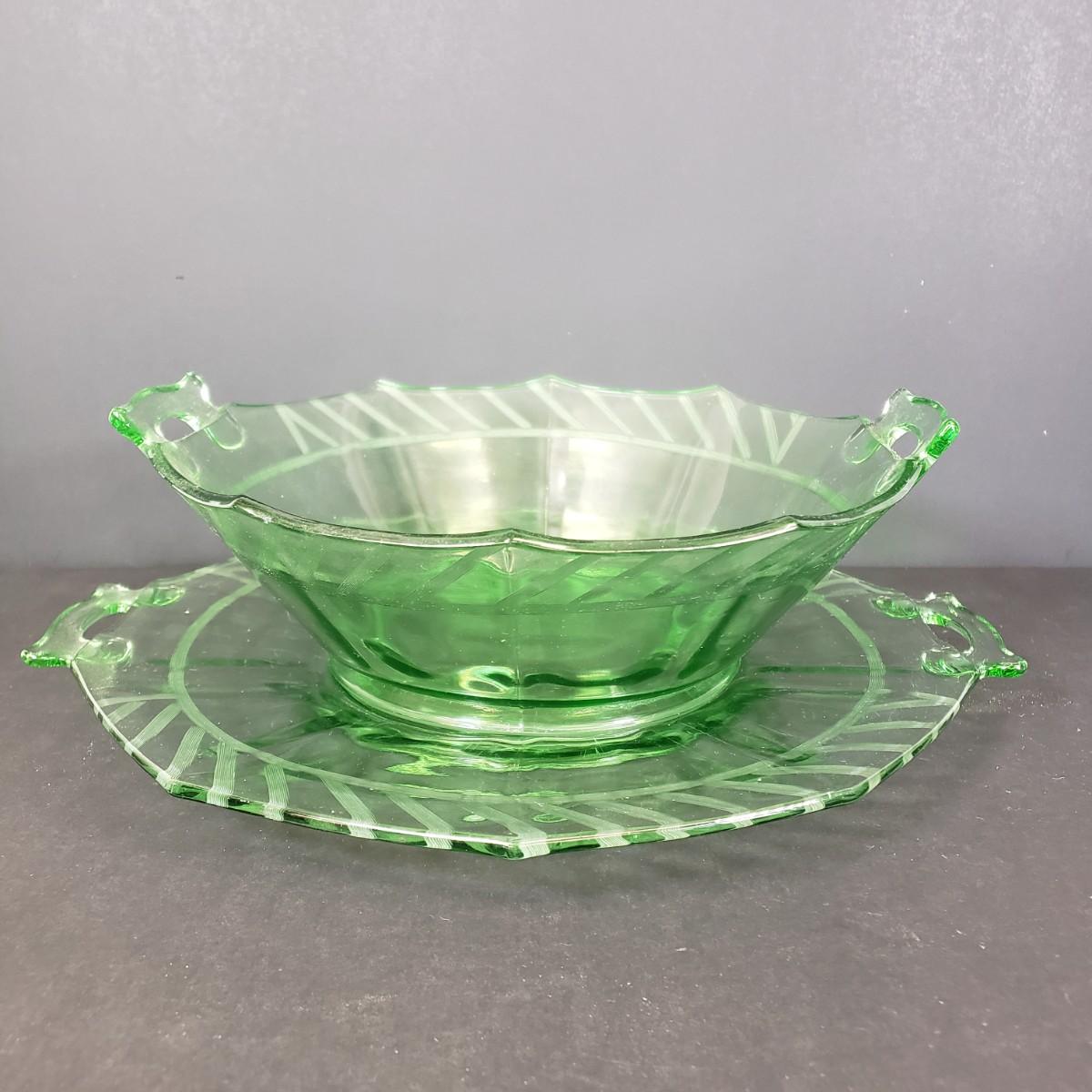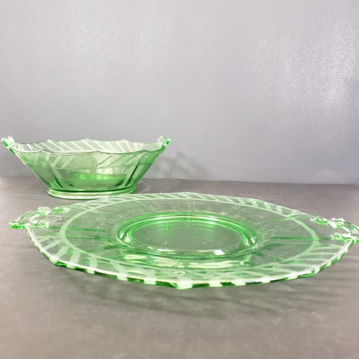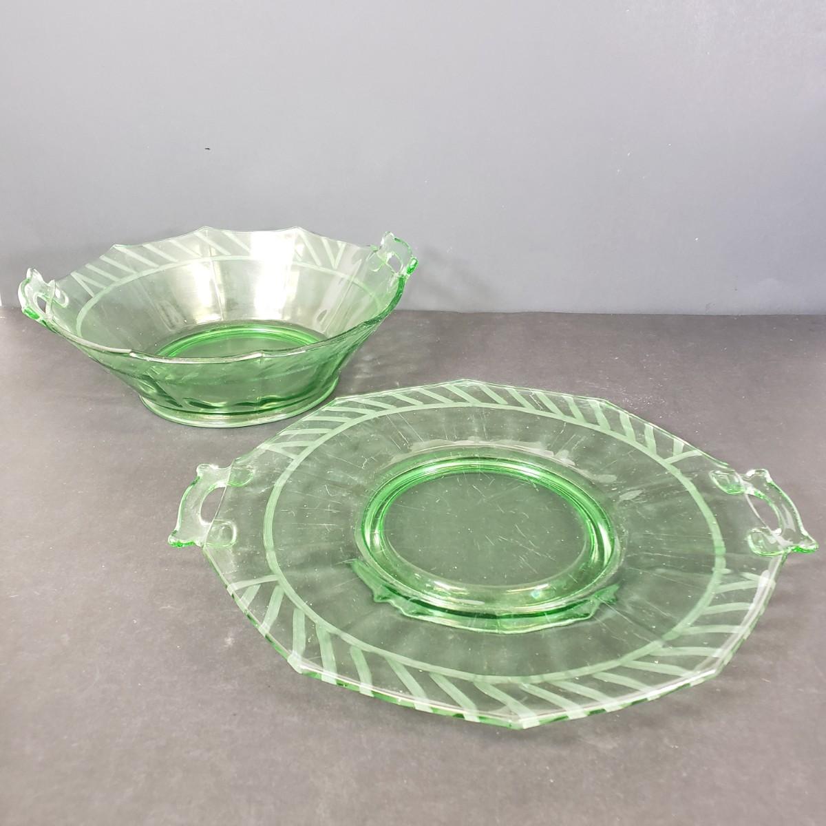 LOT 65: Green Depression Glass Etched Bowl & Plate Set