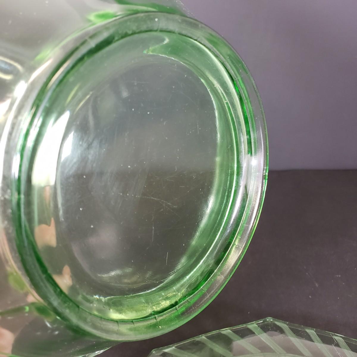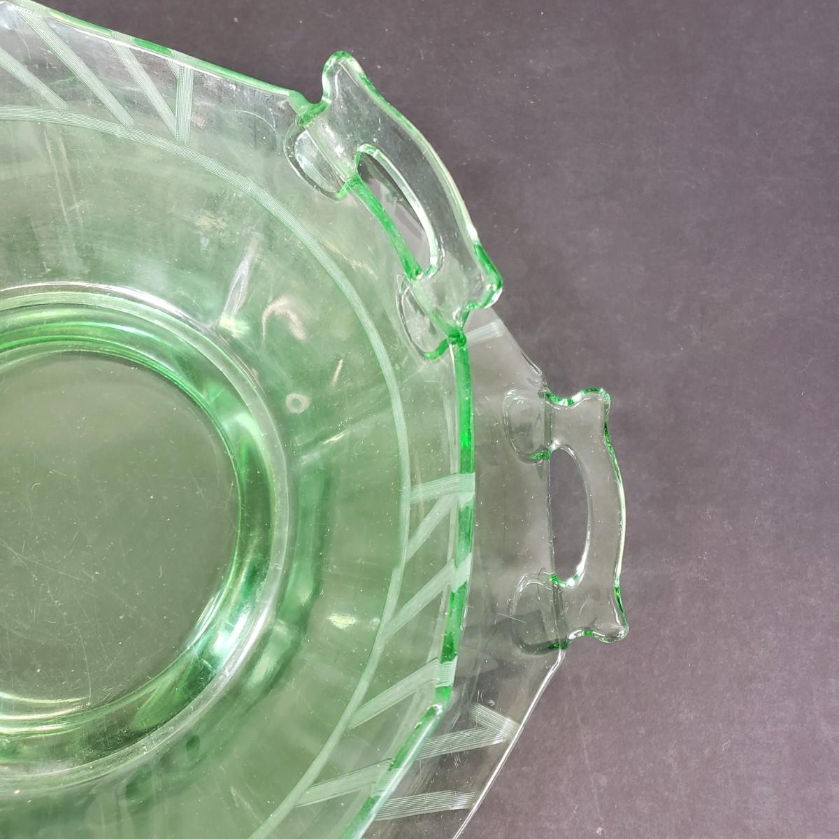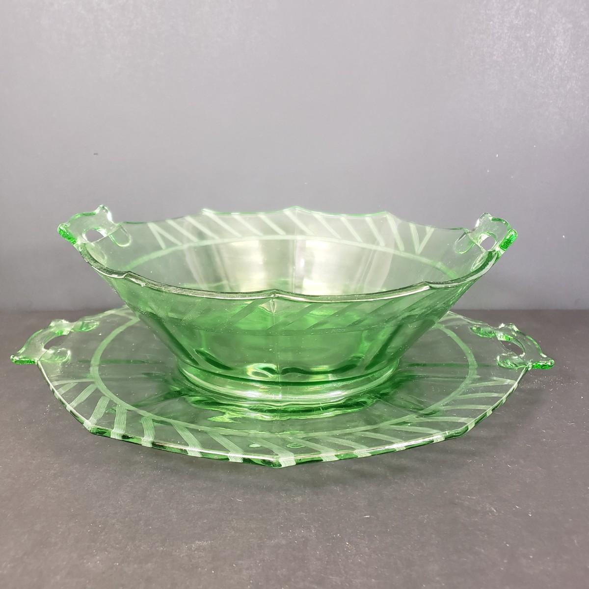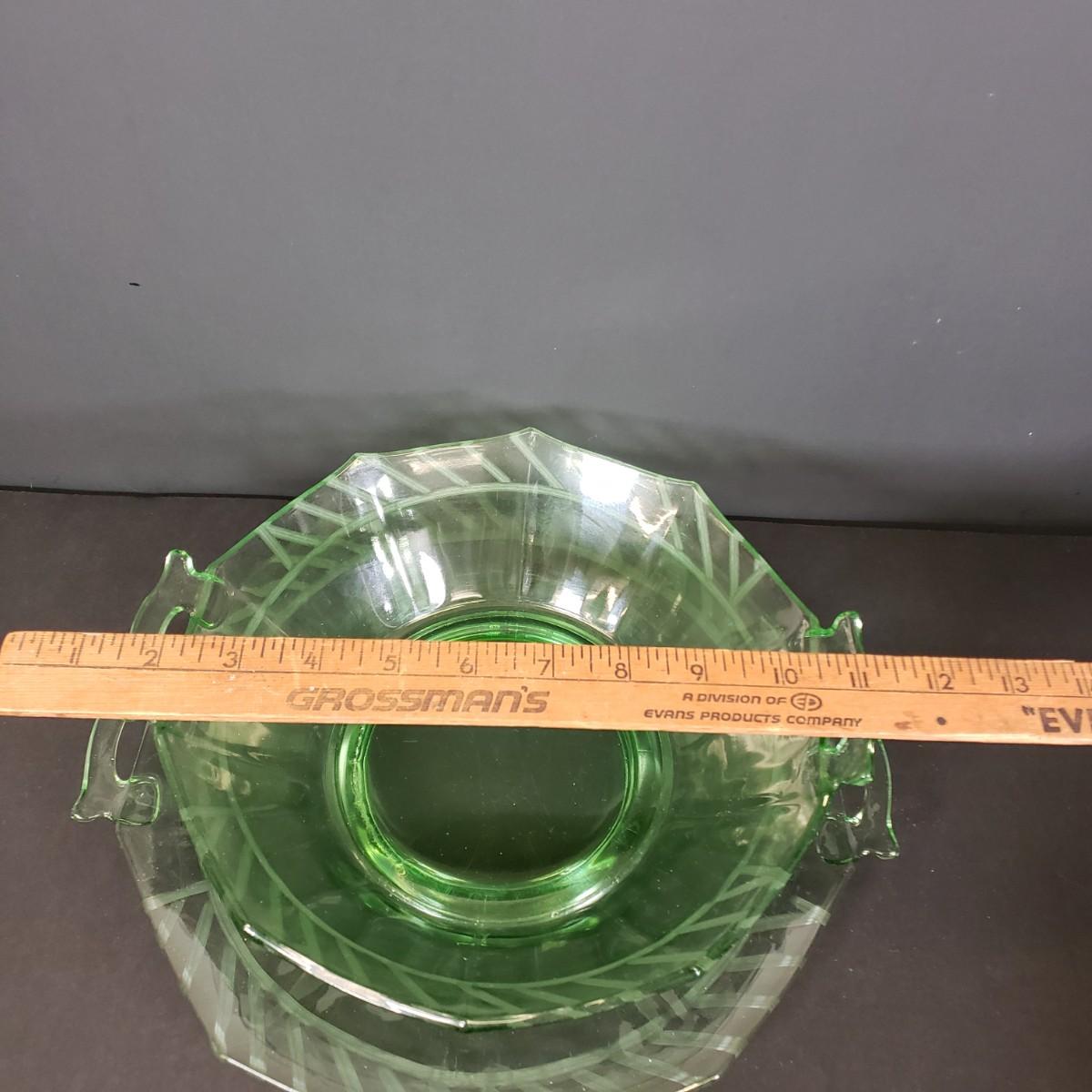 LOT 65: Green Depression Glass Etched Bowl & Plate Set