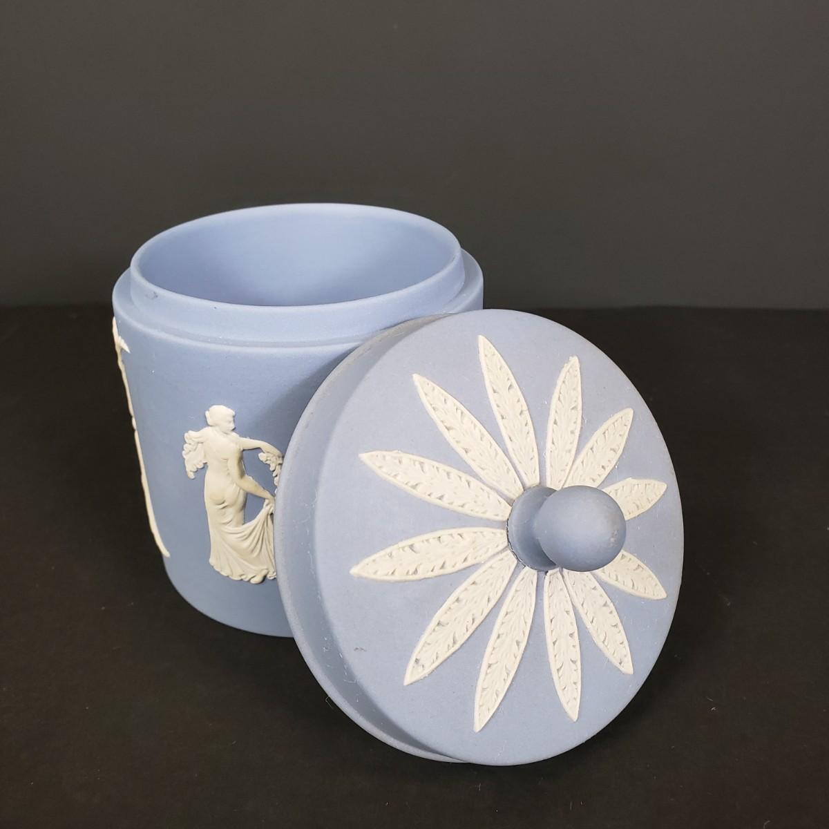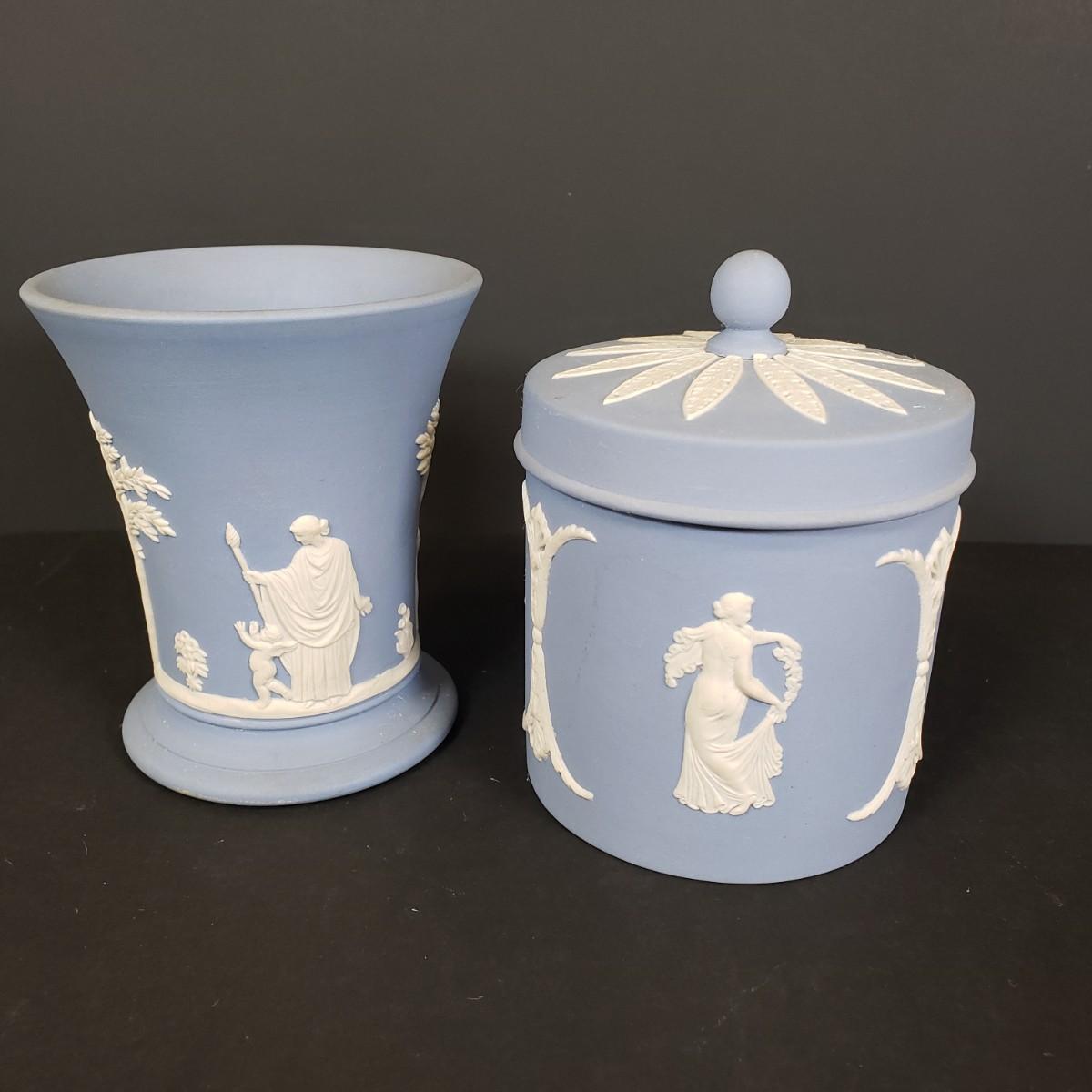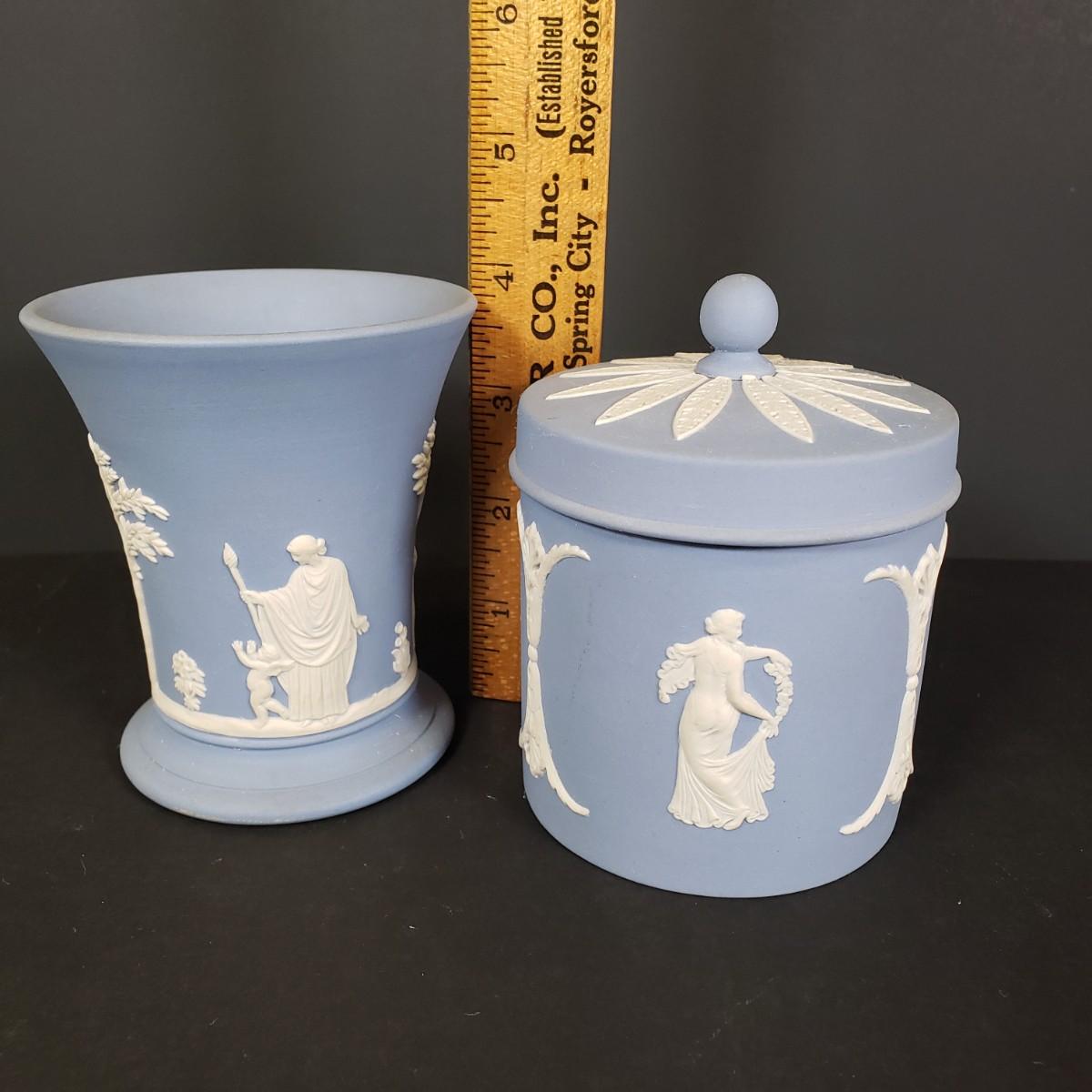 LOT 77: Mid Century 1950-1960s Wedgwood Blue Jasperware "Mother and Child" Vase & Wedgewood Blue Jasperware "Dancing Hours" Lidded Vanity Jar