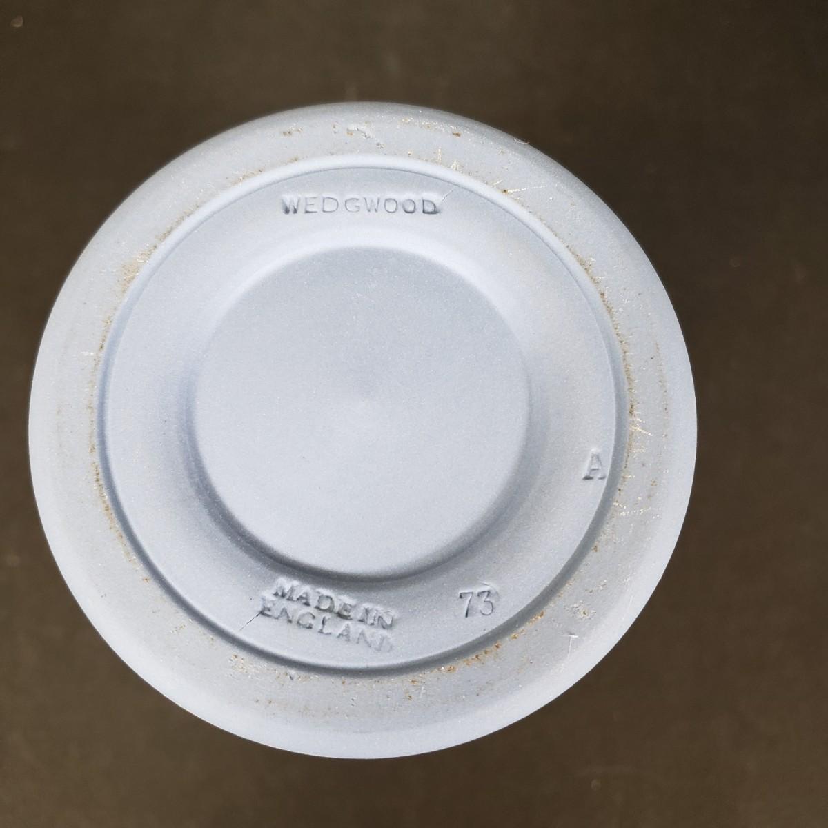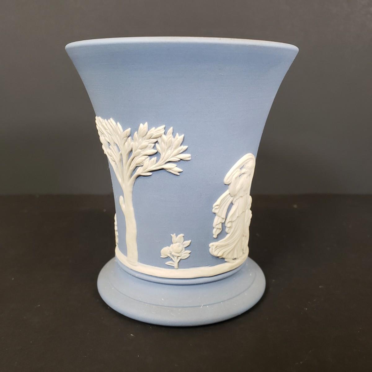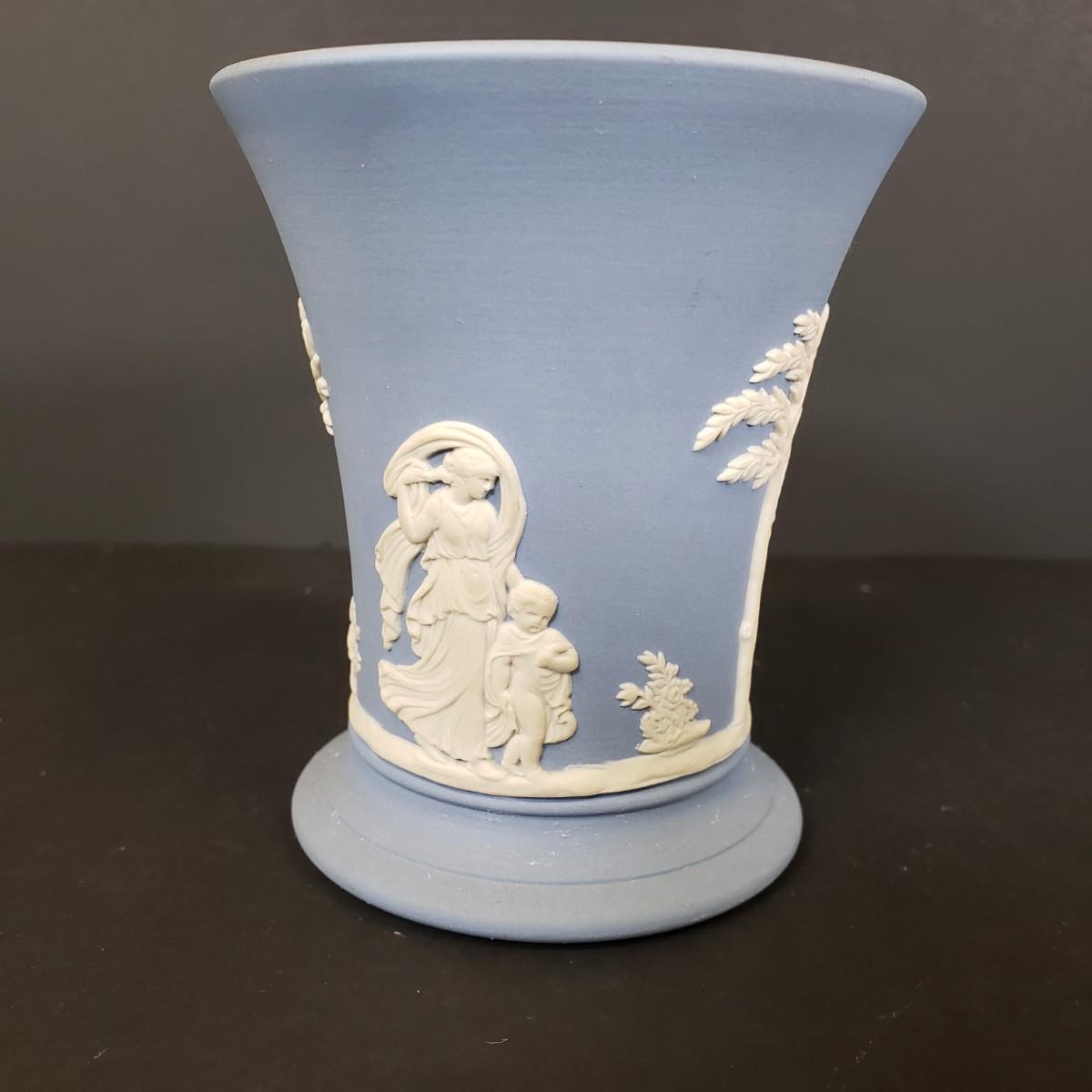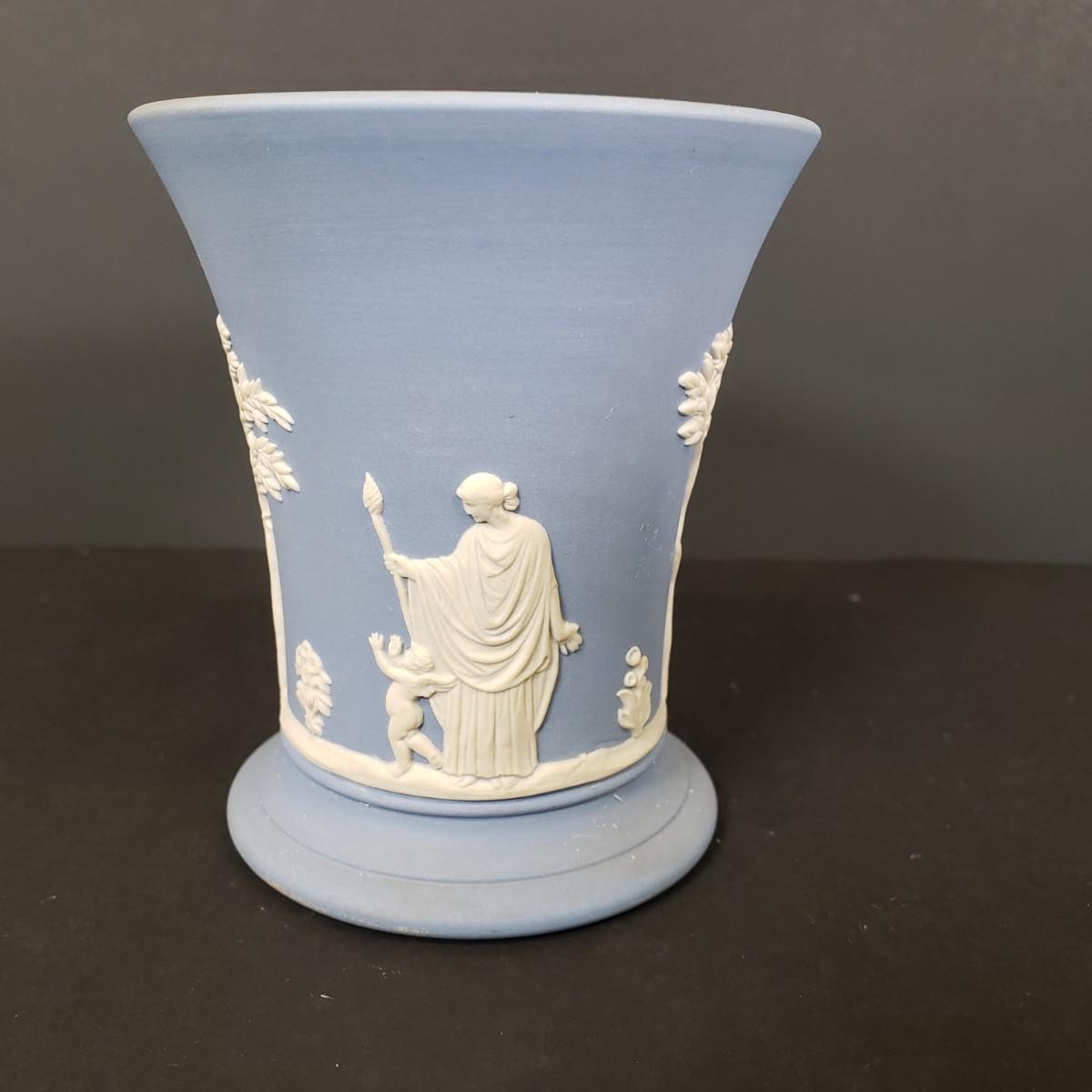 LOT 77: Mid Century 1950-1960s Wedgwood Blue Jasperware "Mother and Child" Vase & Wedgewood Blue Jasperware "Dancing Hours" Lidded Vanity Jar
