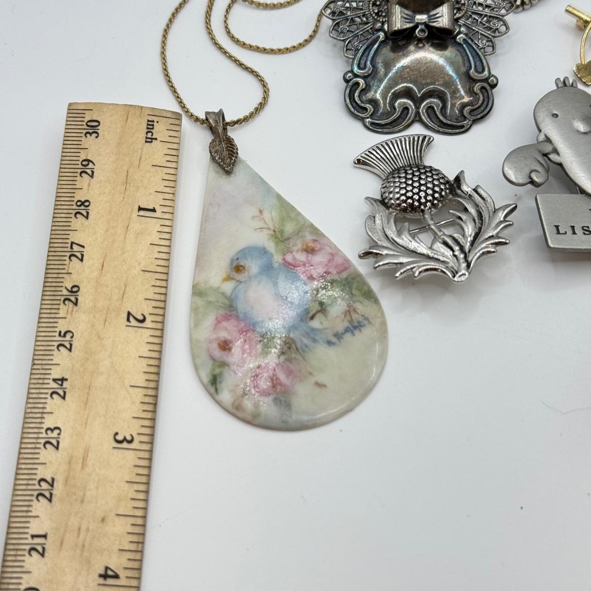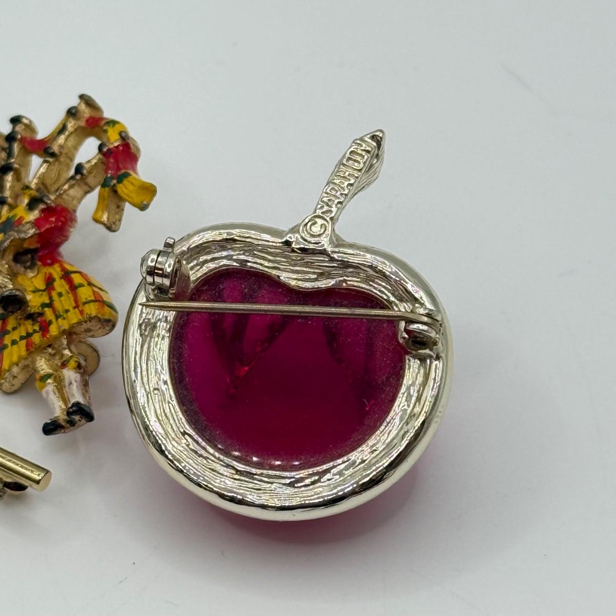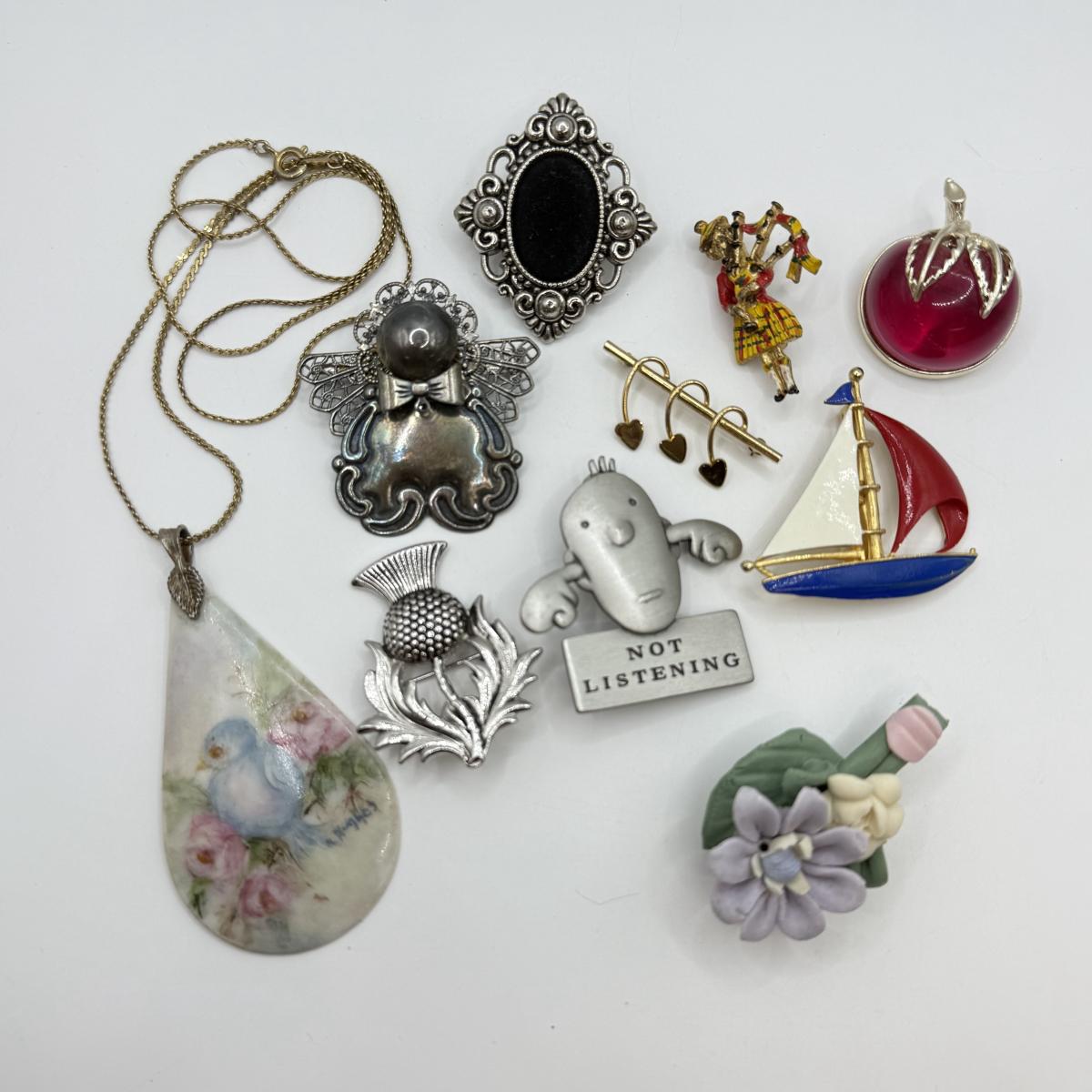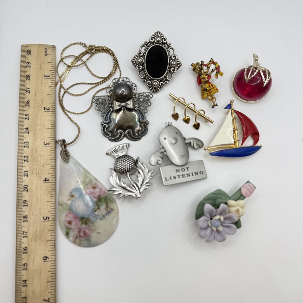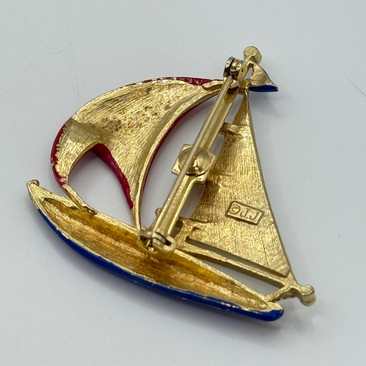 LOT 82: Clay Floral Pin & Pendant, Sarah Coventry Apple Pin, JJ Sailboat Brooch & More