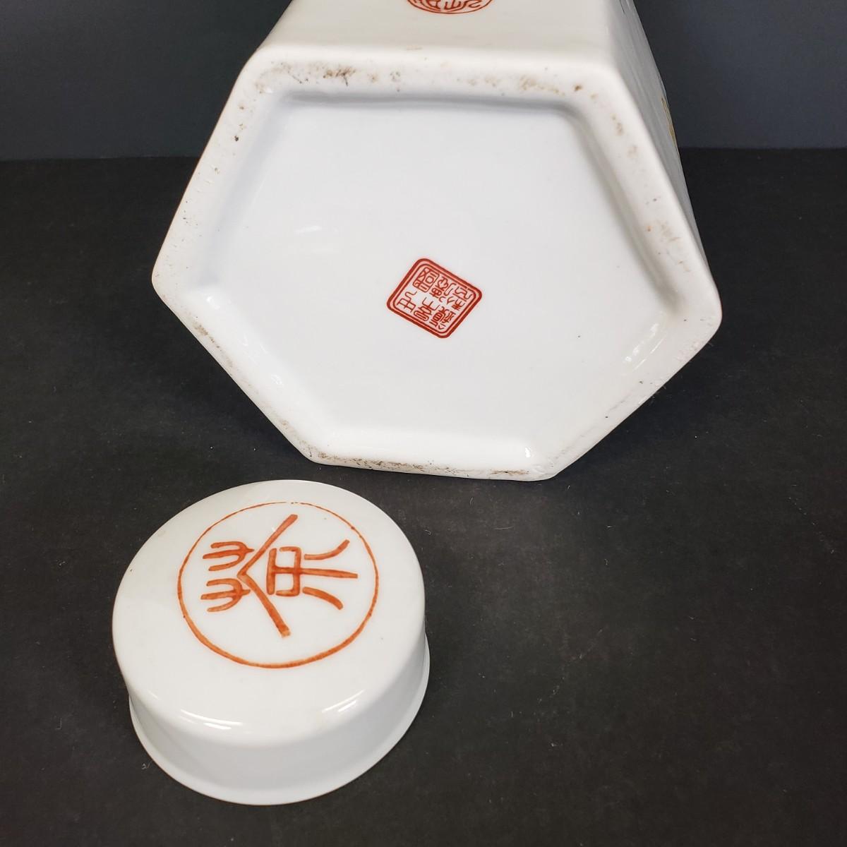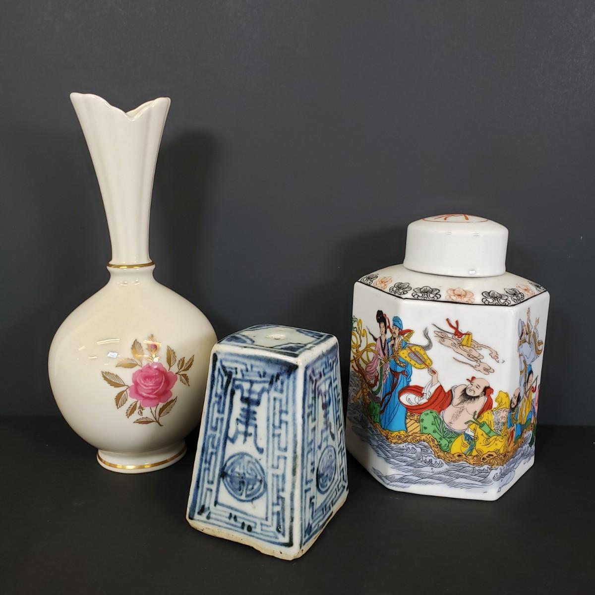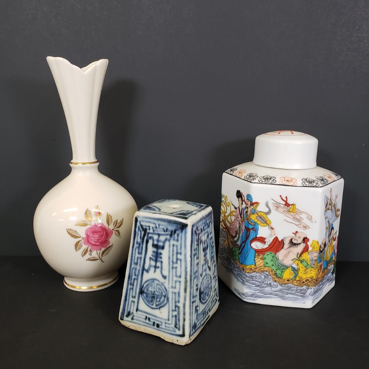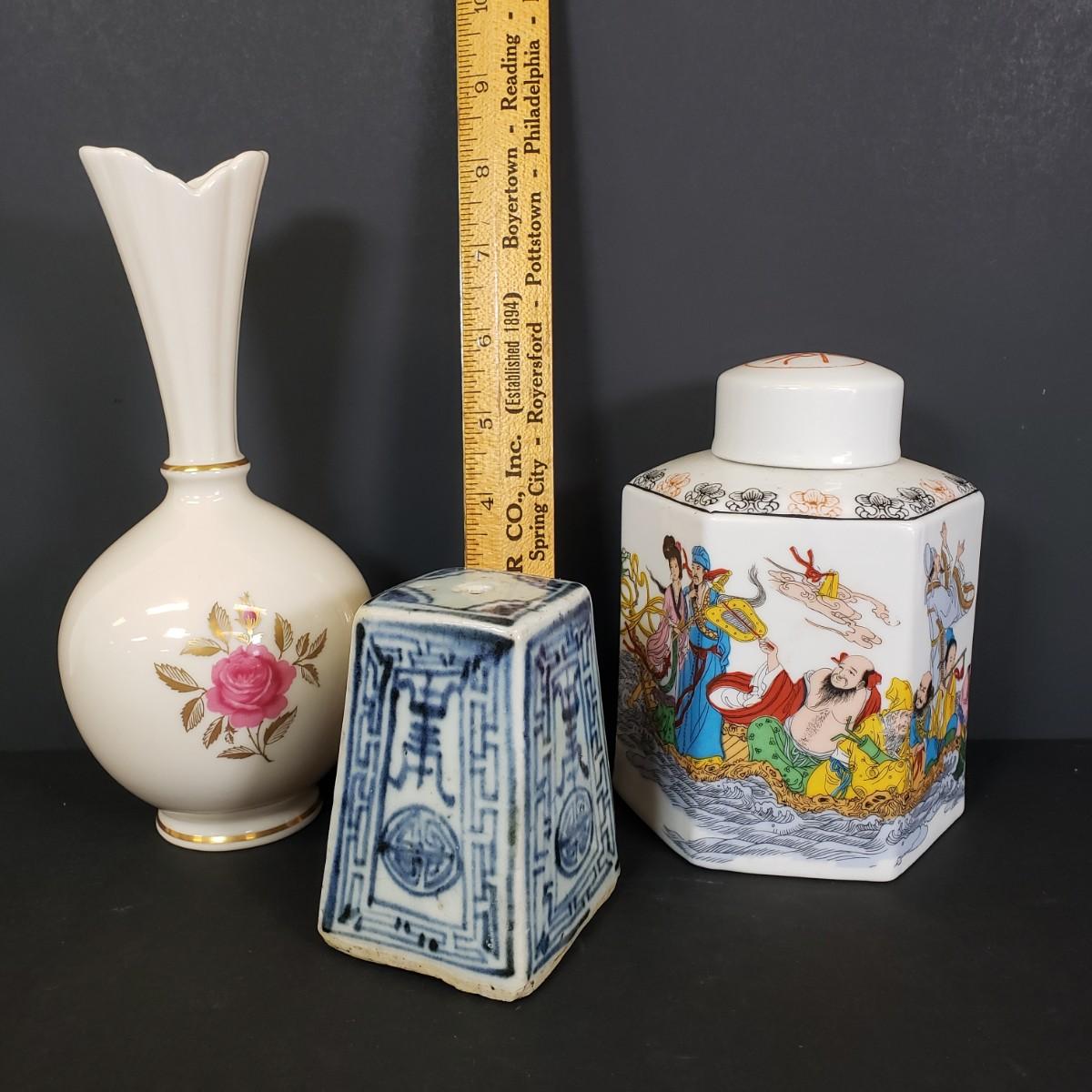 LOT 87: Antique Chinese Joss Stick Incense burner, Antique Porcelain Tea Caddy & Vintage Lenox USA Vase