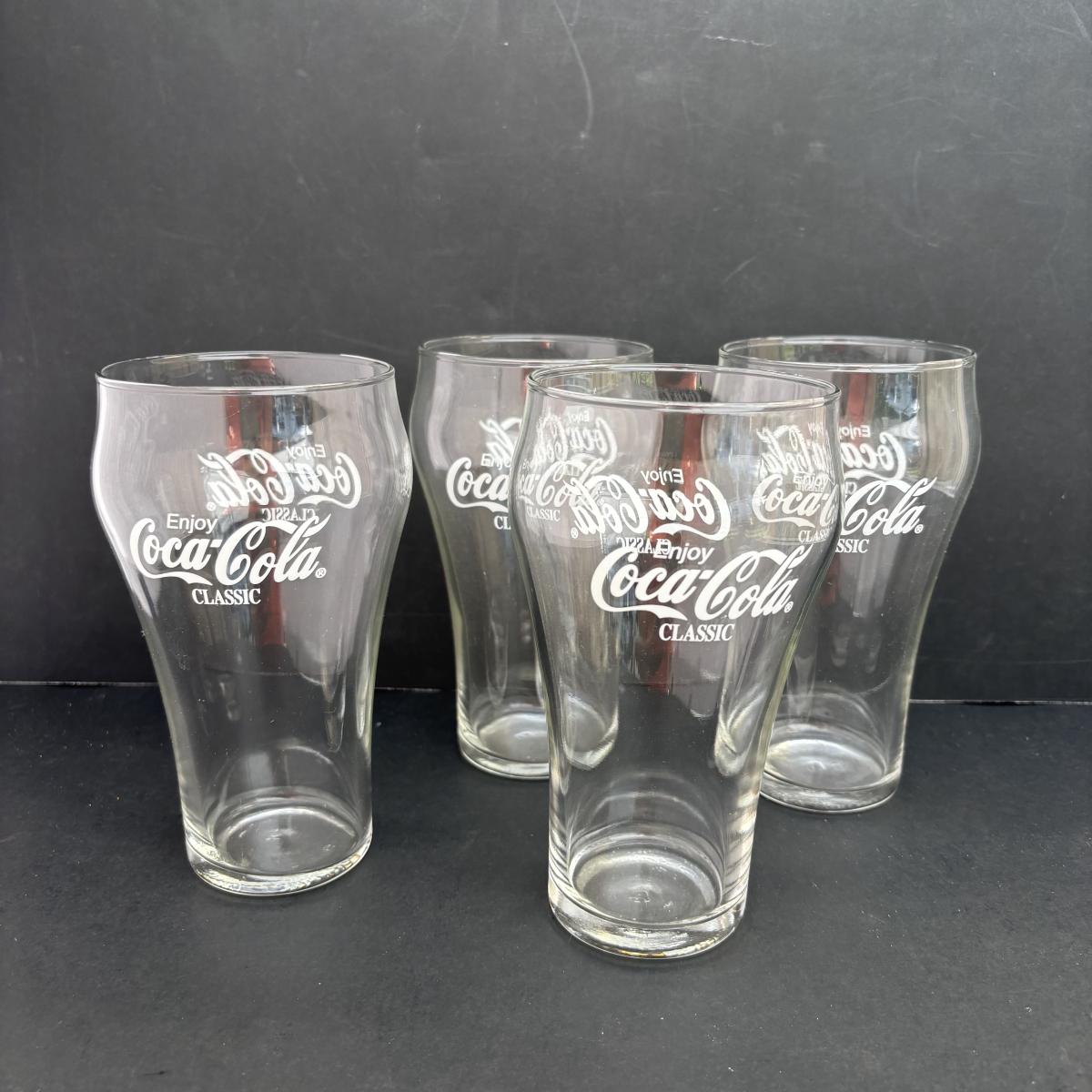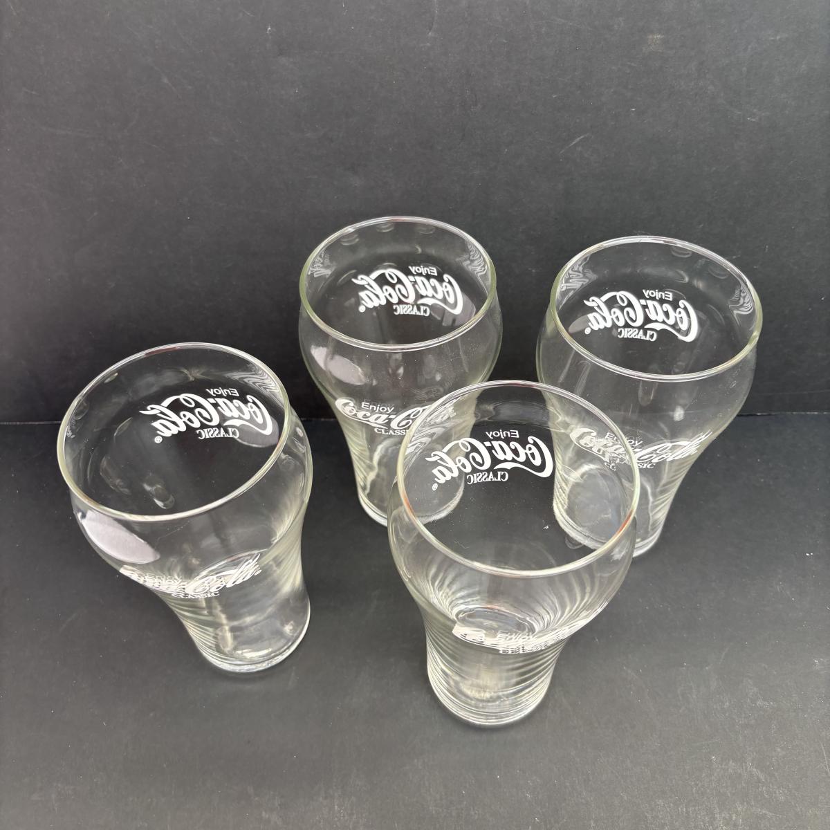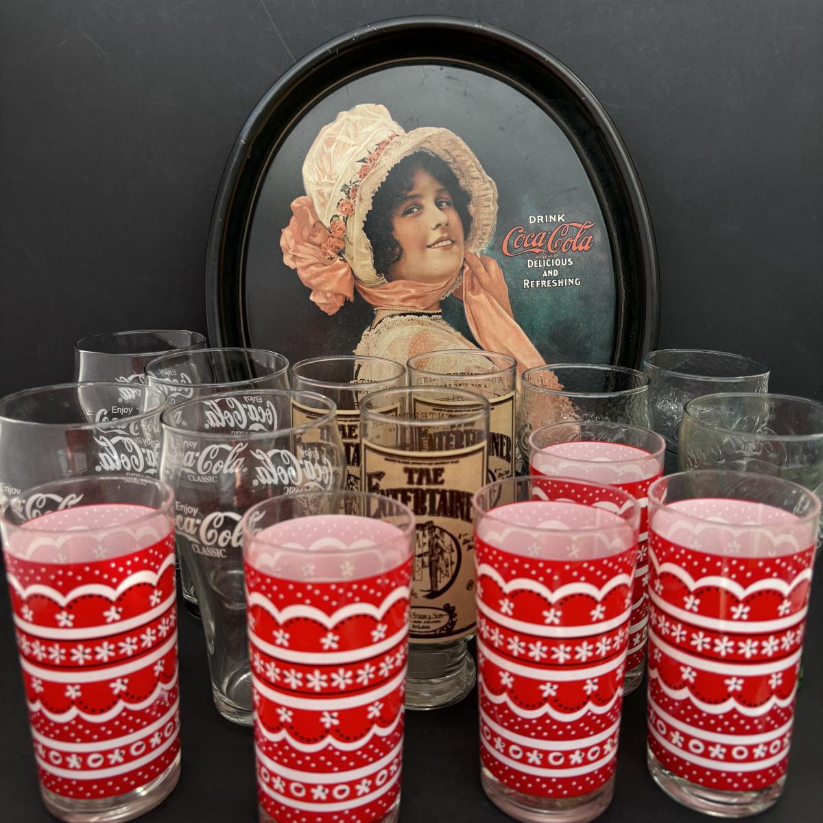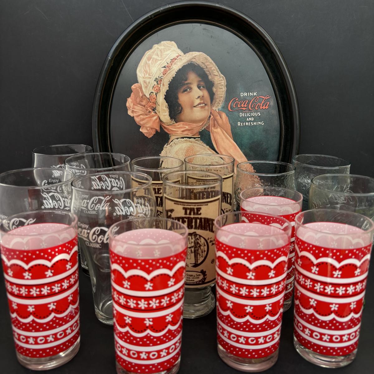 LOT 2: Coca-Cola Serving Tray & Glasses, The Entertainer Glasses & Vintage Red/White Glasses