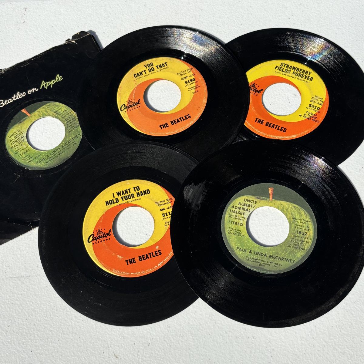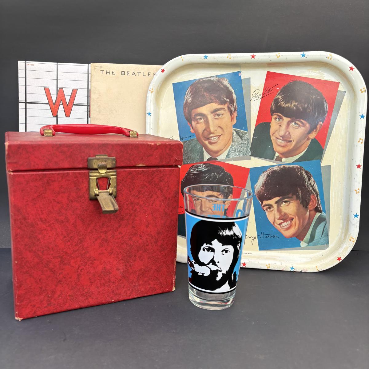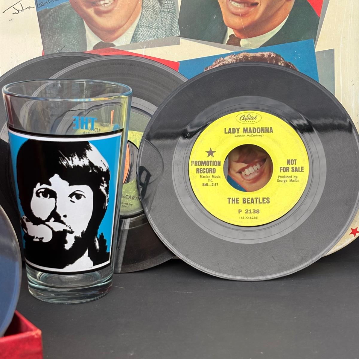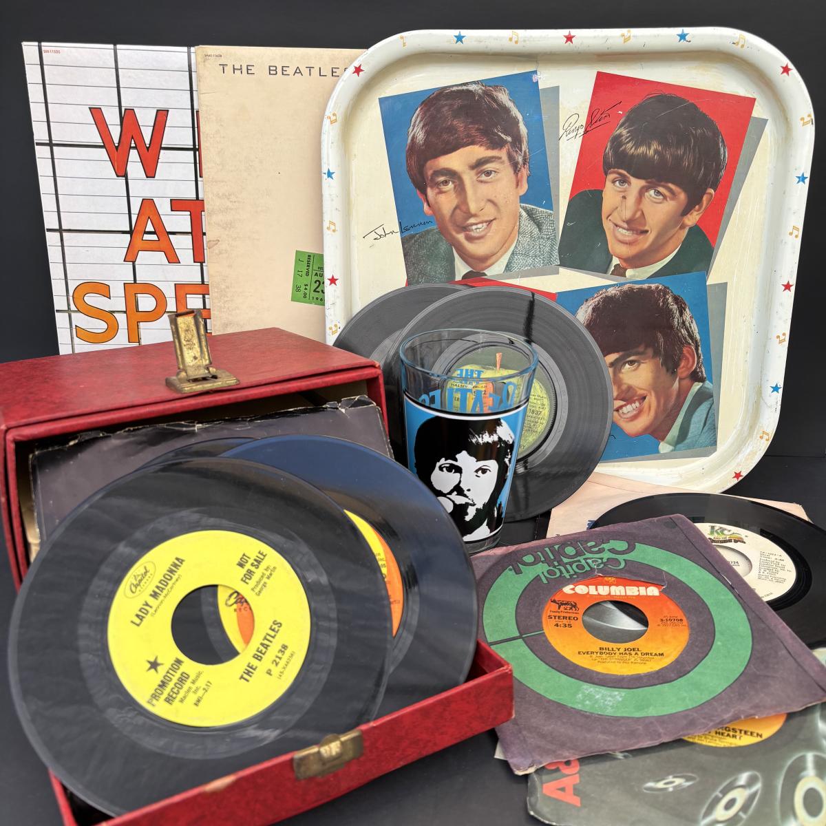 LOT 4: Vintage Beatles Tray, Live at the Hollywood Bowl LP, Lady Madonna Promotion 45, Wing at the Speed of Sound LP and Various Artists 45s
