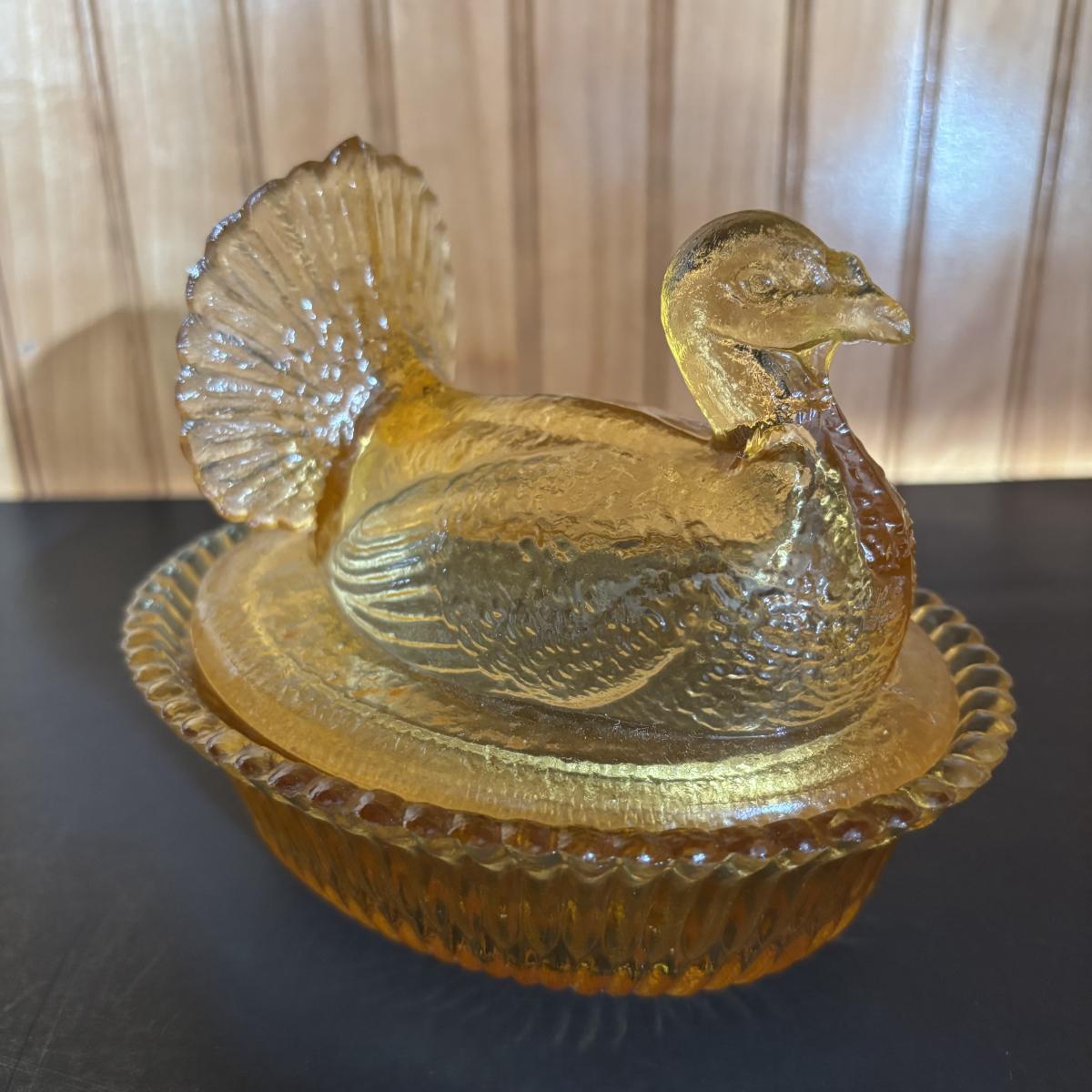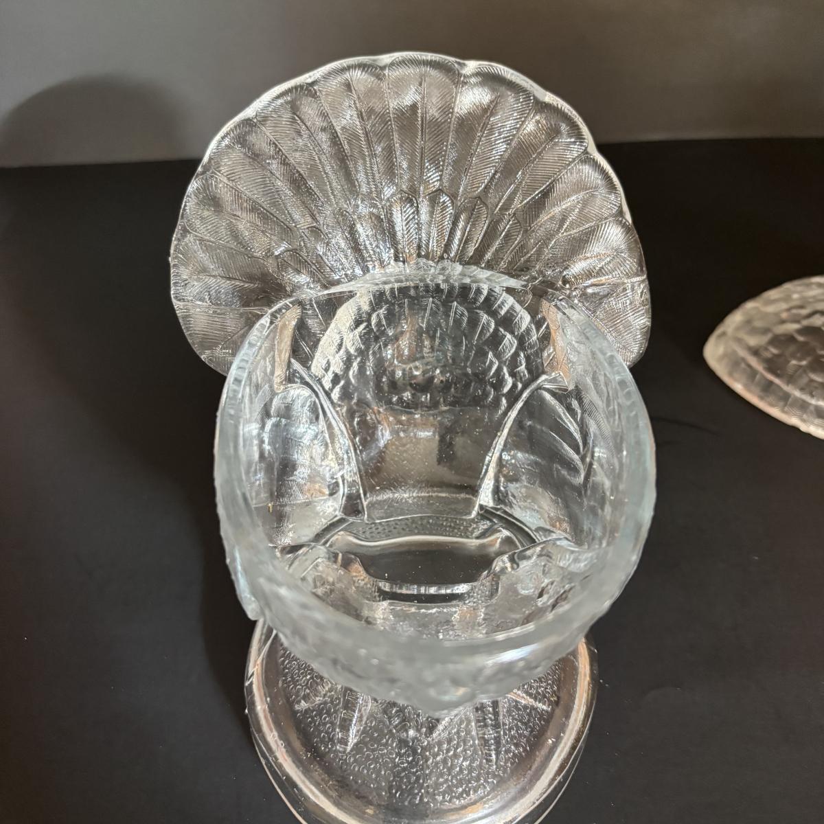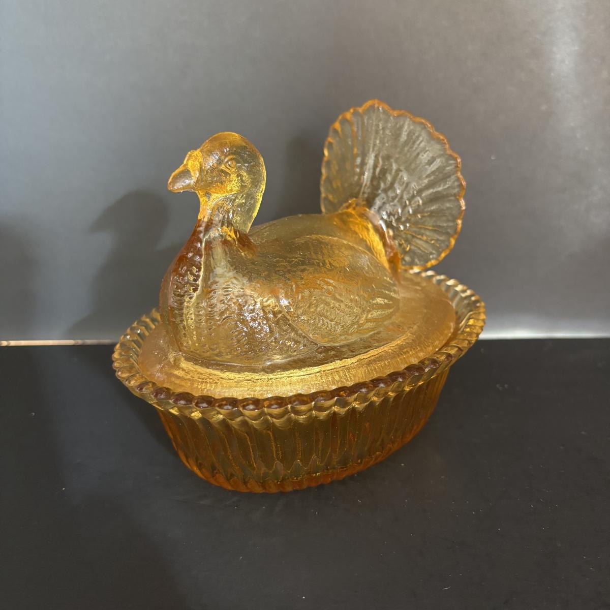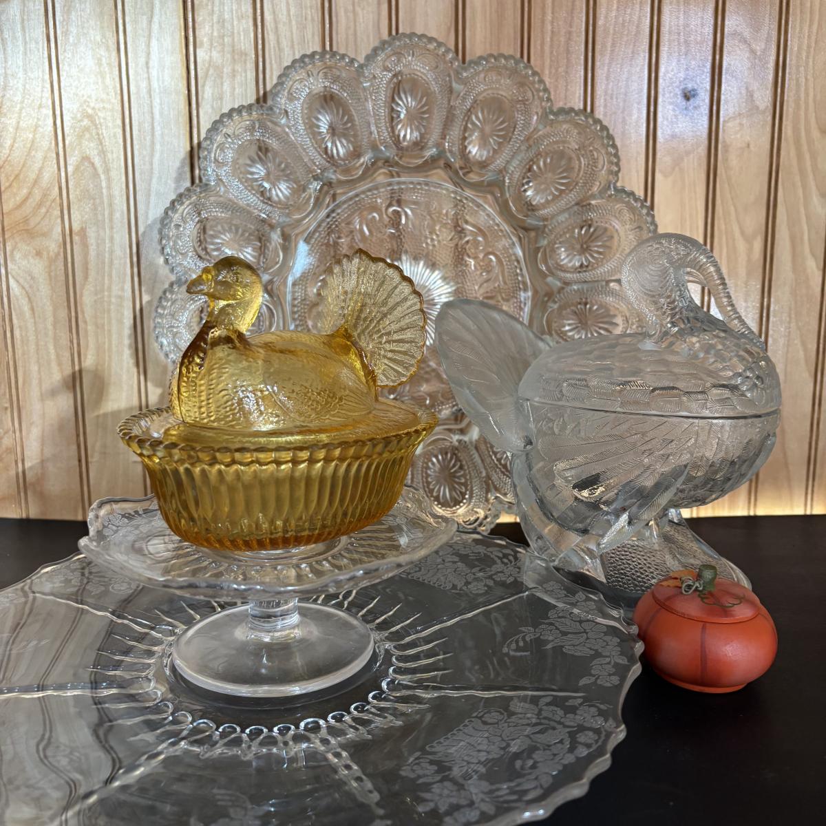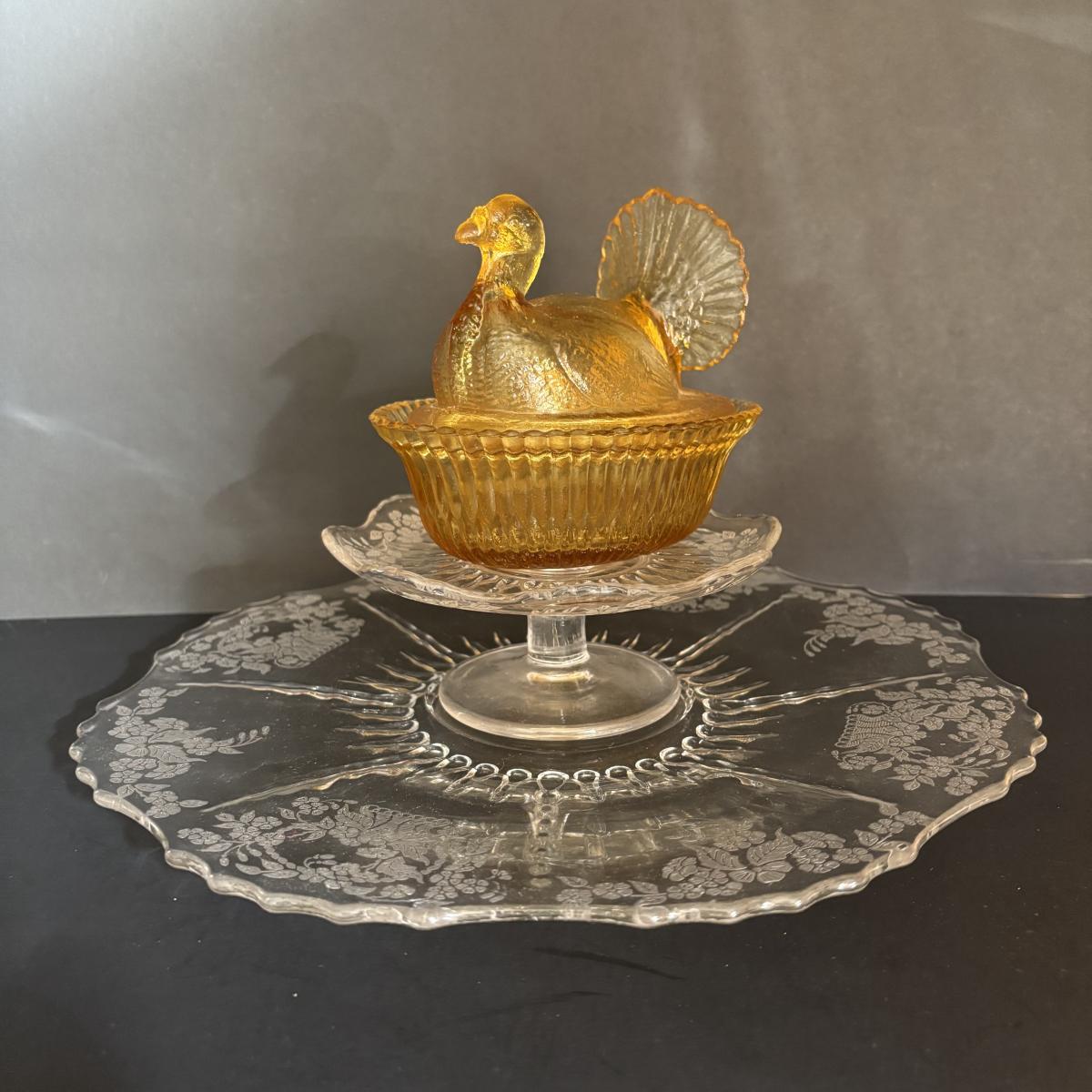 LOT 24: Vintage Tom Turkey Lidded Candy Dish, Amber Turkey on Nest, Etched Glass Tiered Serving Plate & Egg Plate
