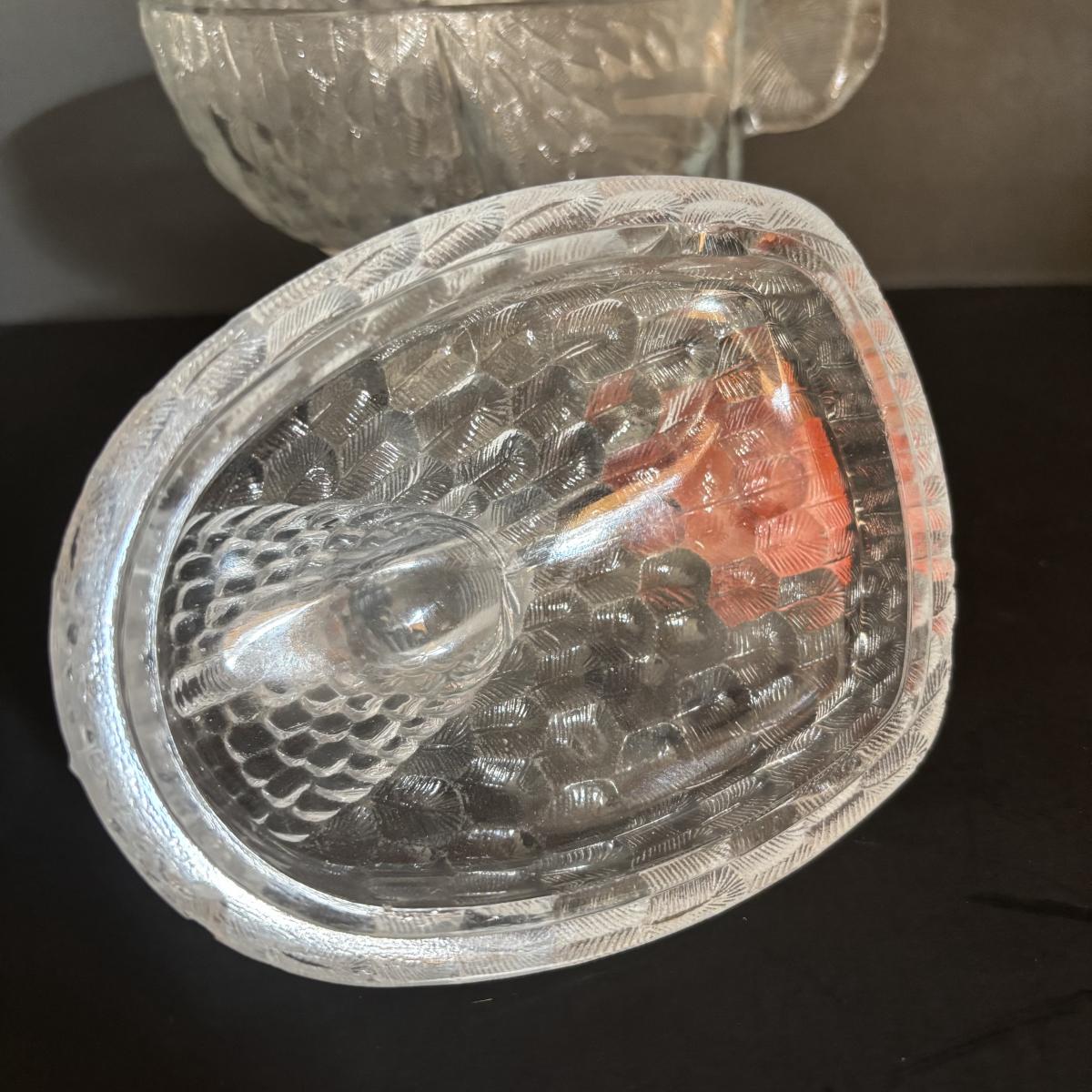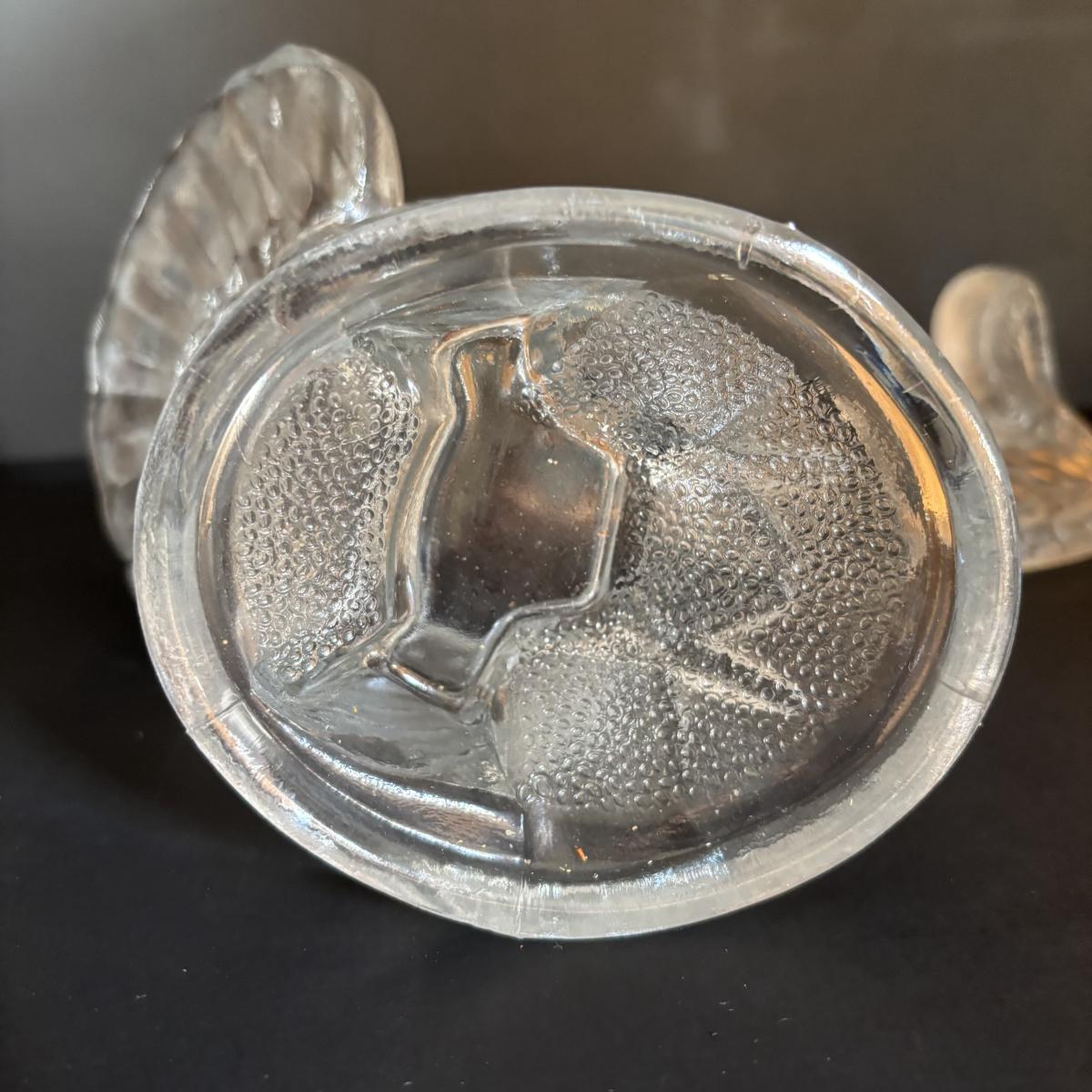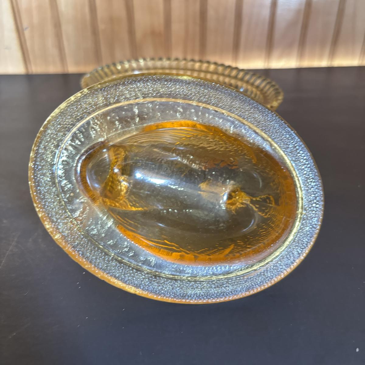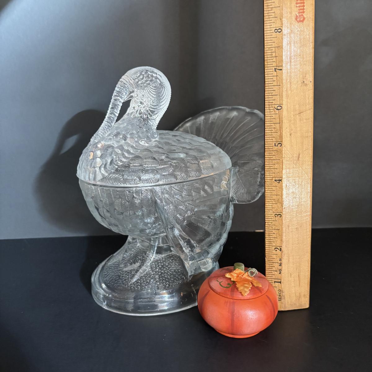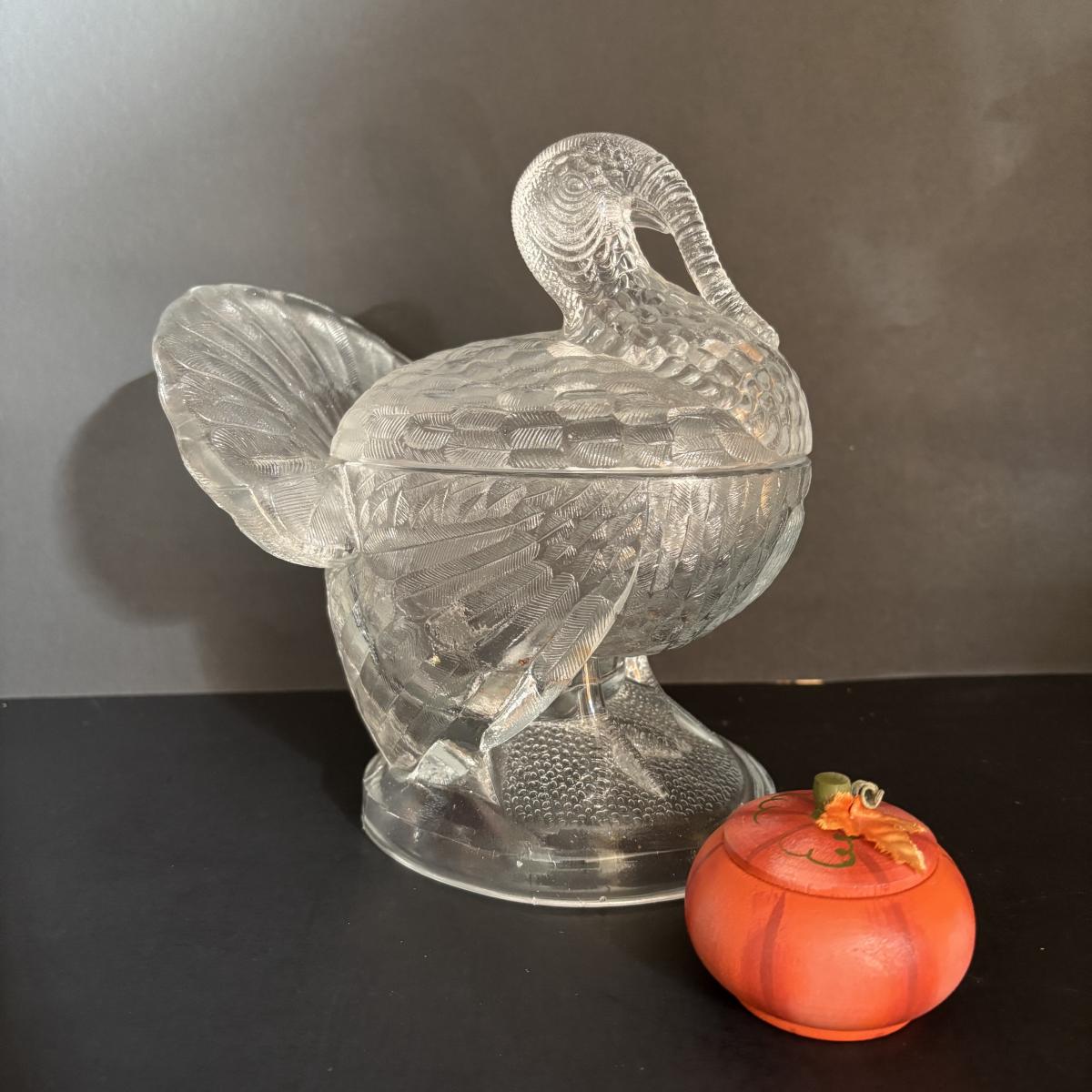 LOT 24: Vintage Tom Turkey Lidded Candy Dish, Amber Turkey on Nest, Etched Glass Tiered Serving Plate & Egg Plate