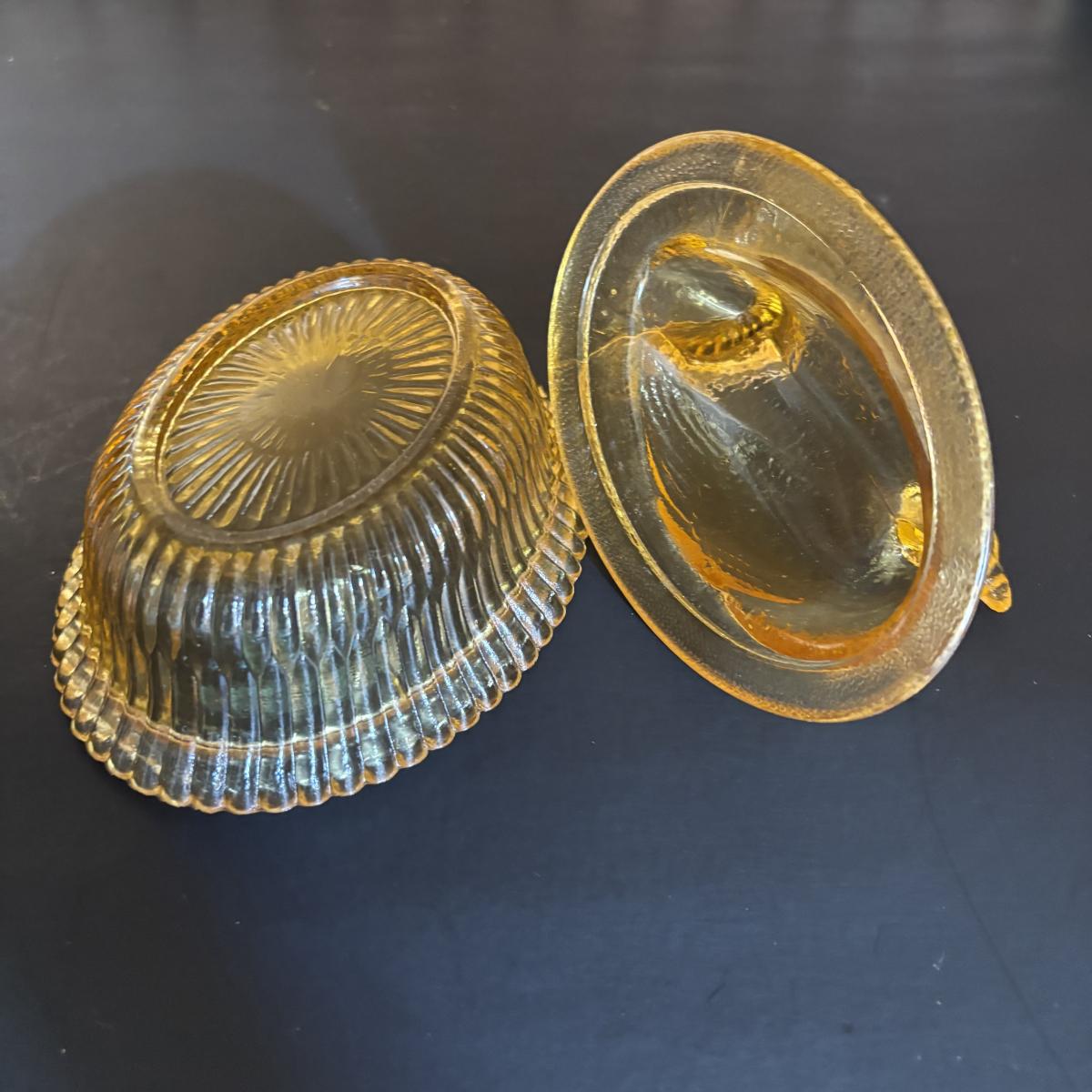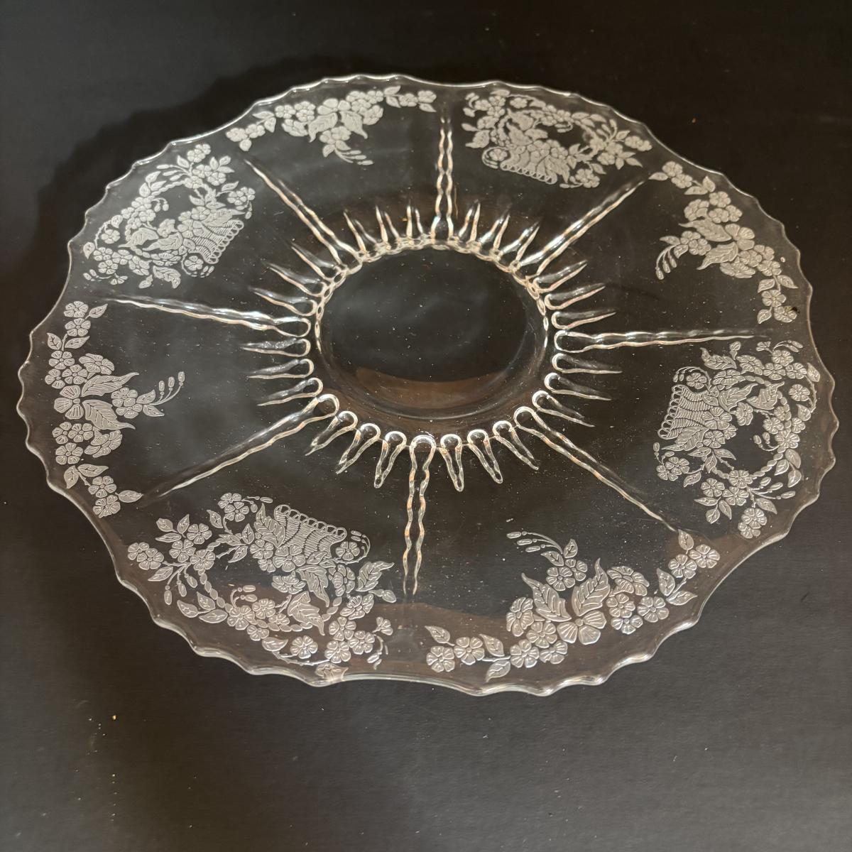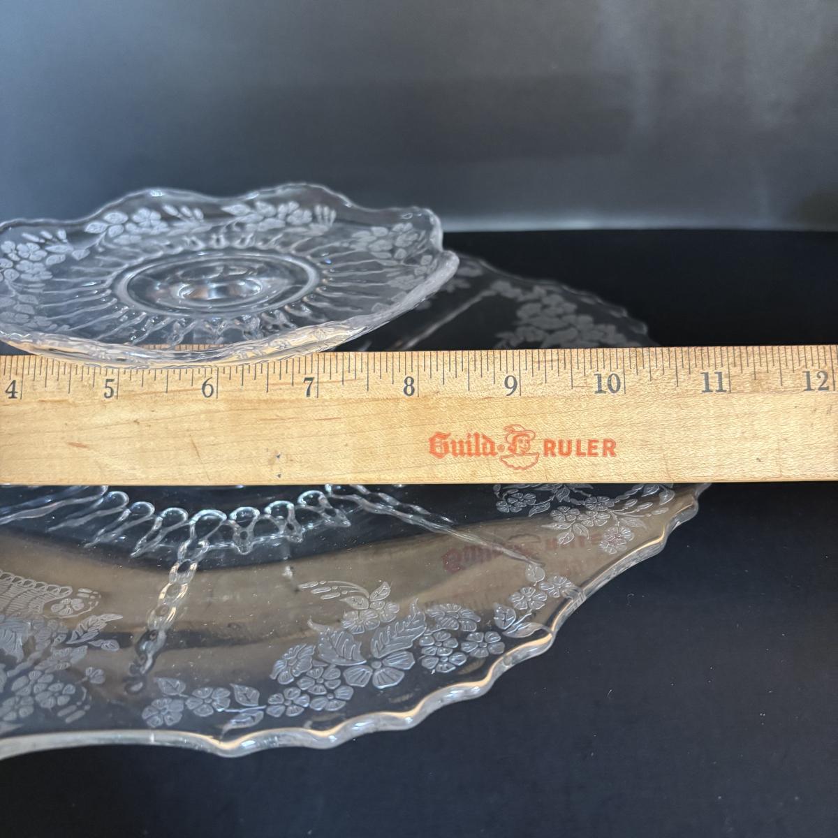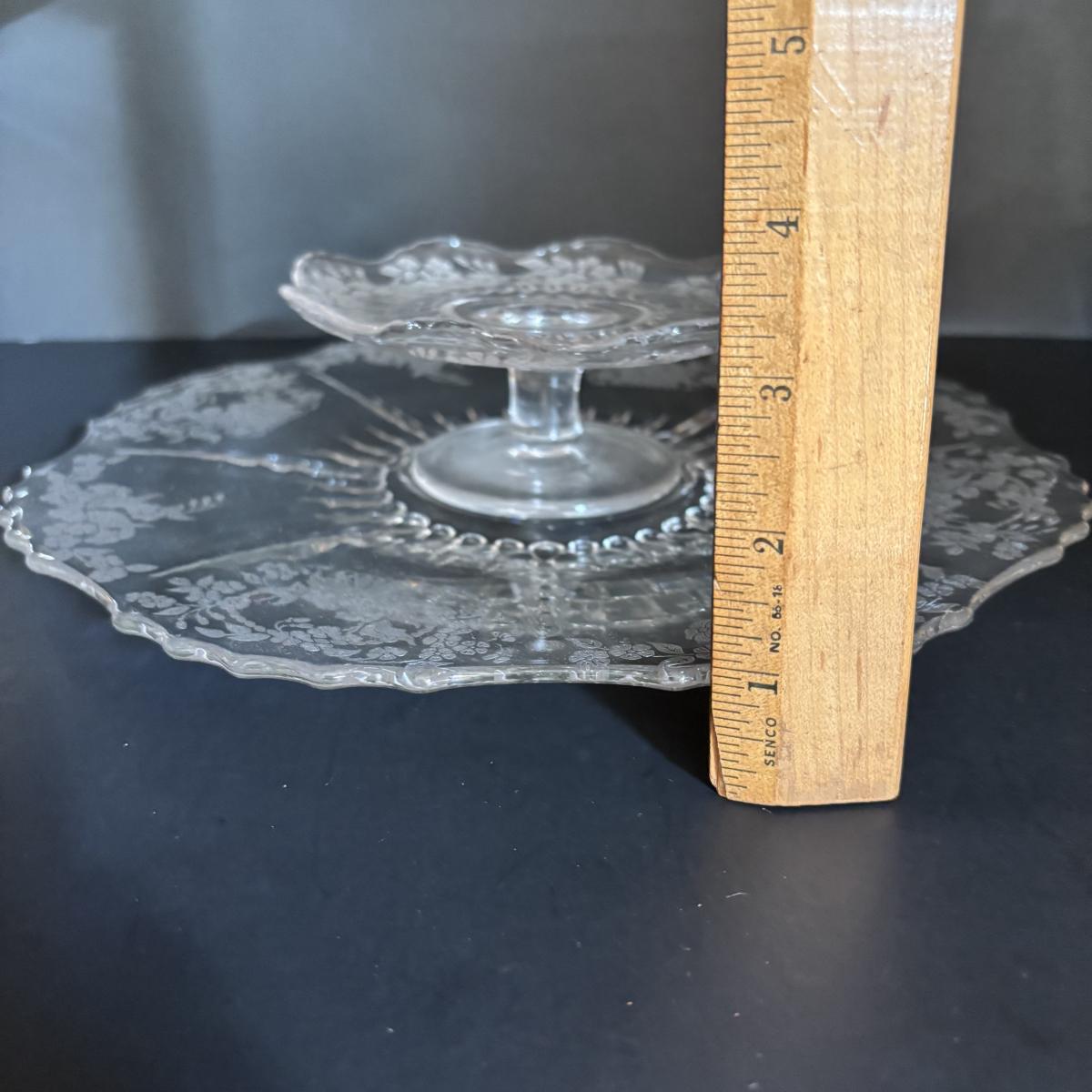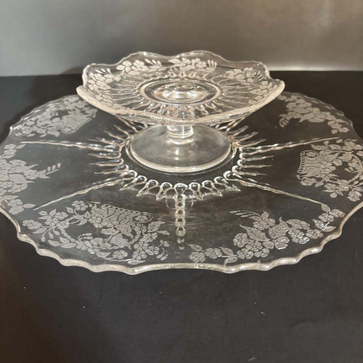 LOT 24: Vintage Tom Turkey Lidded Candy Dish, Amber Turkey on Nest, Etched Glass Tiered Serving Plate & Egg Plate