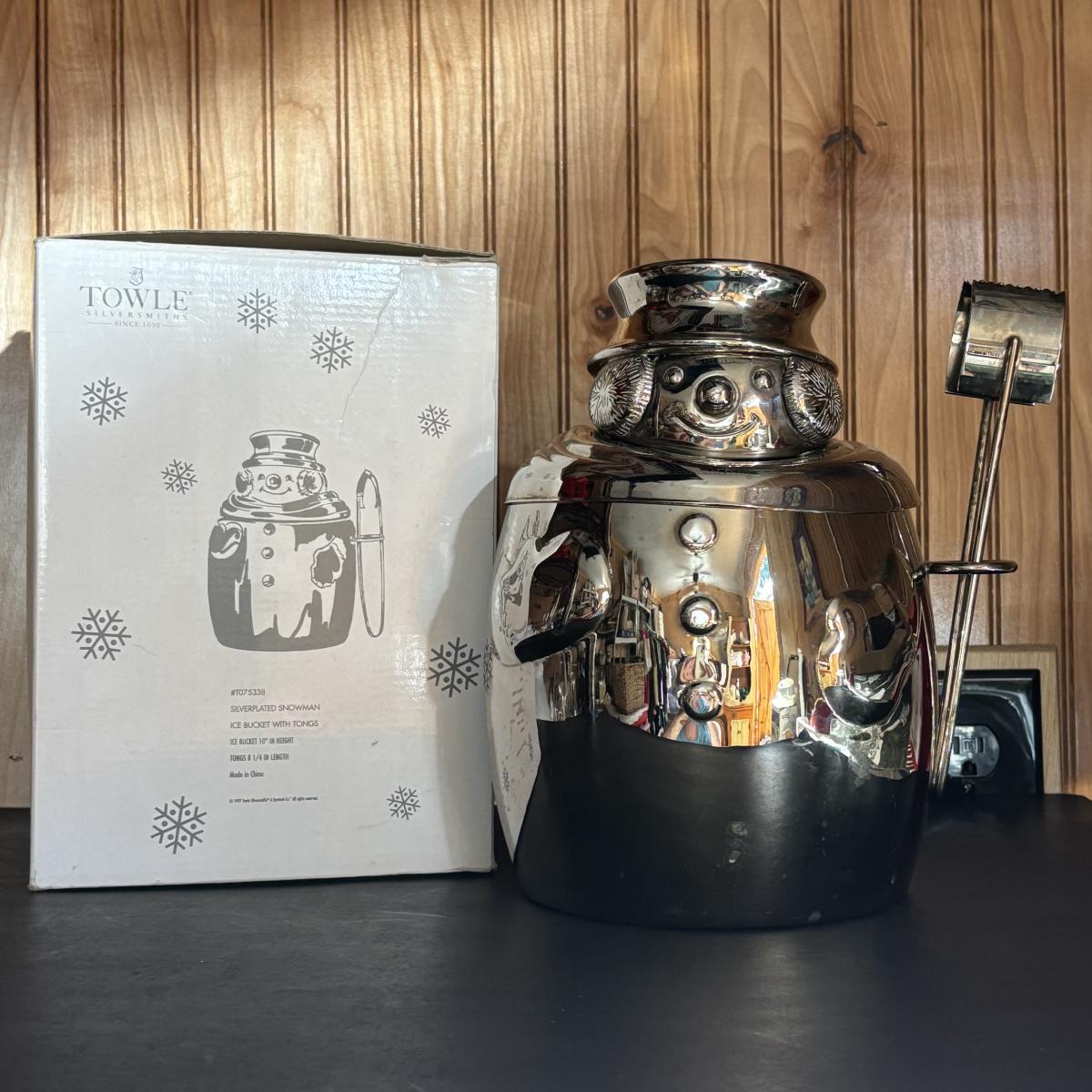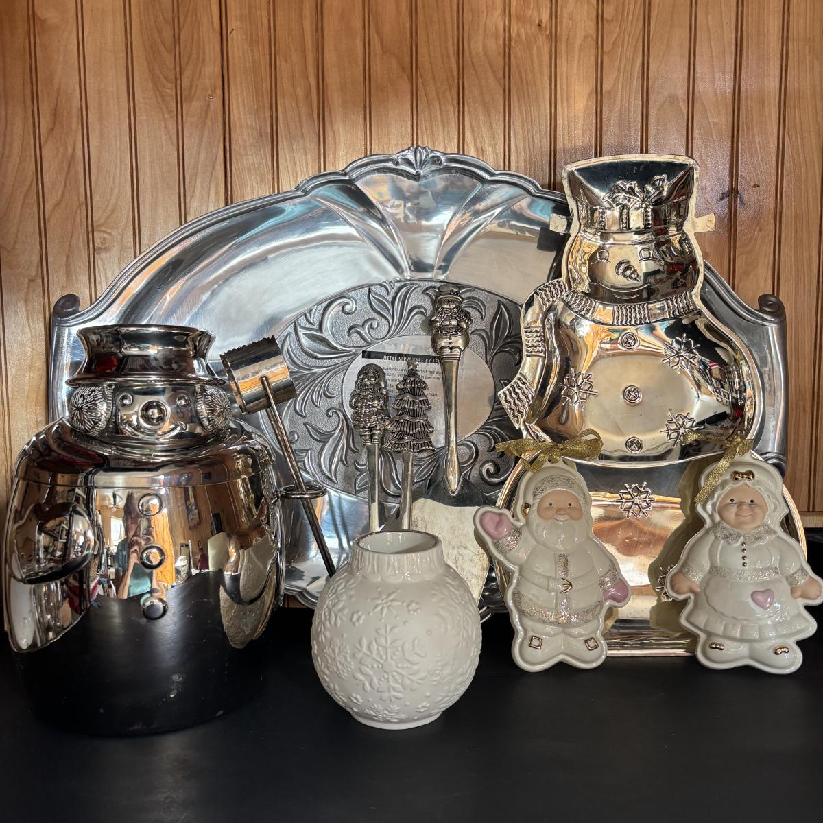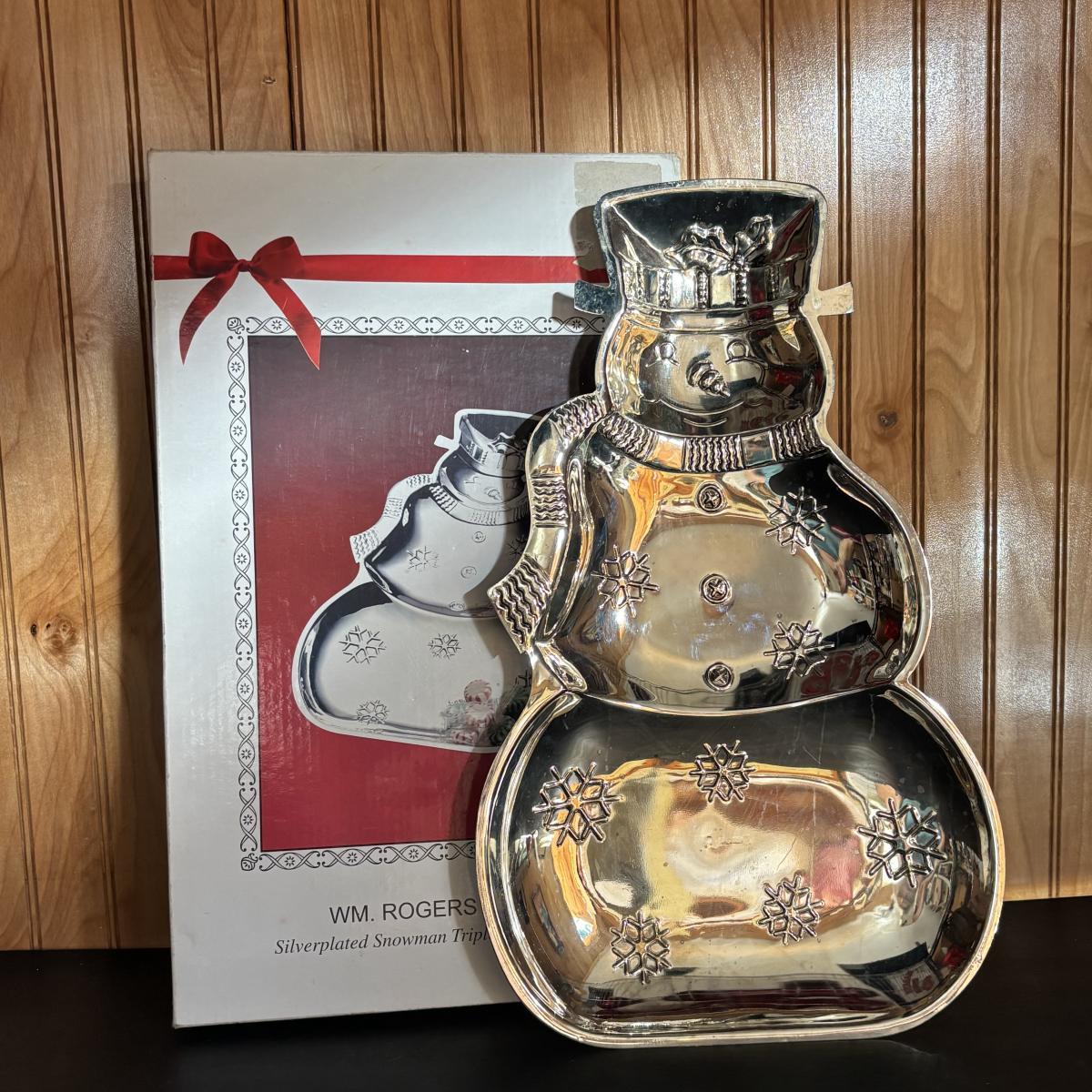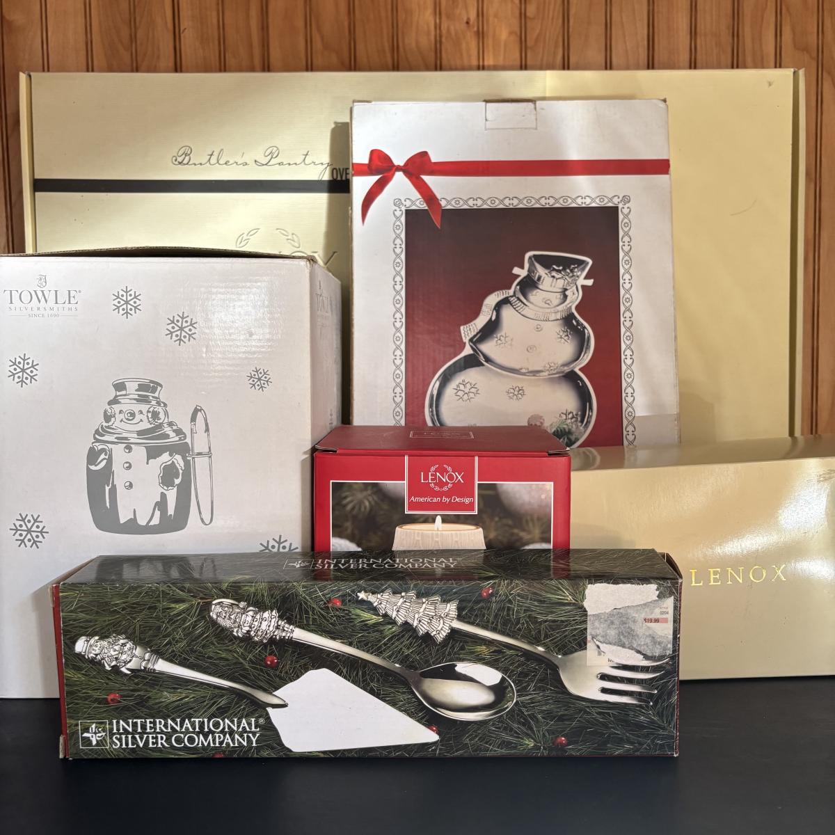 LOT 25: Towle Snowman Ice Bucket, WM Rogers Snowman Divided Server, International Silver Co. Holiday Serving Utensils, Lenox Butler's Pantry Oversized Tray & More
