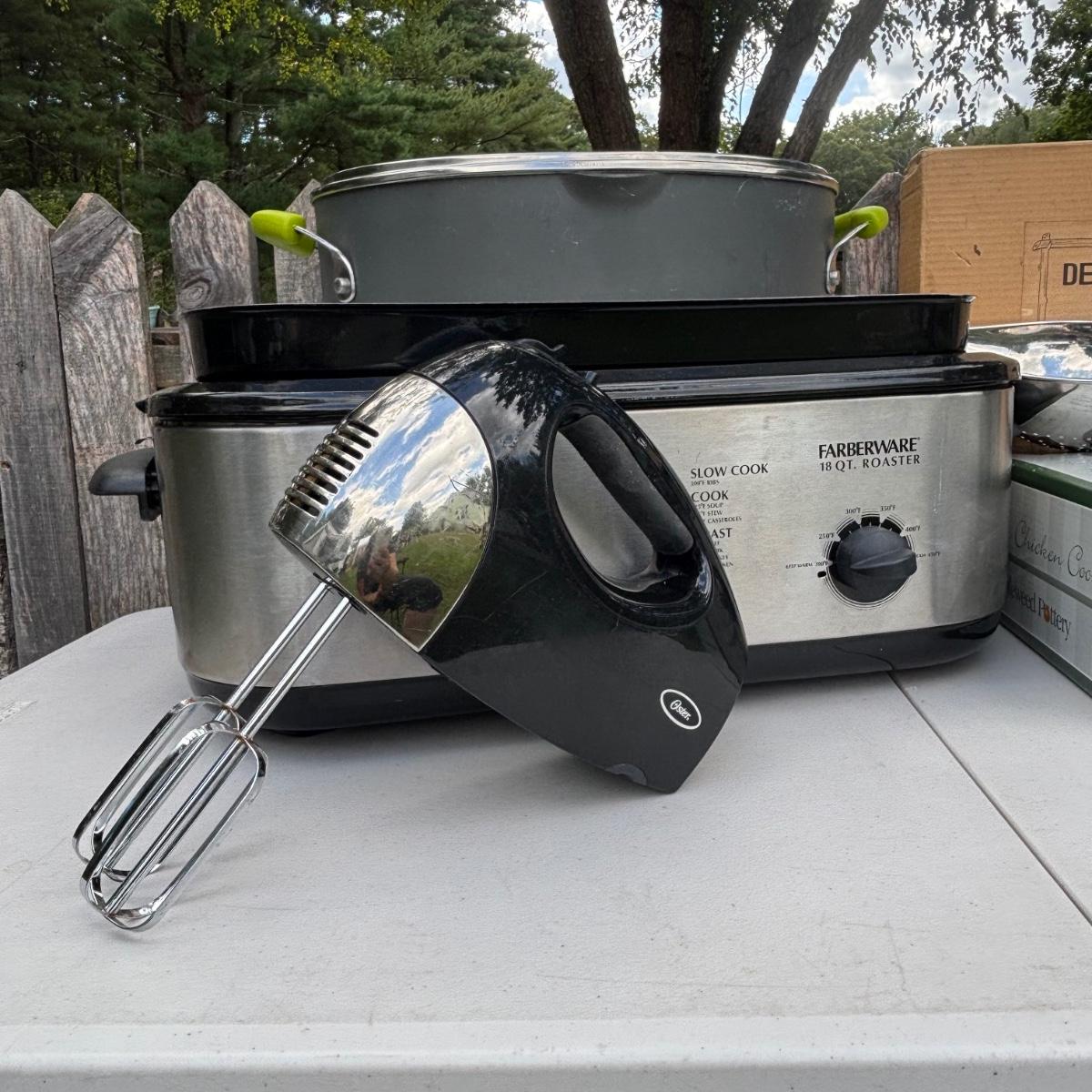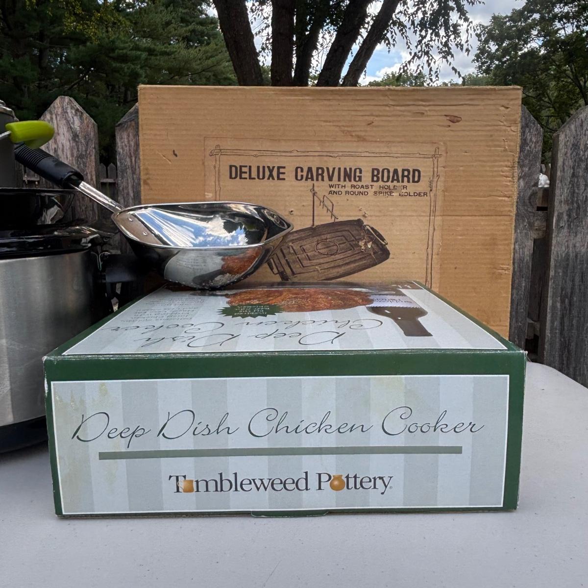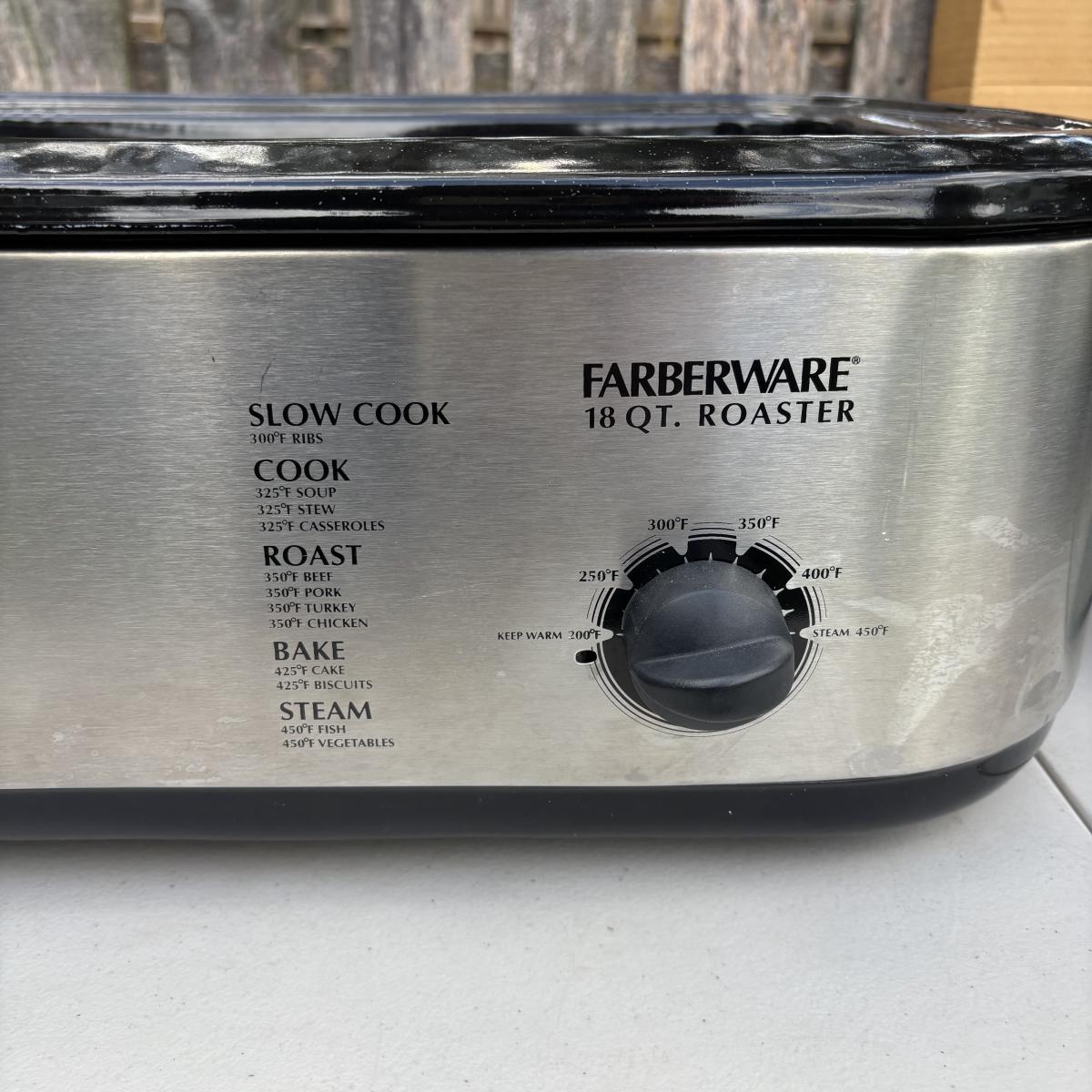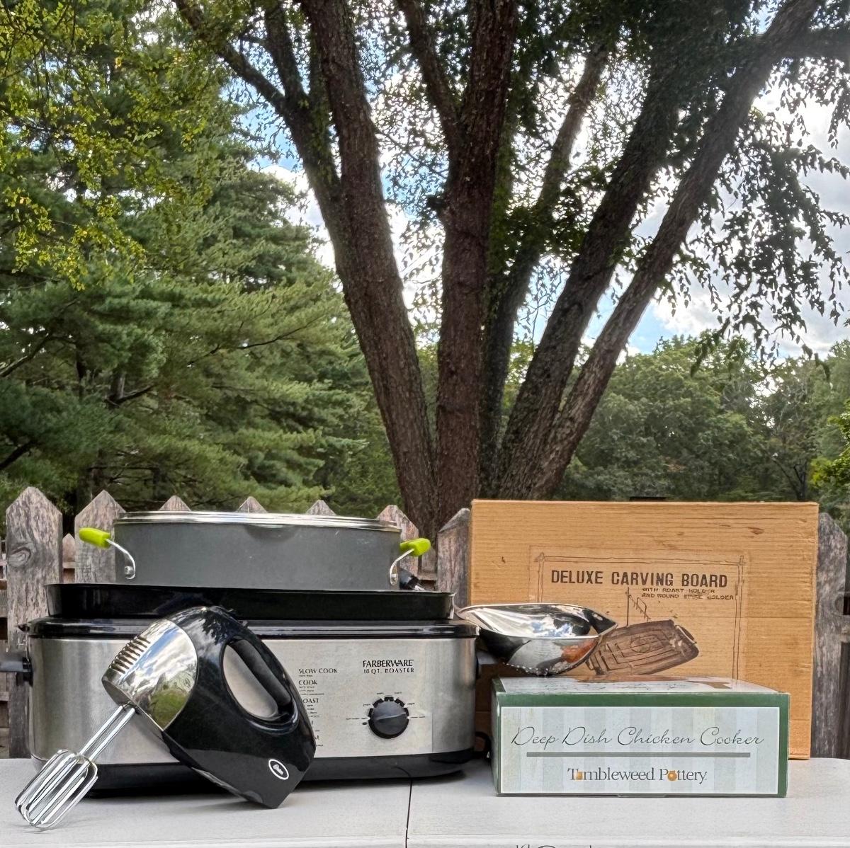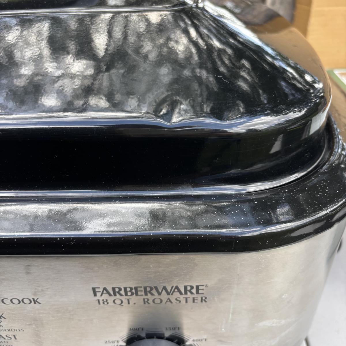 LOT 29: Farberware Roaster FSR180, Tumbleweed Pottery Chicken Cooker, Carving Board, Oster Mixer & More