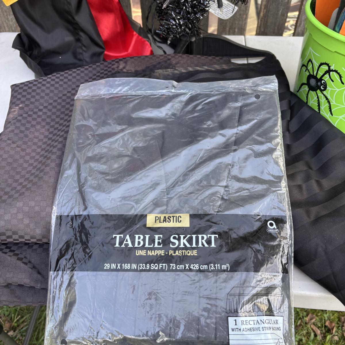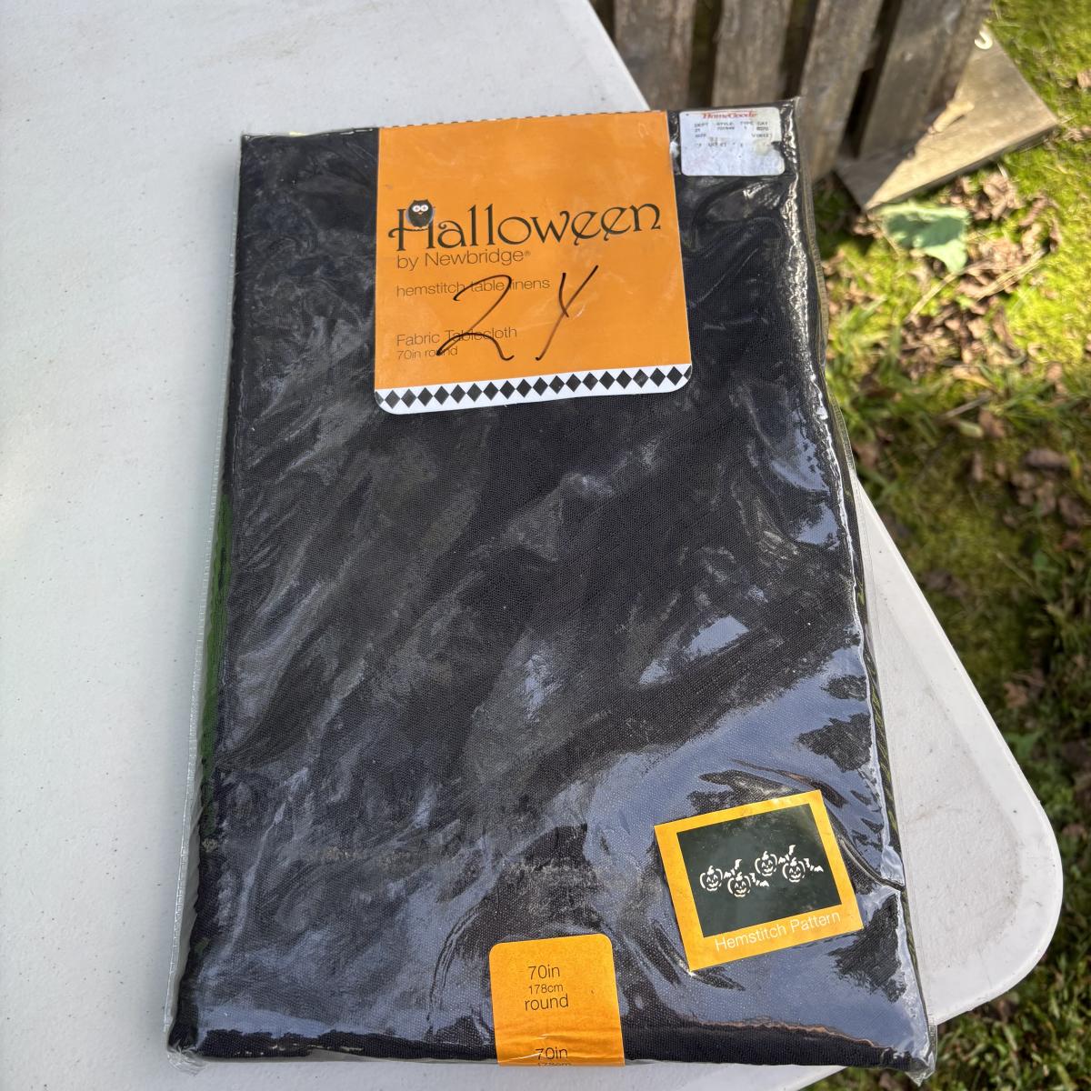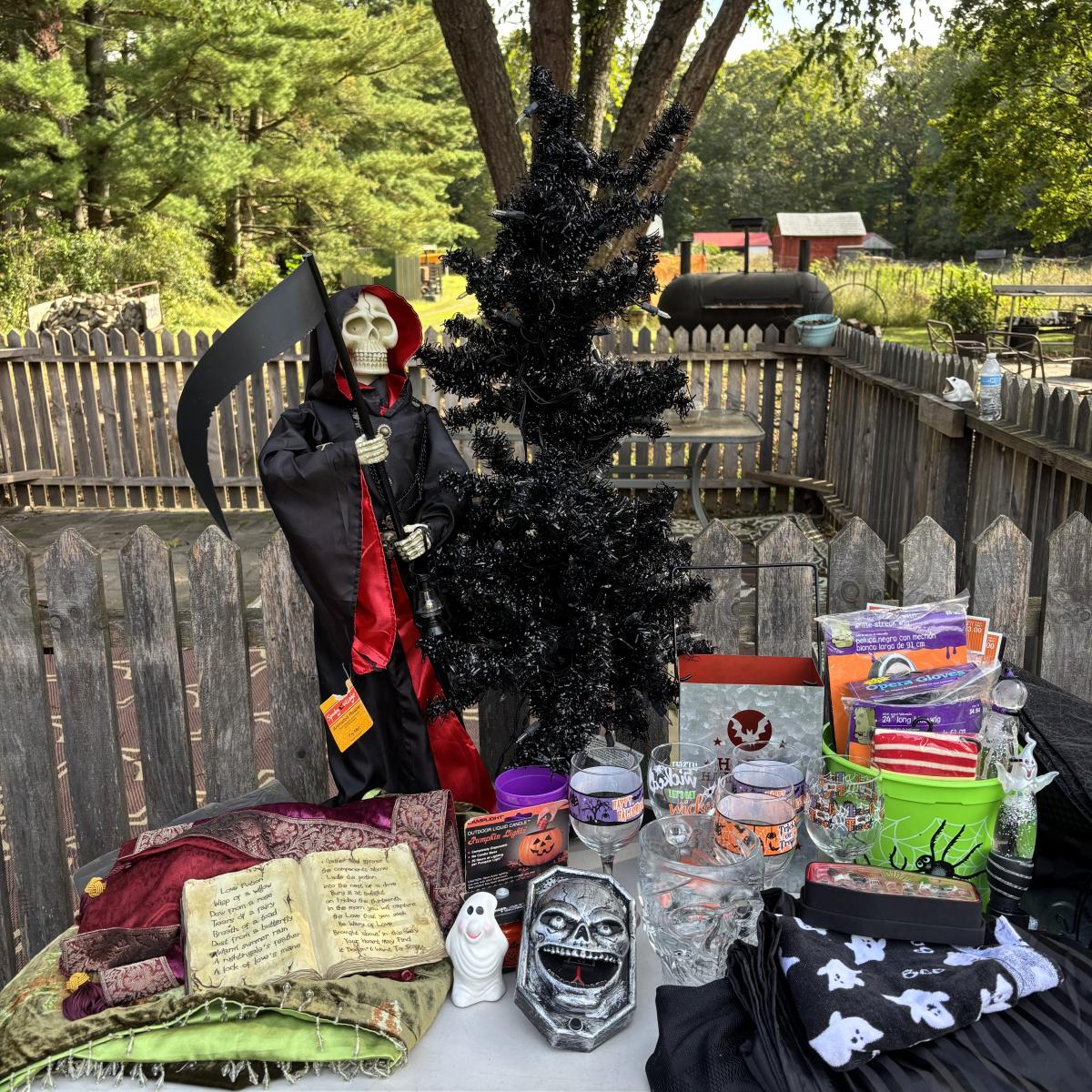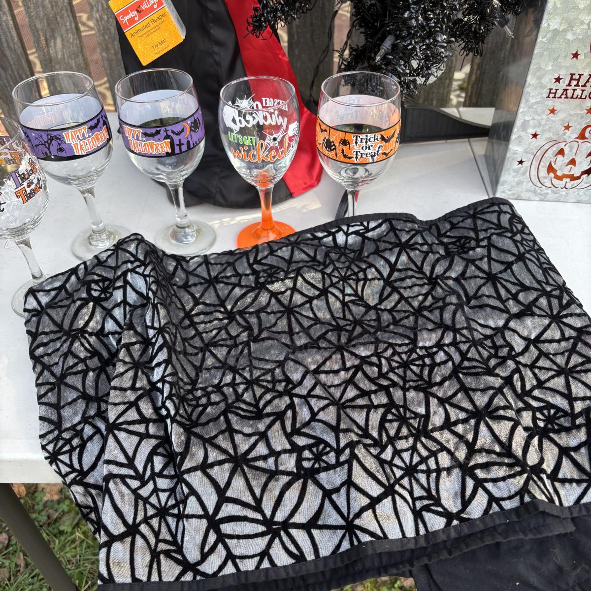 LOT 43: Halloween Decor & More: Tablecloths, Black Christmas Tree, Wine Glasses, Grim Reaper and More