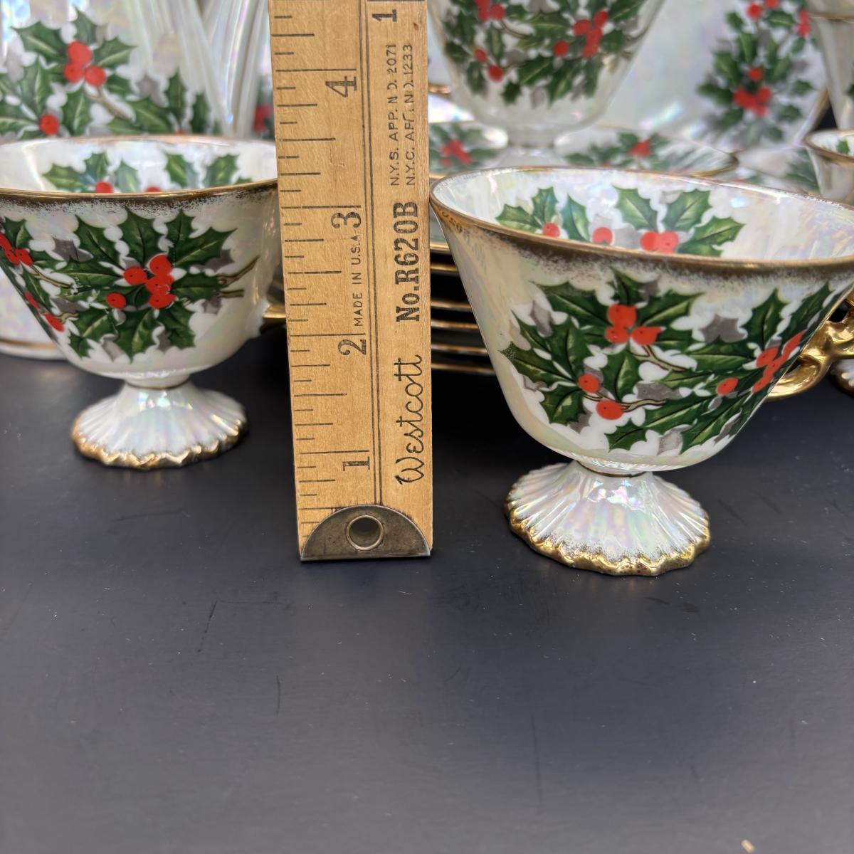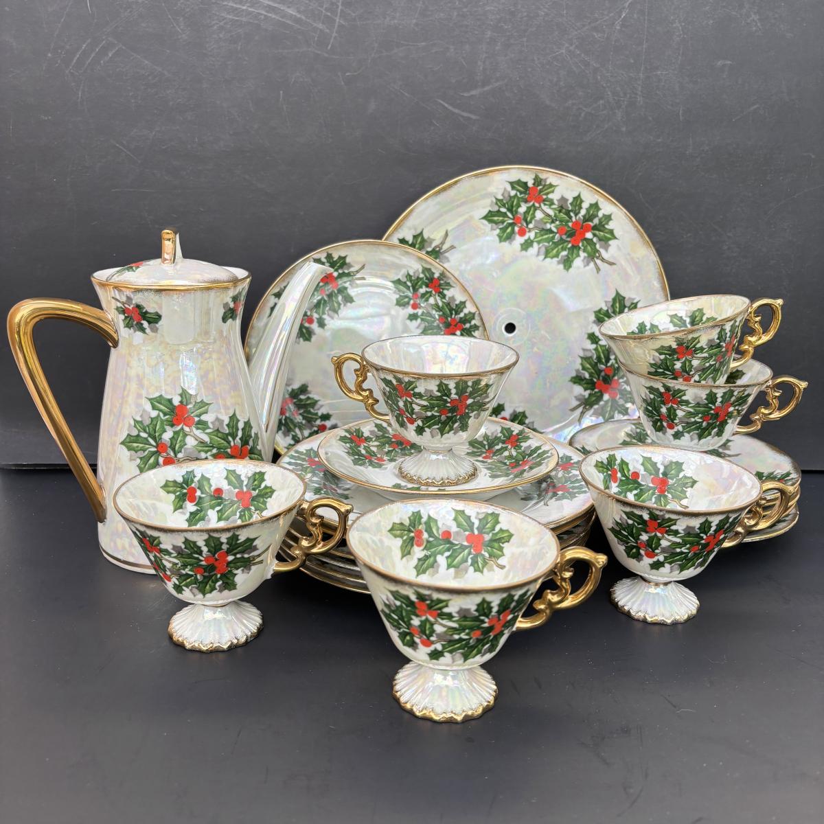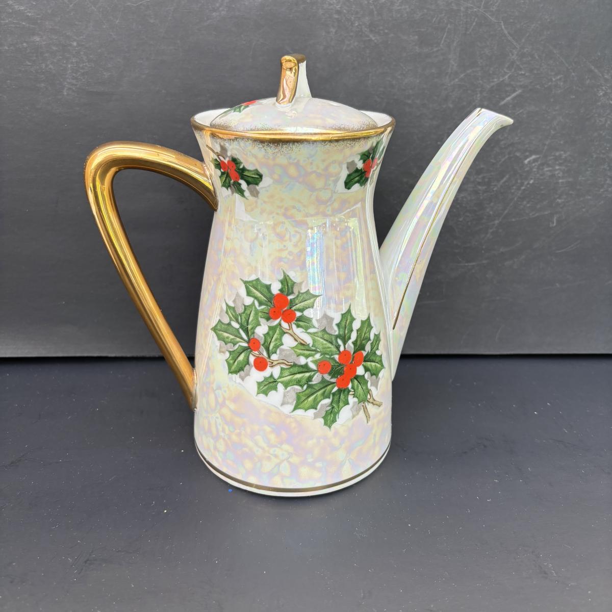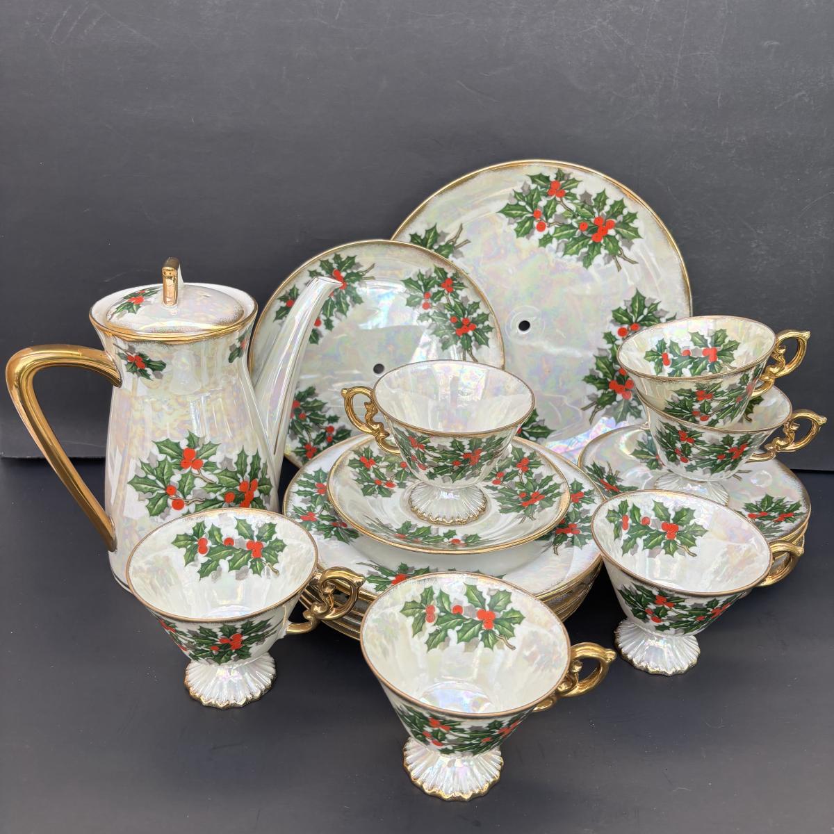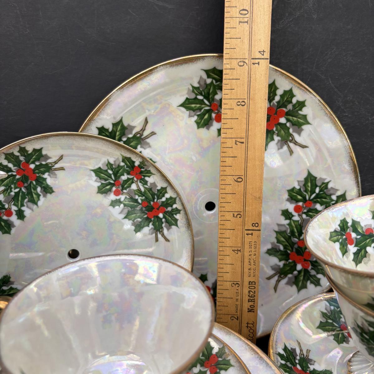 LOT 45: Vintage Ucagco Japan Holly and Berries Lusterware Christmas: Tea Pot, Teacups & More