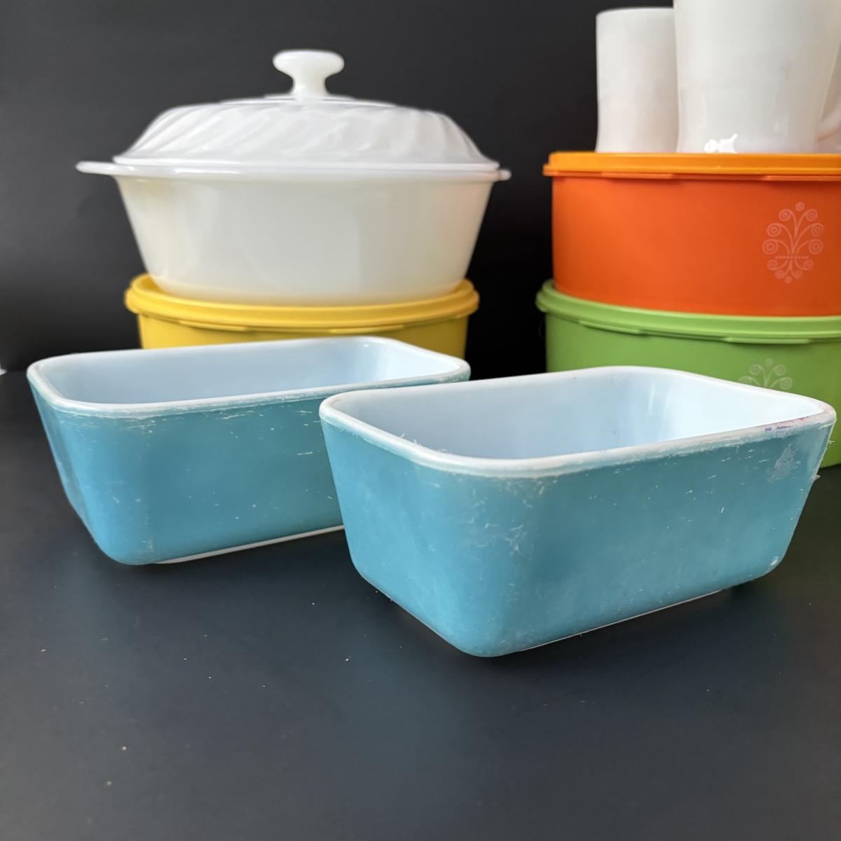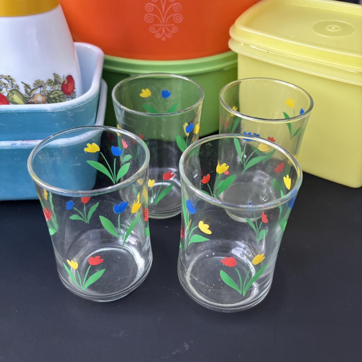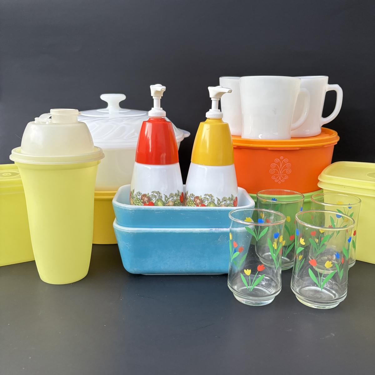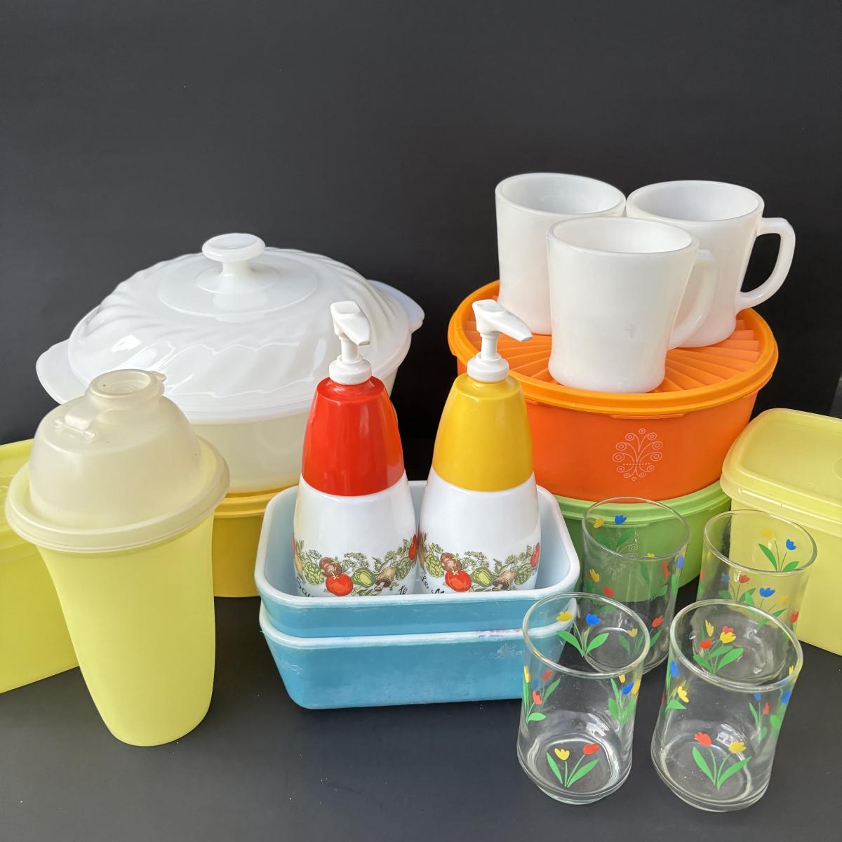 LOT 50: Vintage Kitchen: Pyrex, Anchor Hocking Fire King, Corning Ware Spice of Life, Tupperware, Juice Glasses