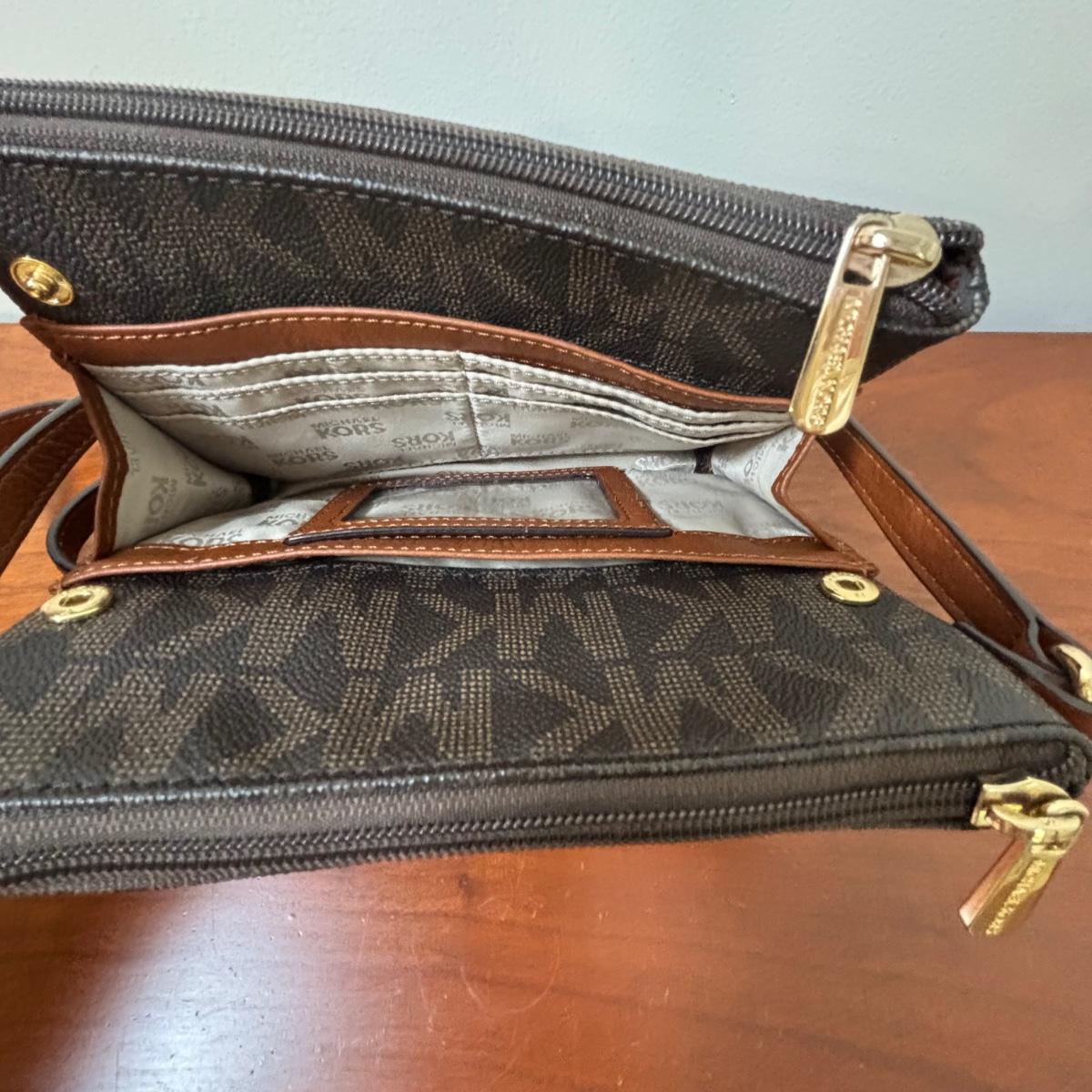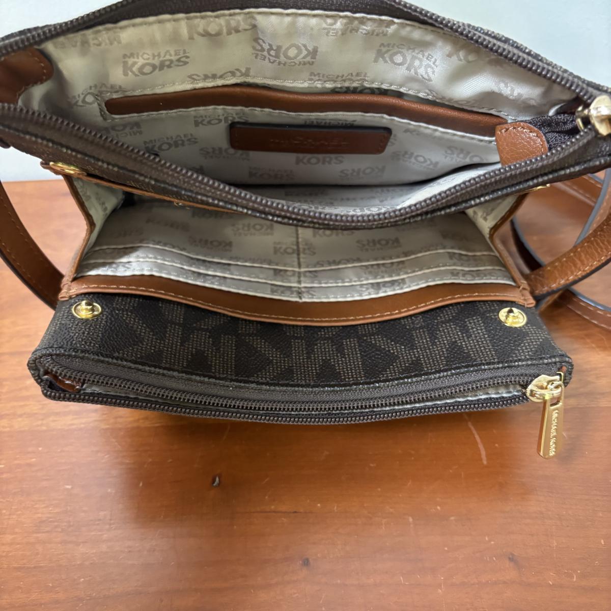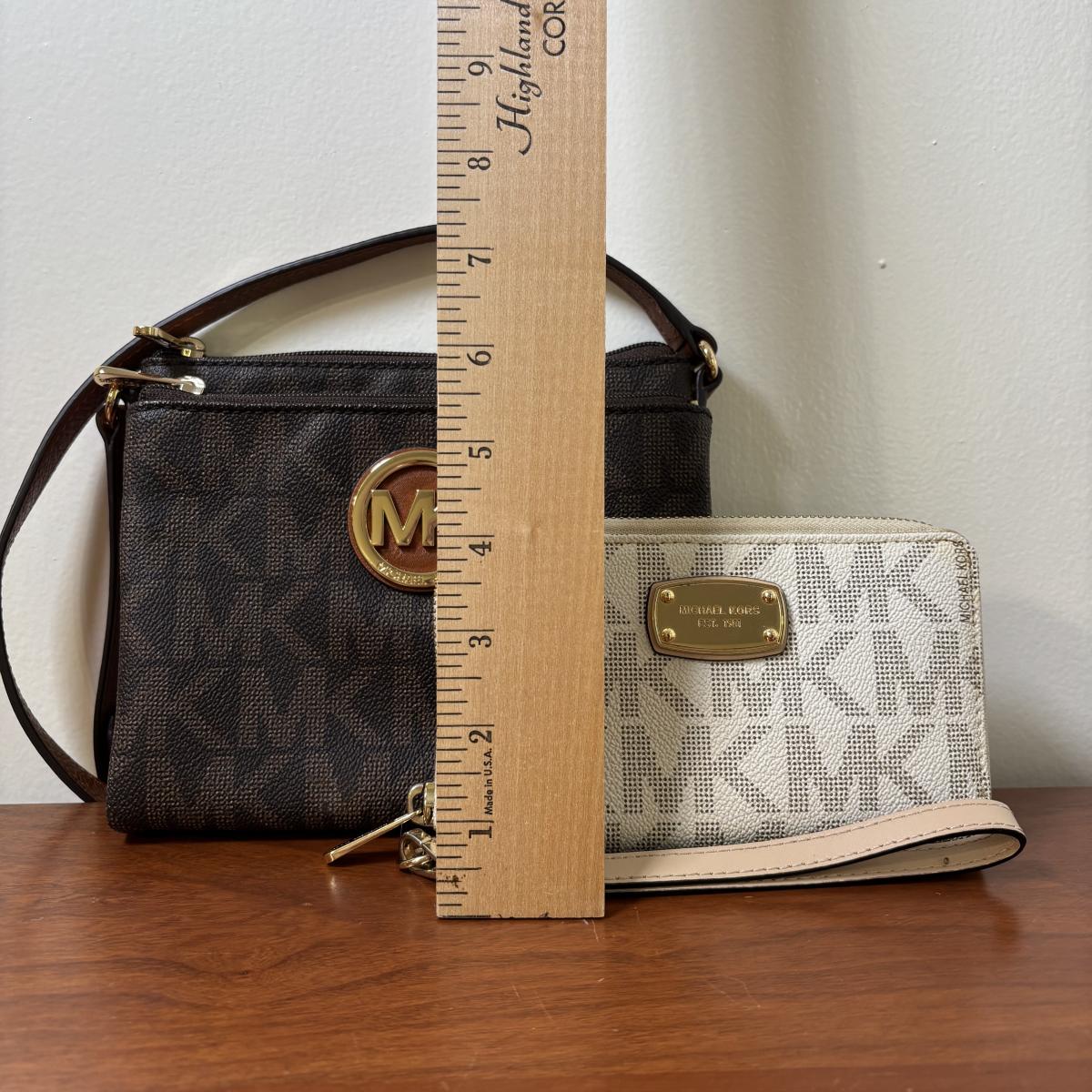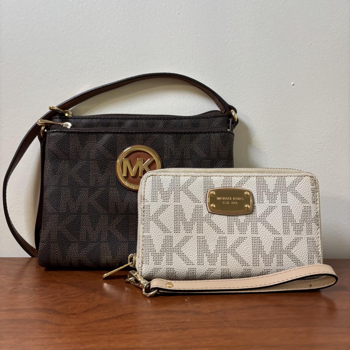LOT 61: Michael Kors Jet Set Travel Medium Logo Crossbody Bag & Jet Set Continental Wallet in Vanilla Signature Print
