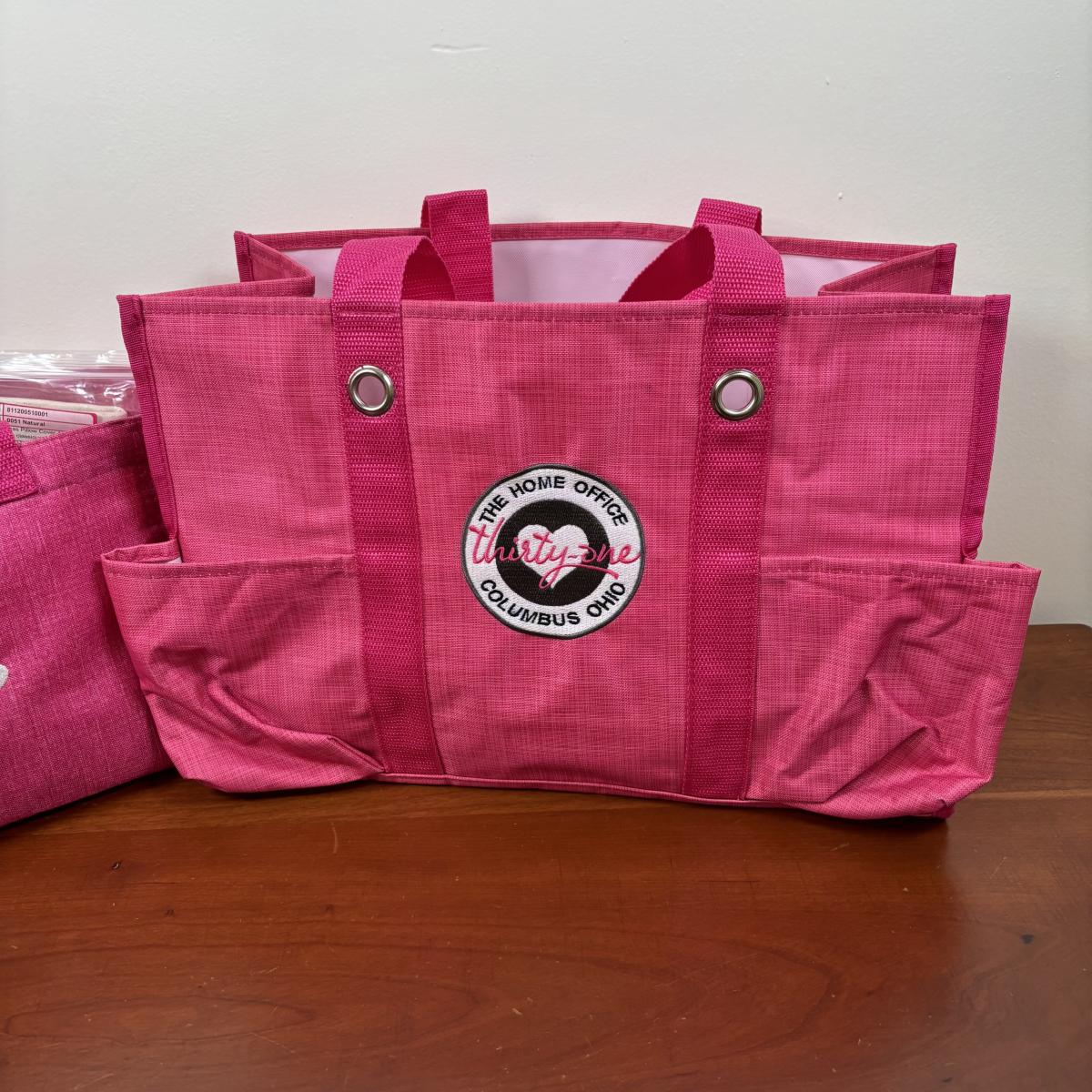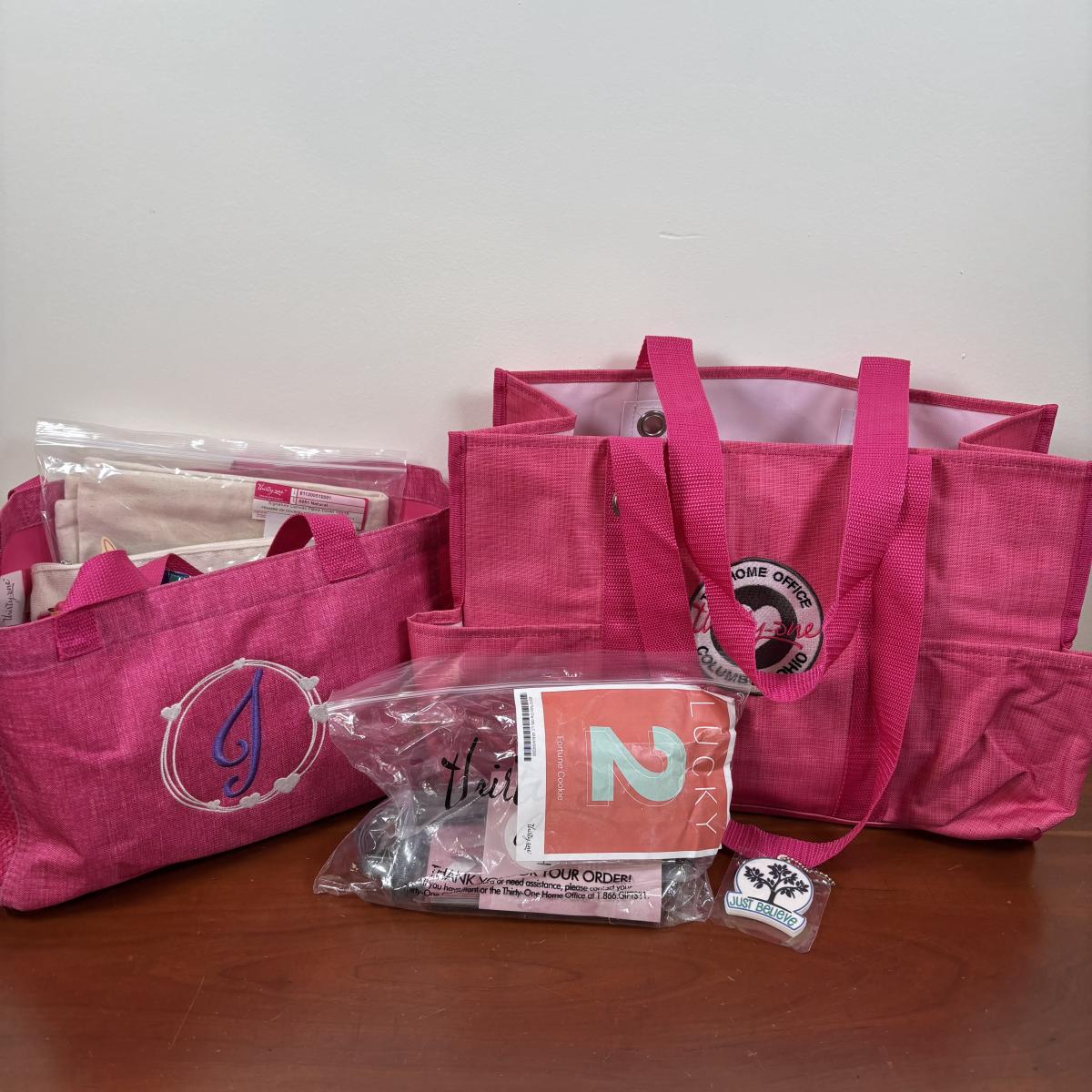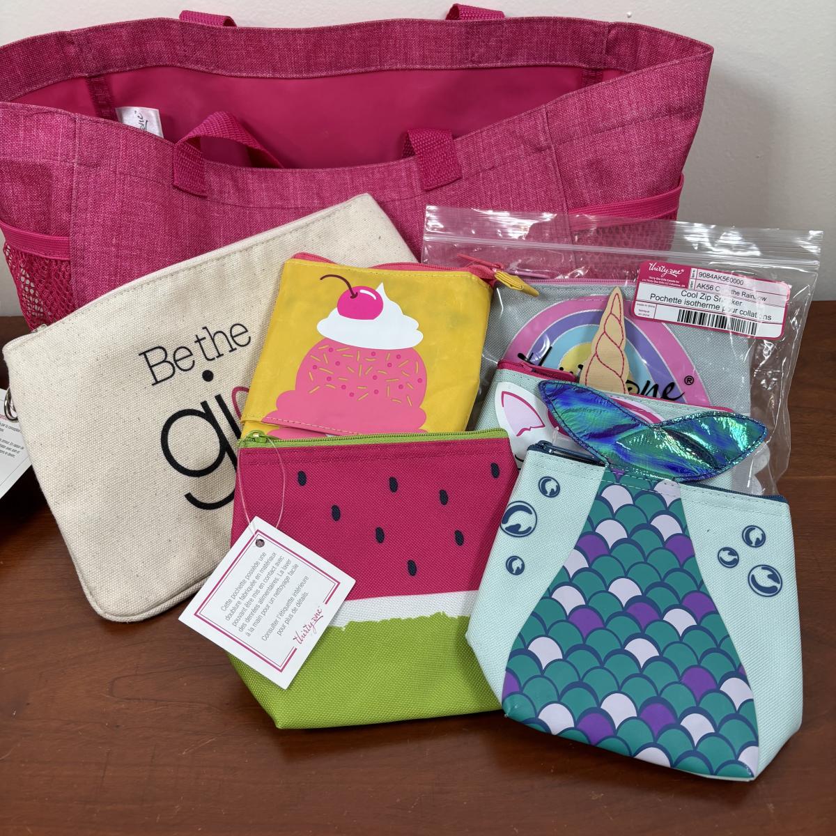 LOT 108: Thirty-One Monogrammed Utility Tote Bags, Cool Zip Snacker Bags & Signature Canvas Shine Bright Pillow Cover