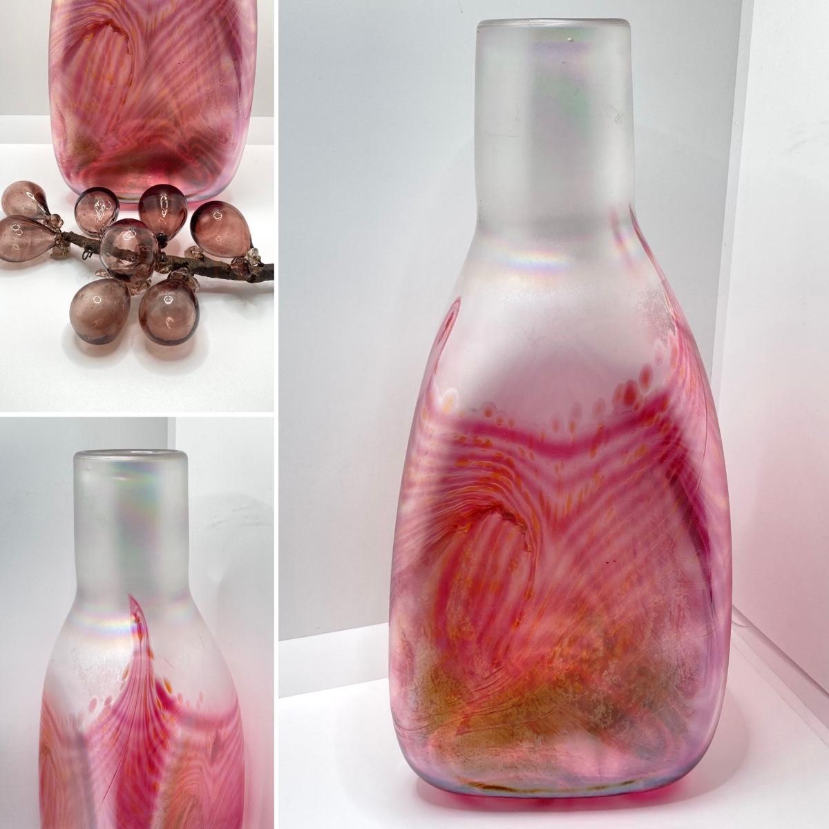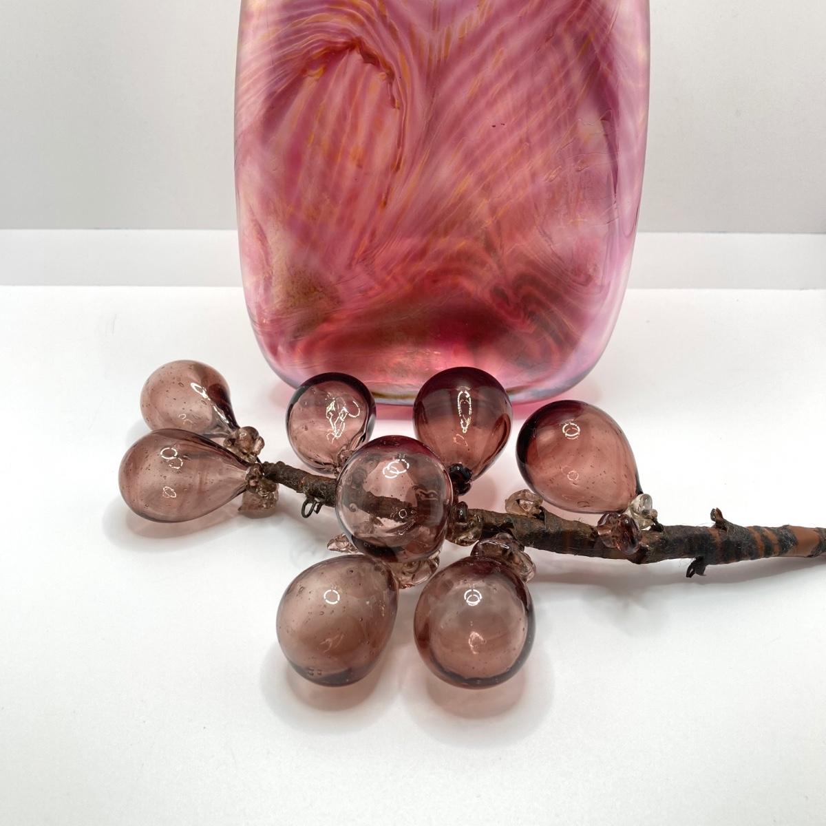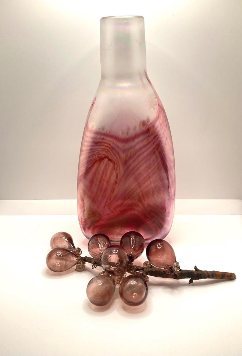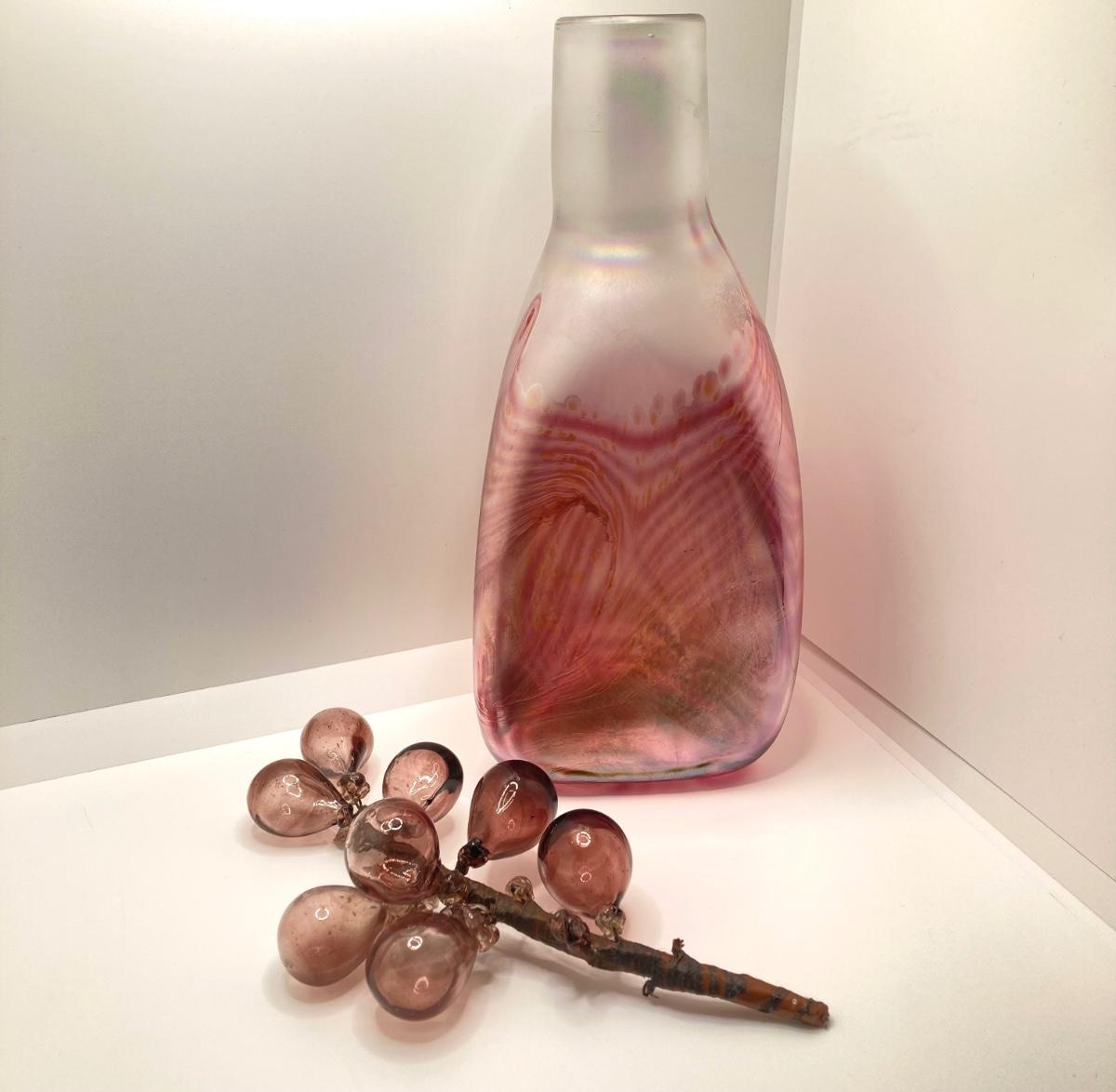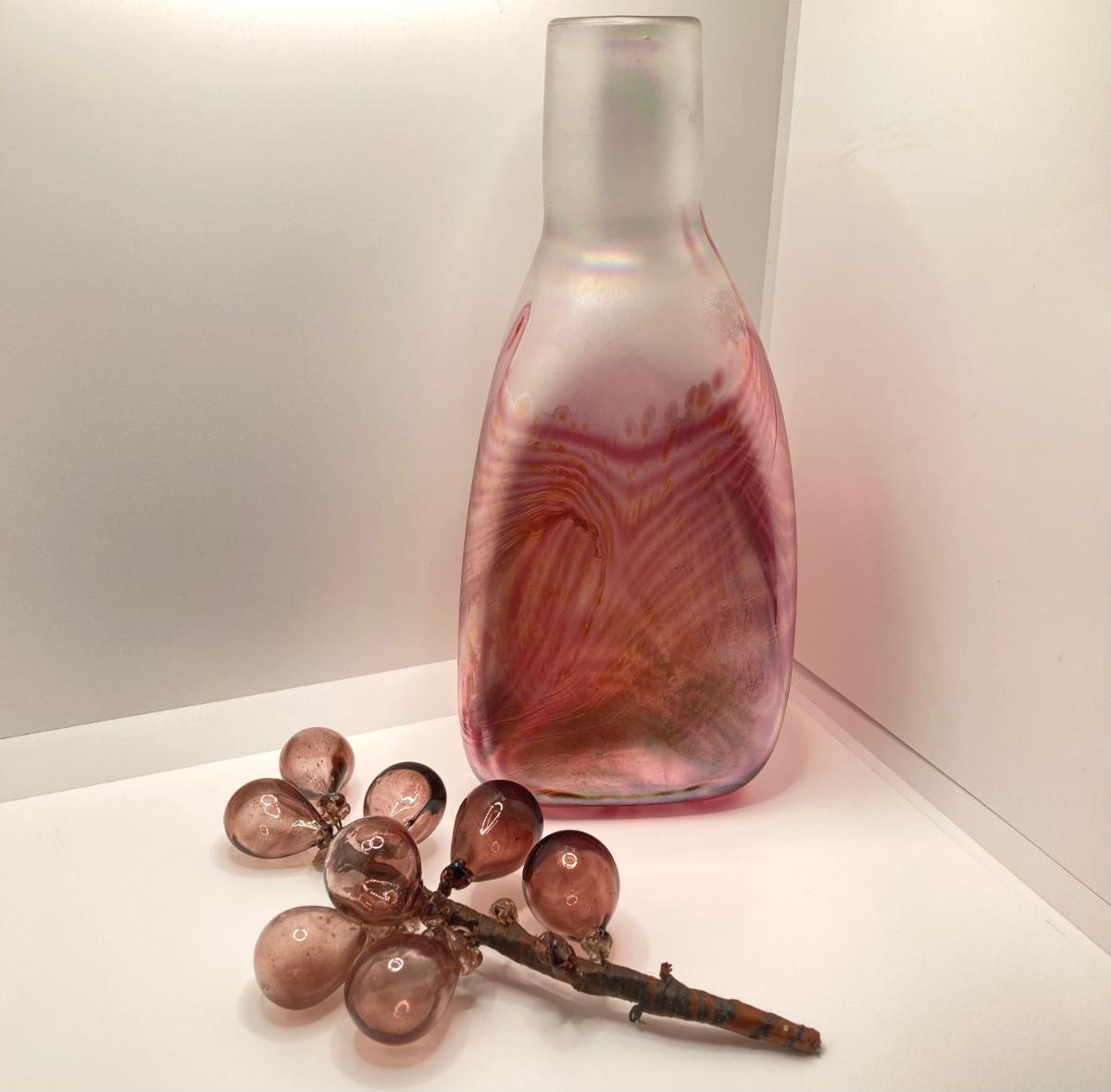LOT 139: Vintage Wheaton Village Iridescent Art Glass Bottle (WV '04) and Glass Grapes