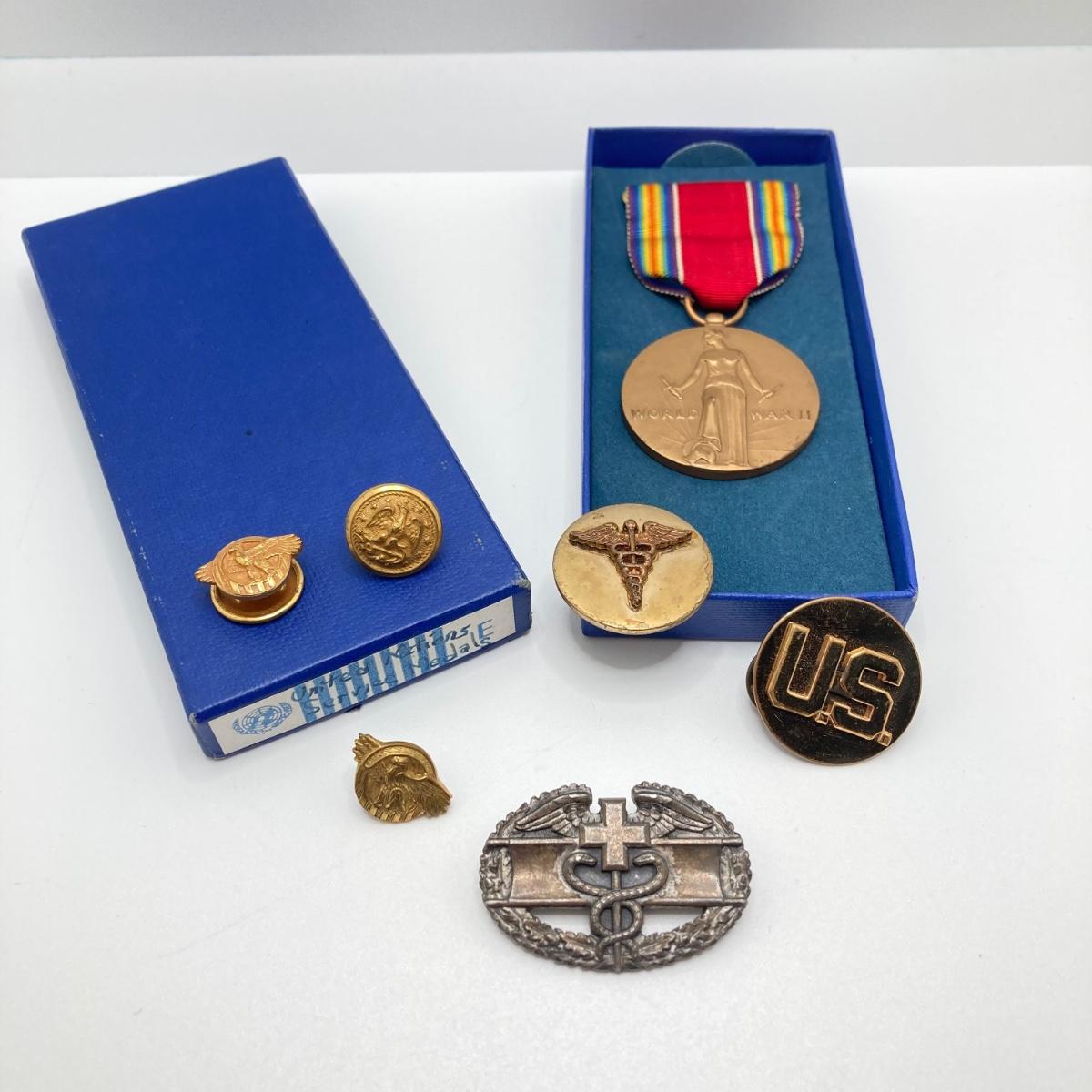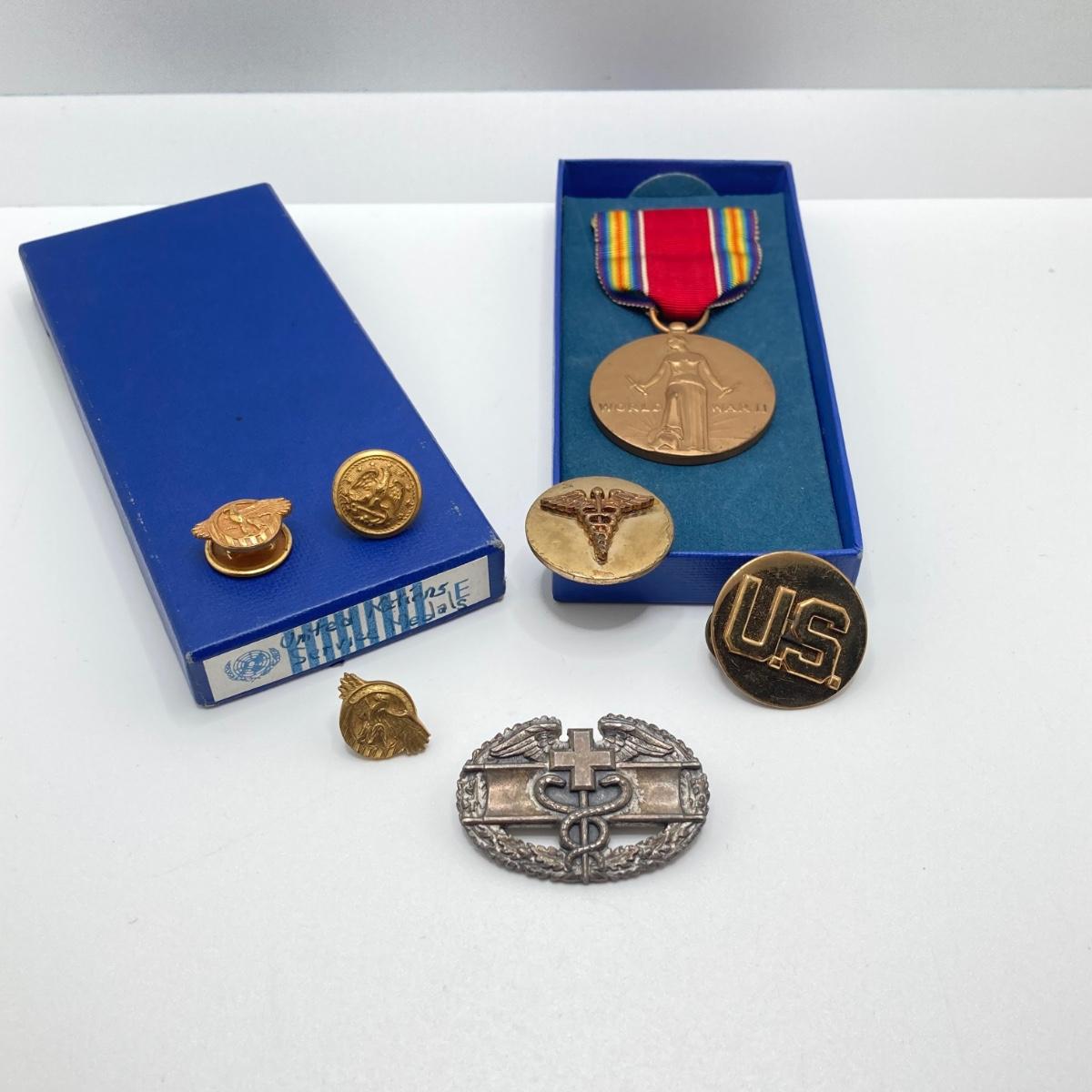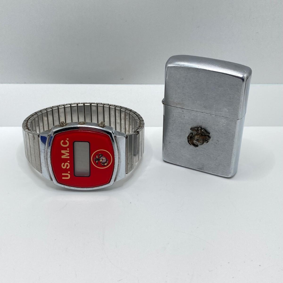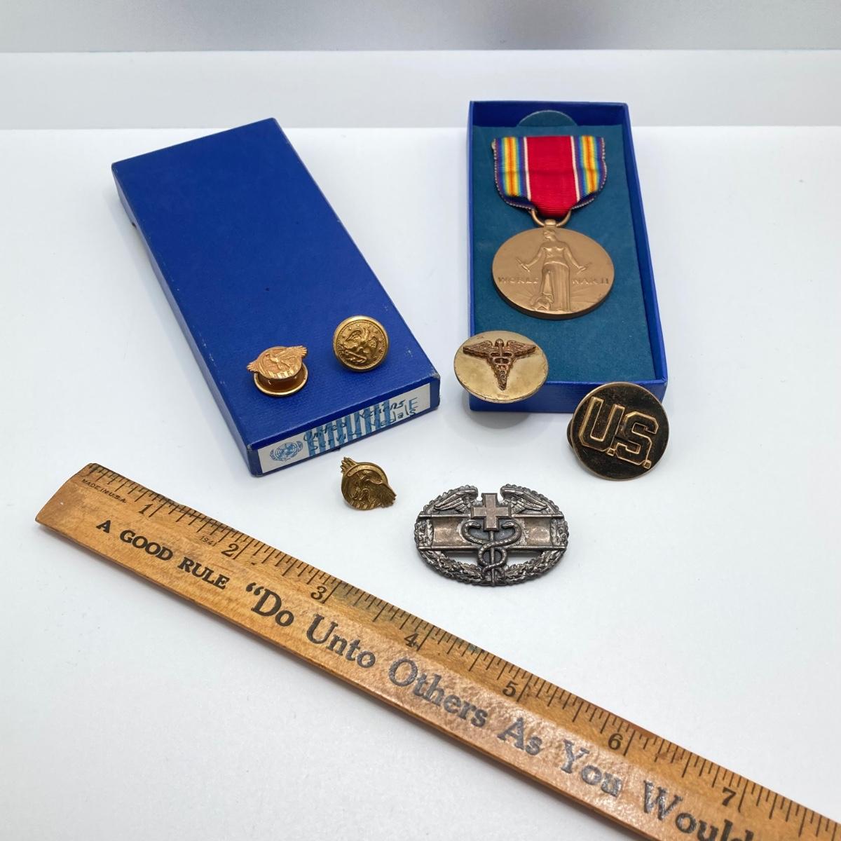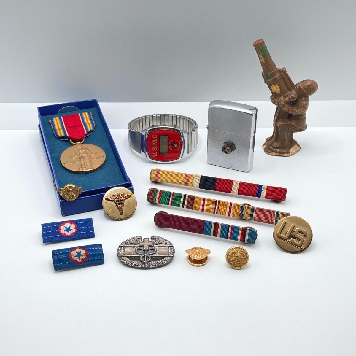 LOT 140: Vintage Military Collection - Zippo Lighter, Toy Soldier, Medal / Ribbons, Watch and Pins