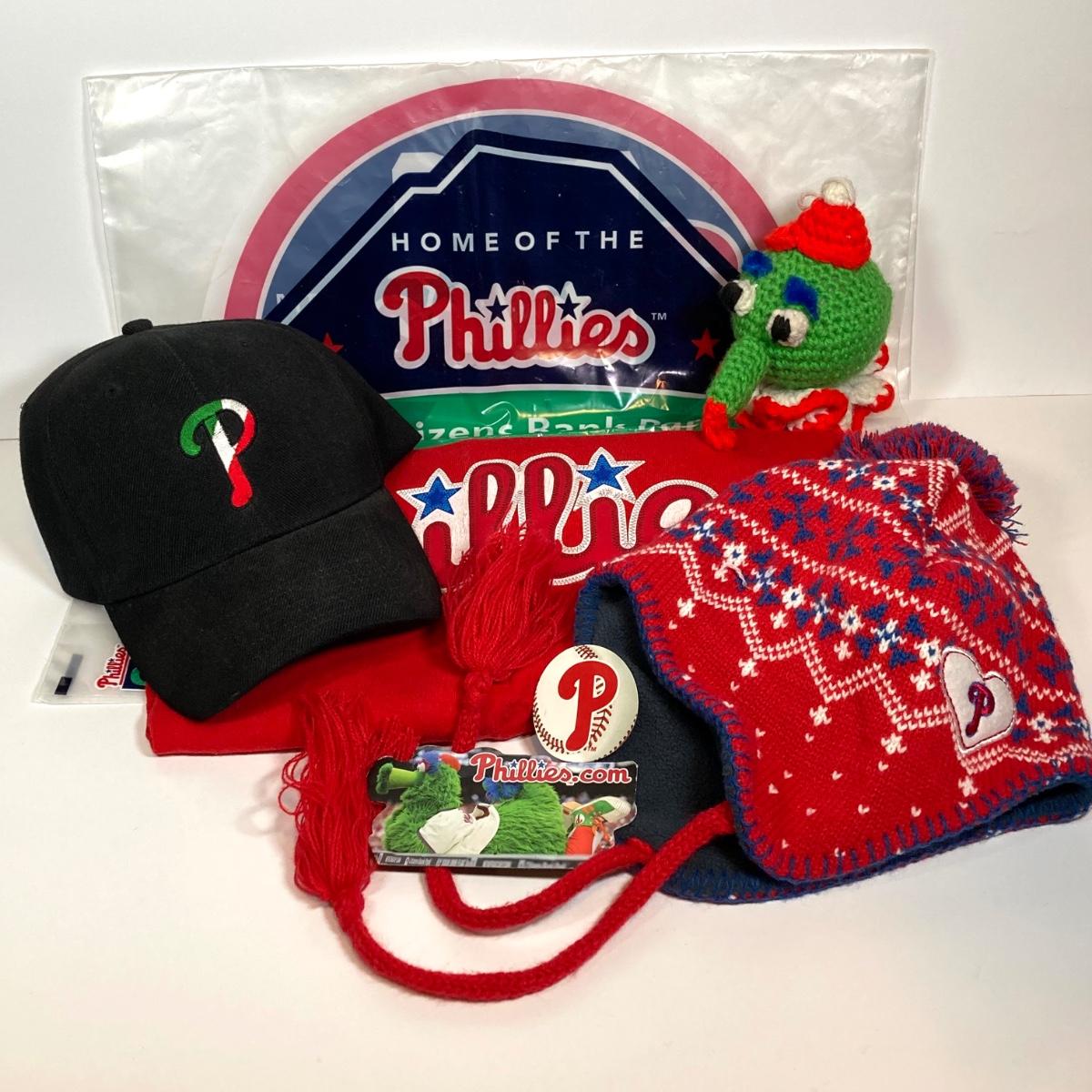 LOT 146: Vintage Philadelphia Phillies Collection - Youth Tackle Twill Jim Thome #25 T-Shirt, Crocheted Phanatic, Italian Baseball Cap, Knit Hat and More