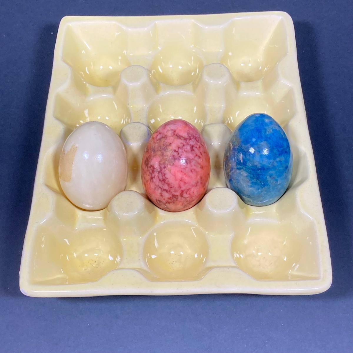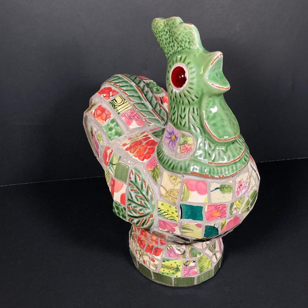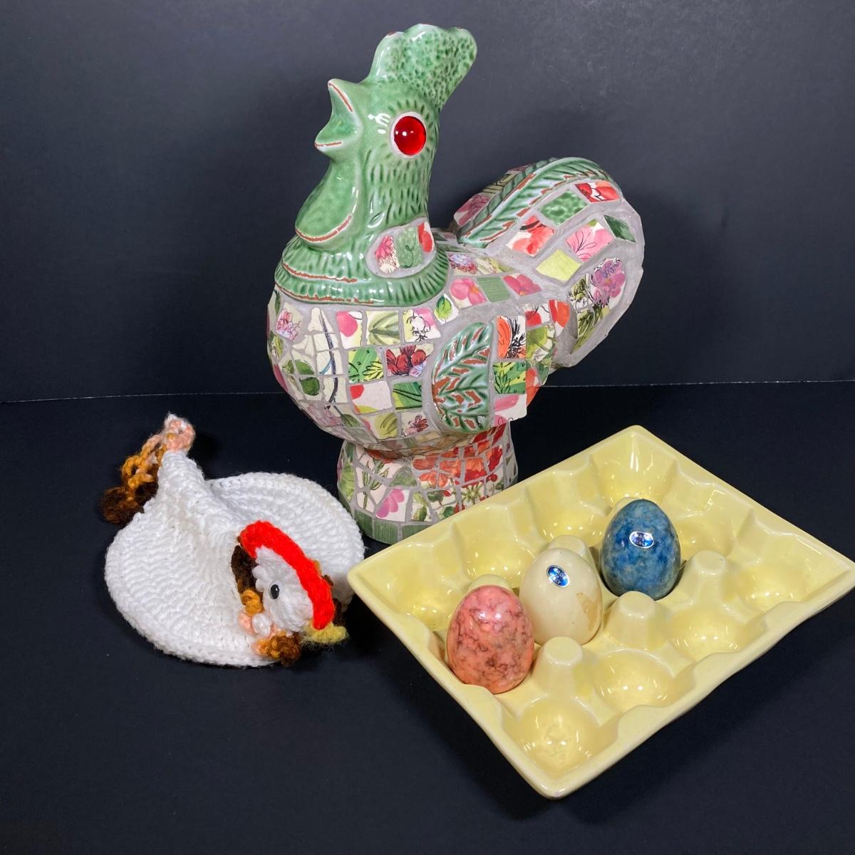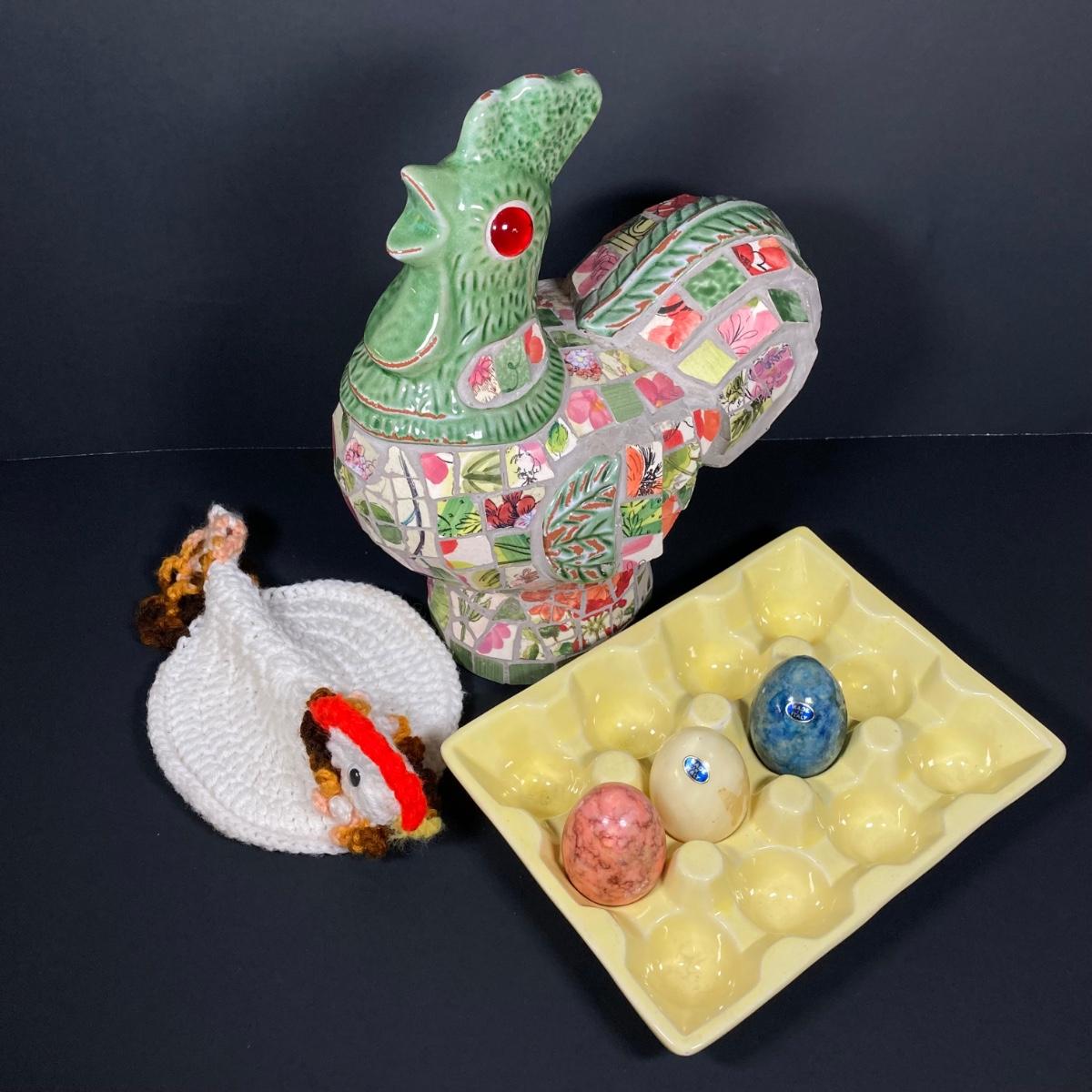 LOT 149: The Chicken and The Egg - Mosaic Decorative Hen, Onyx Eggs in Ceramic Holder and Crocheted Pot Holder