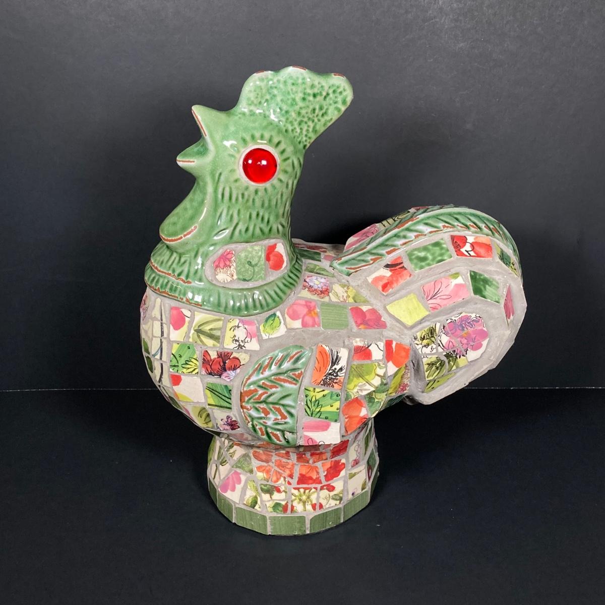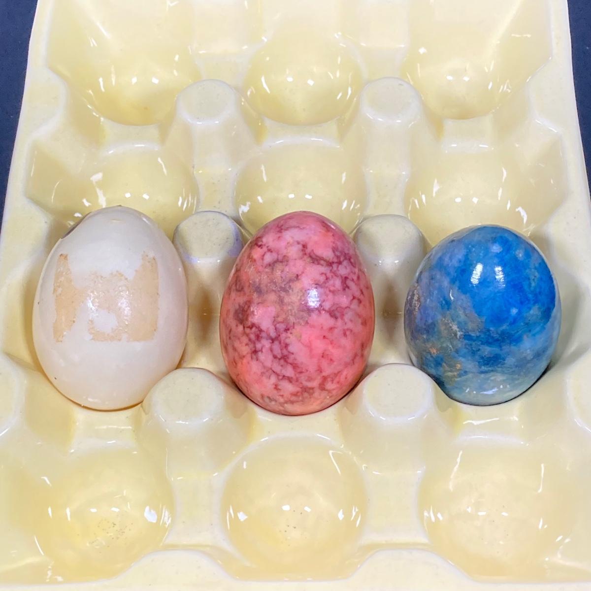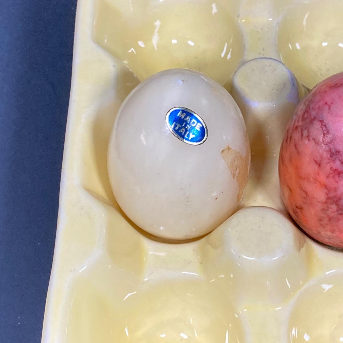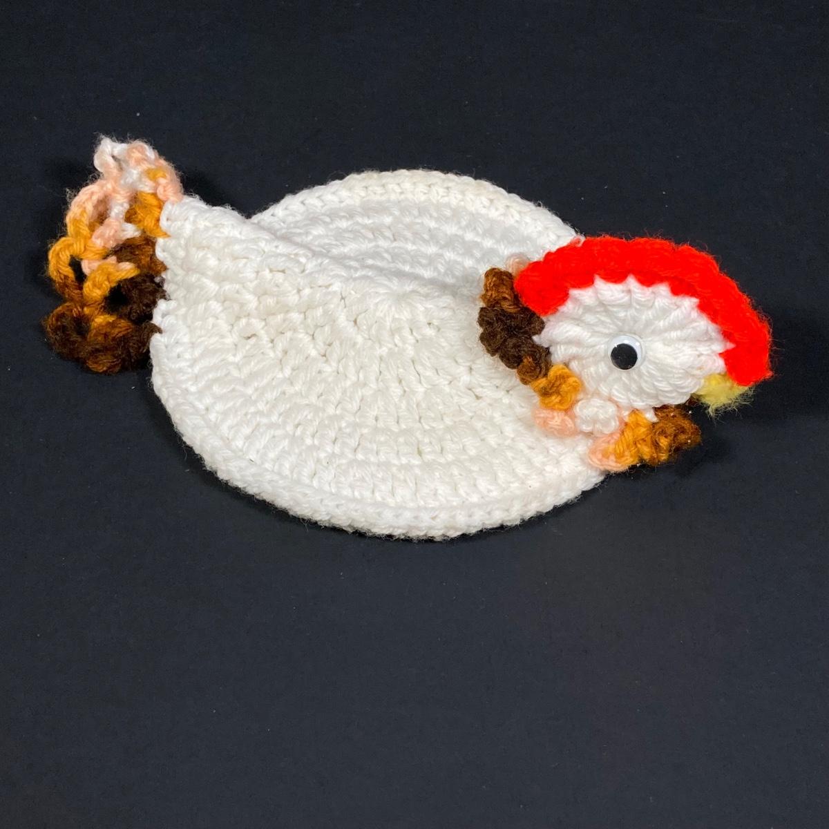 LOT 149: The Chicken and The Egg - Mosaic Decorative Hen, Onyx Eggs in Ceramic Holder and Crocheted Pot Holder