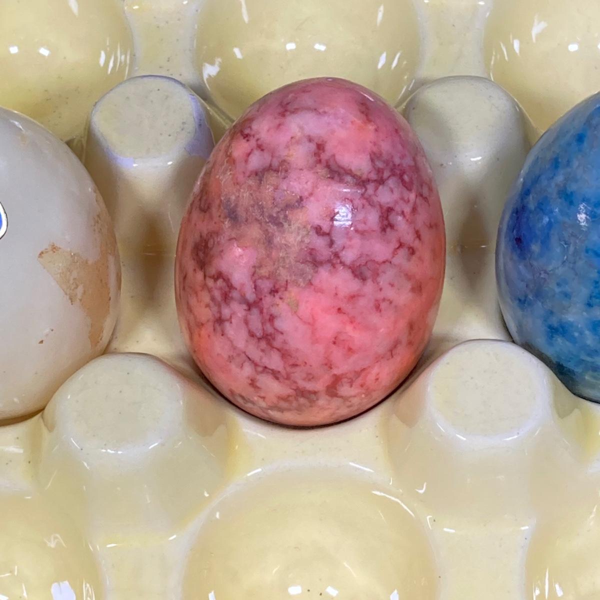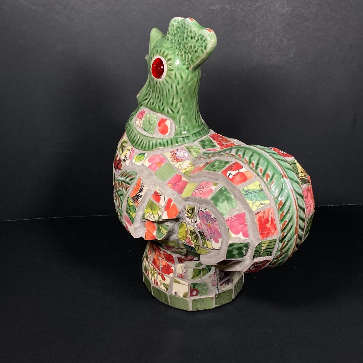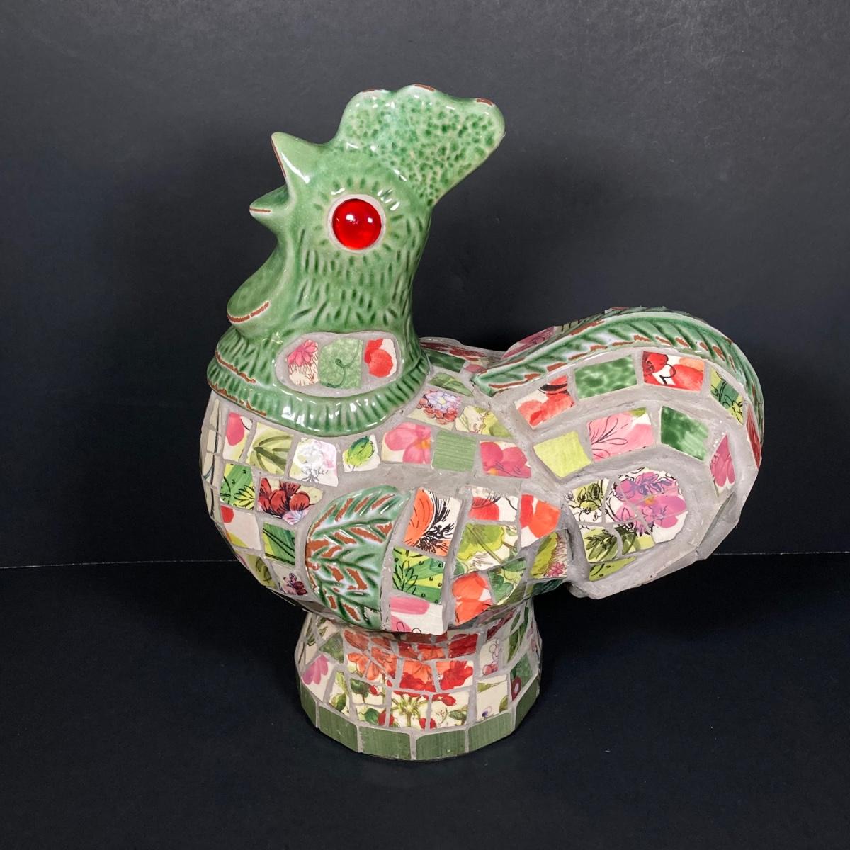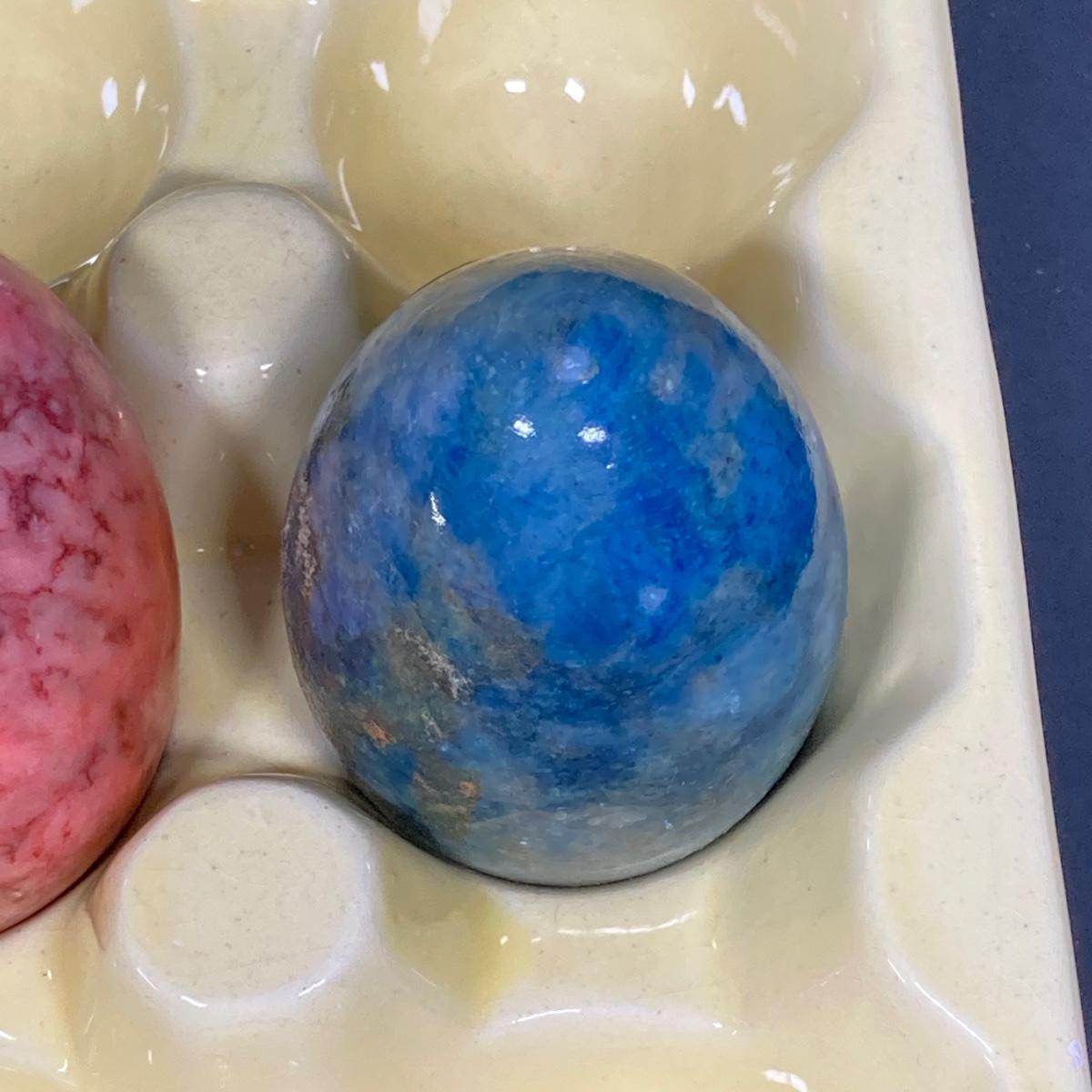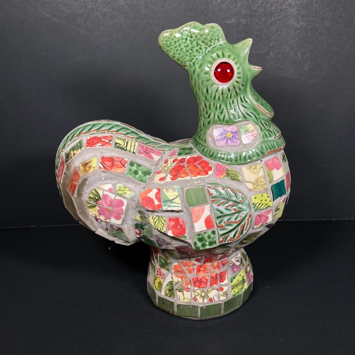 LOT 149: The Chicken and The Egg - Mosaic Decorative Hen, Onyx Eggs in Ceramic Holder and Crocheted Pot Holder