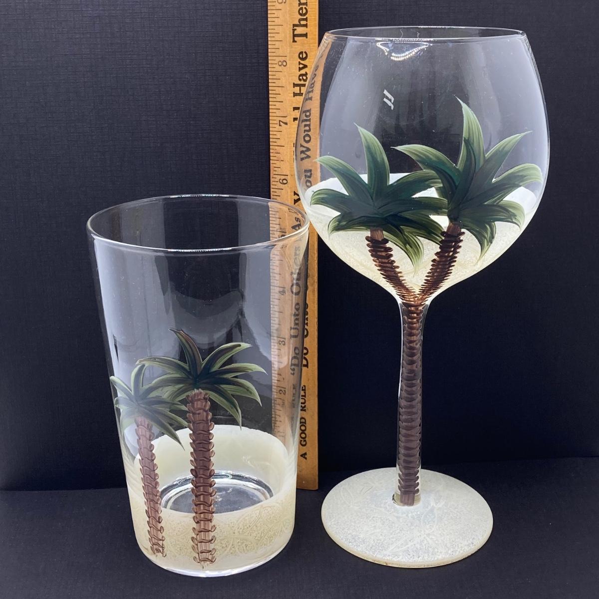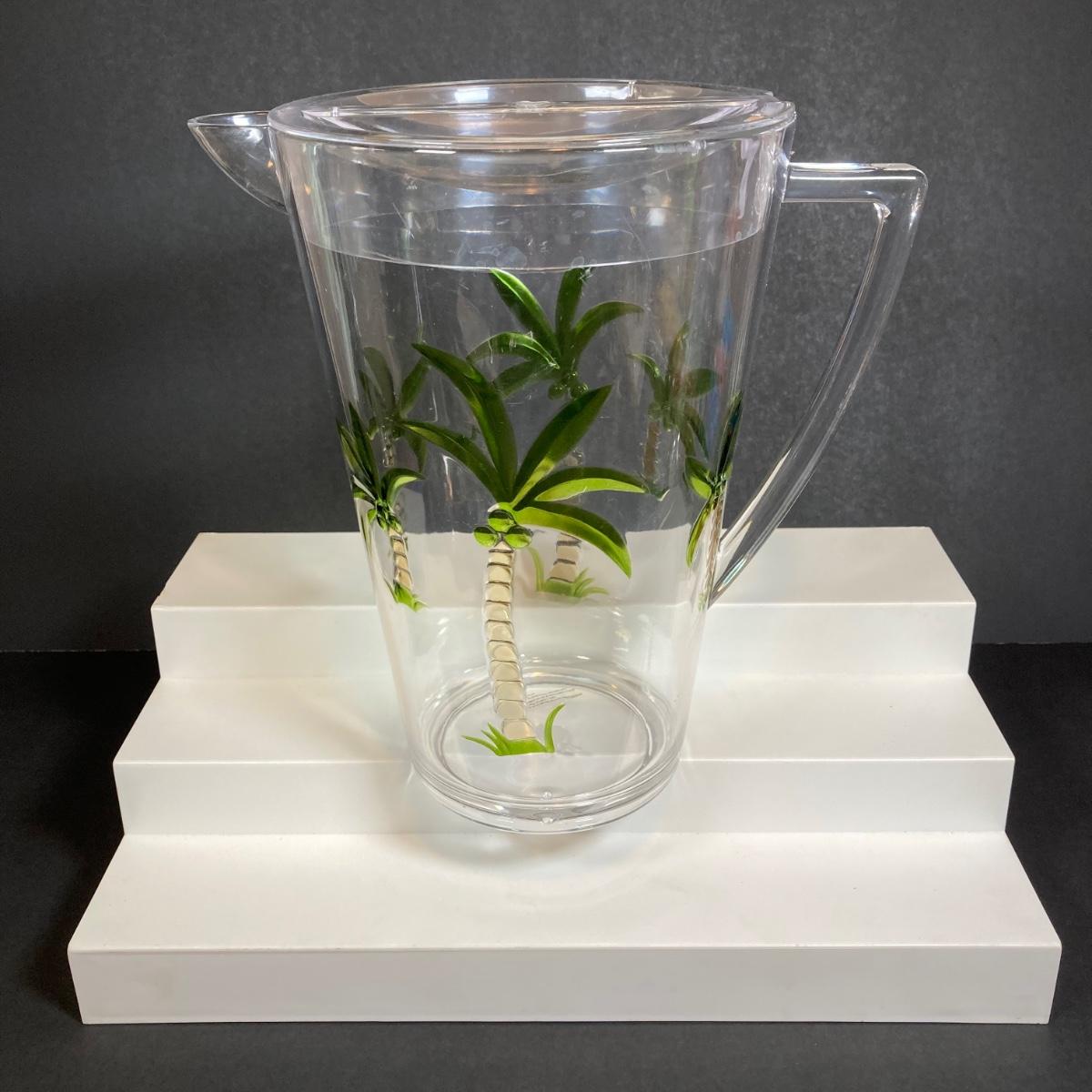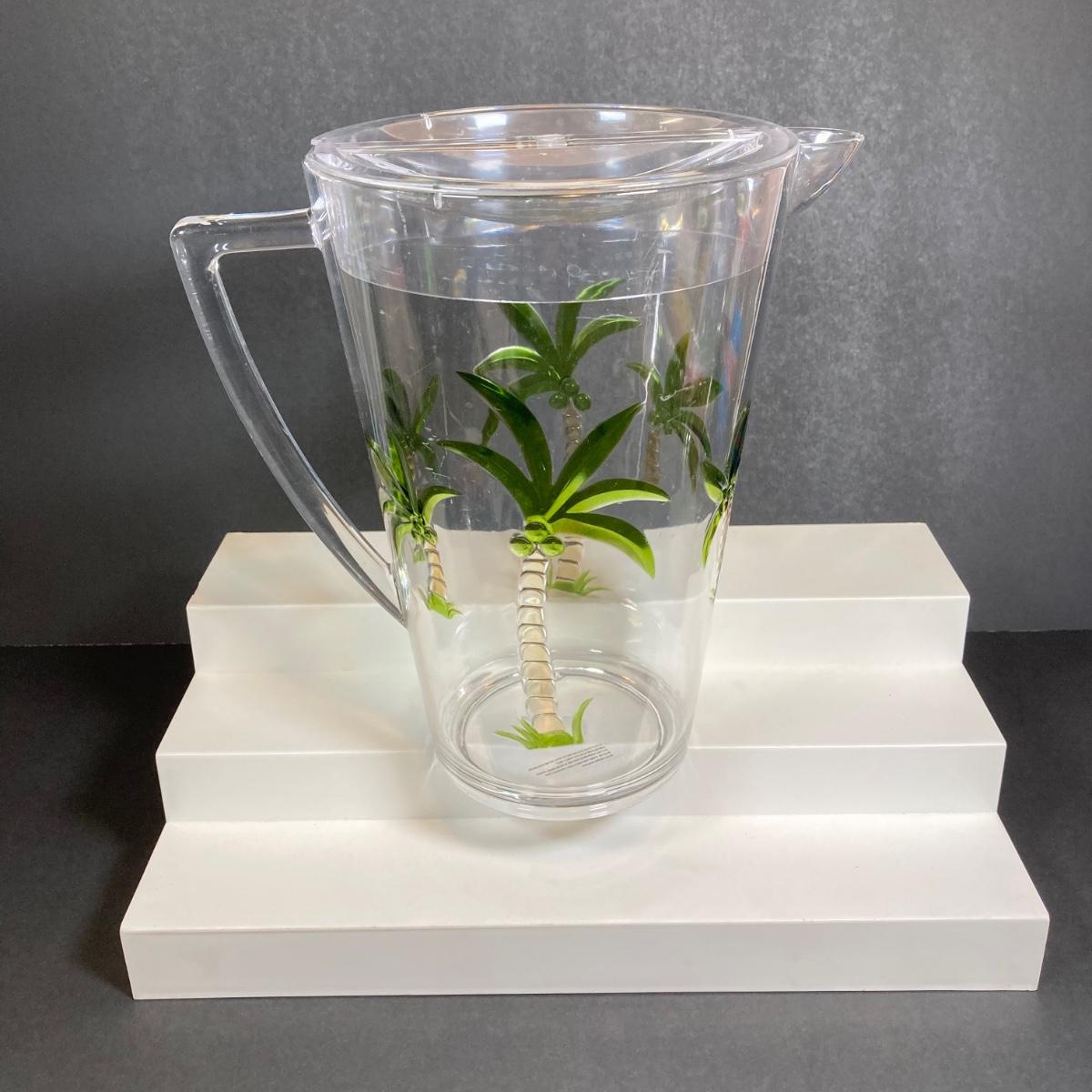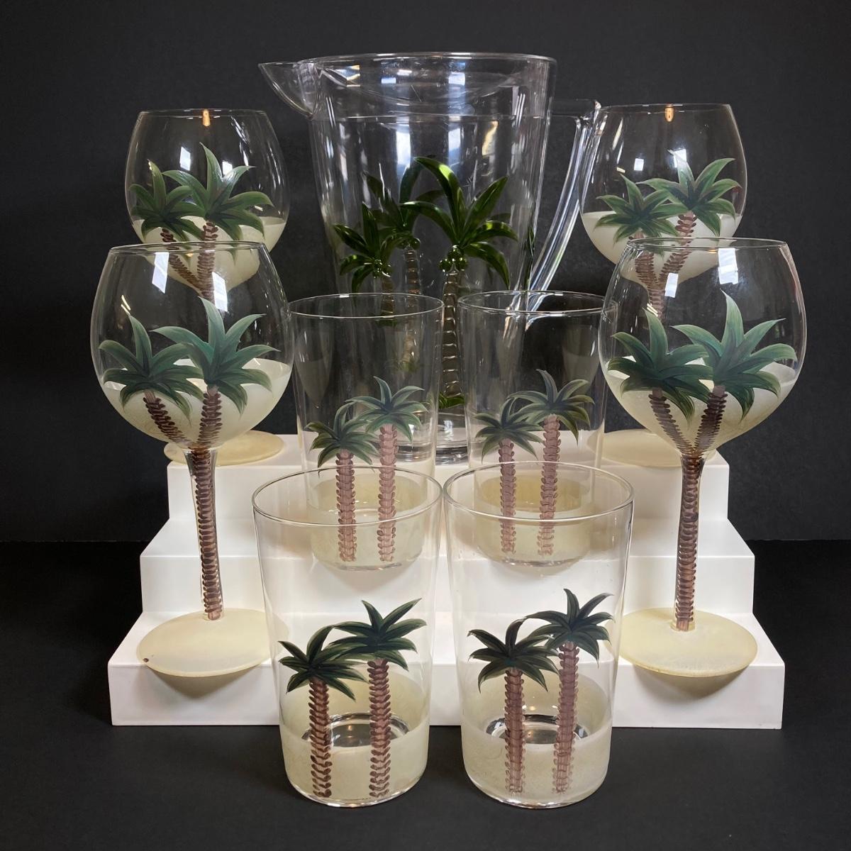 LOT 150: Tommy Bahama Style Palm Tree Drinking Glasses with Acrylic Pitcher