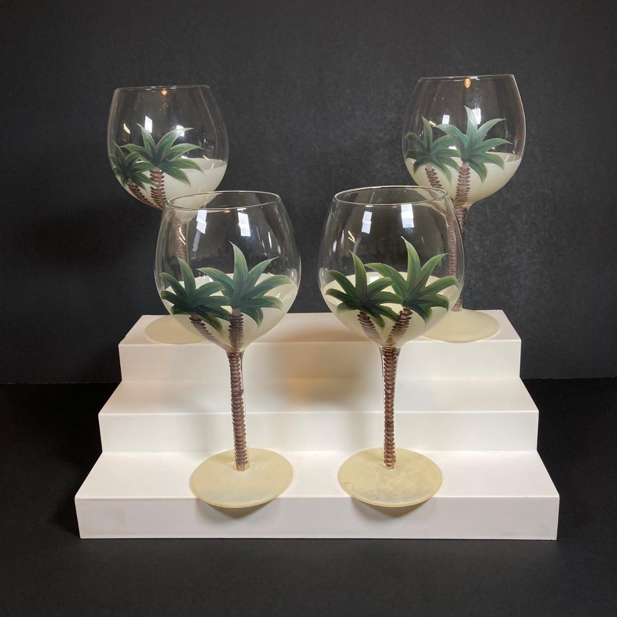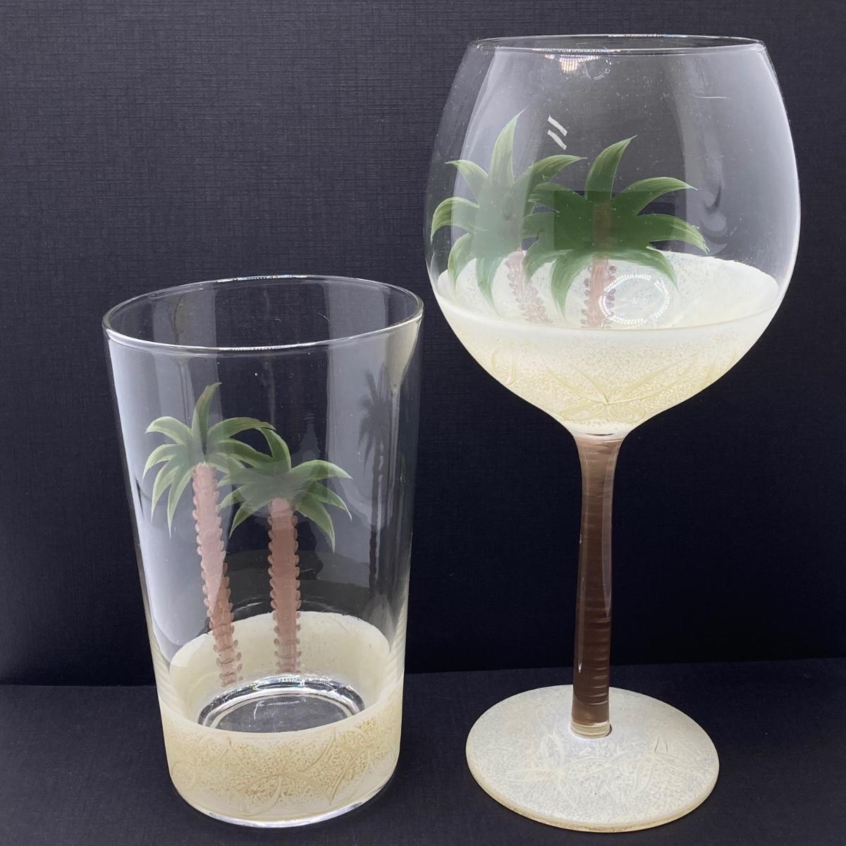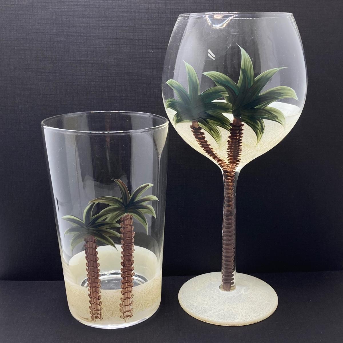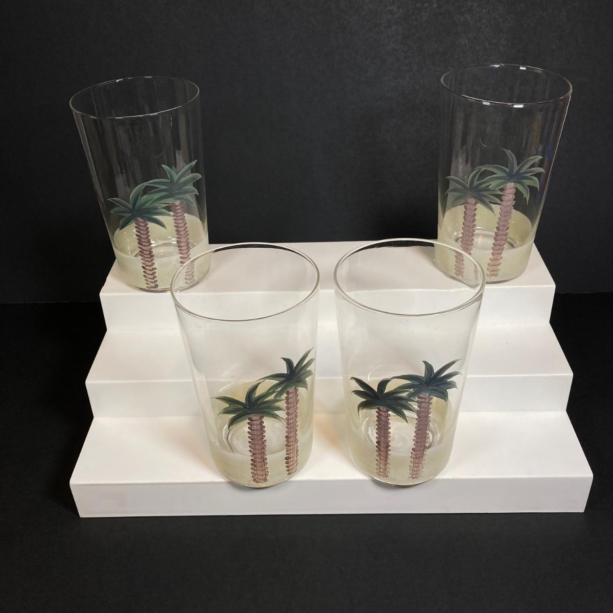 LOT 150: Tommy Bahama Style Palm Tree Drinking Glasses with Acrylic Pitcher