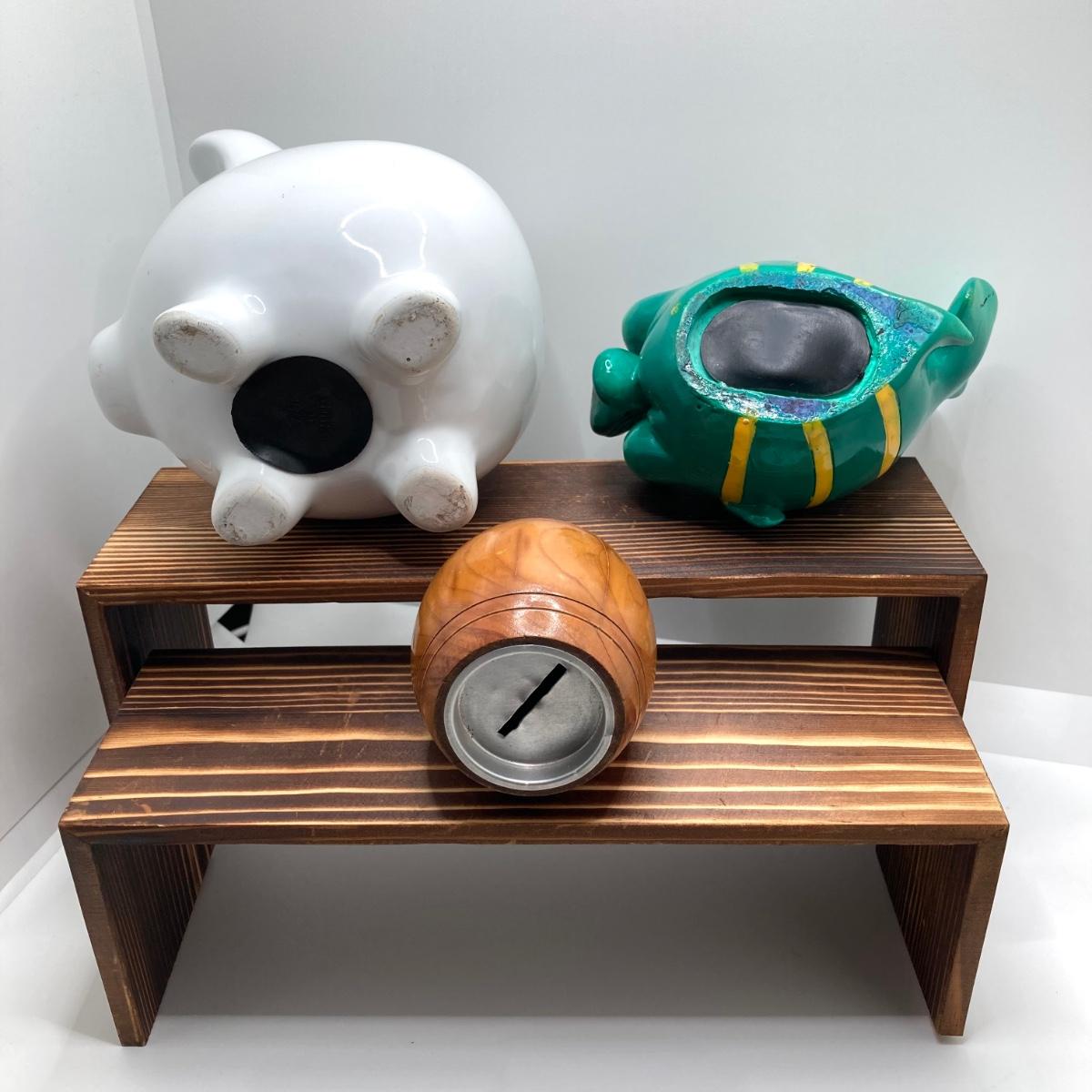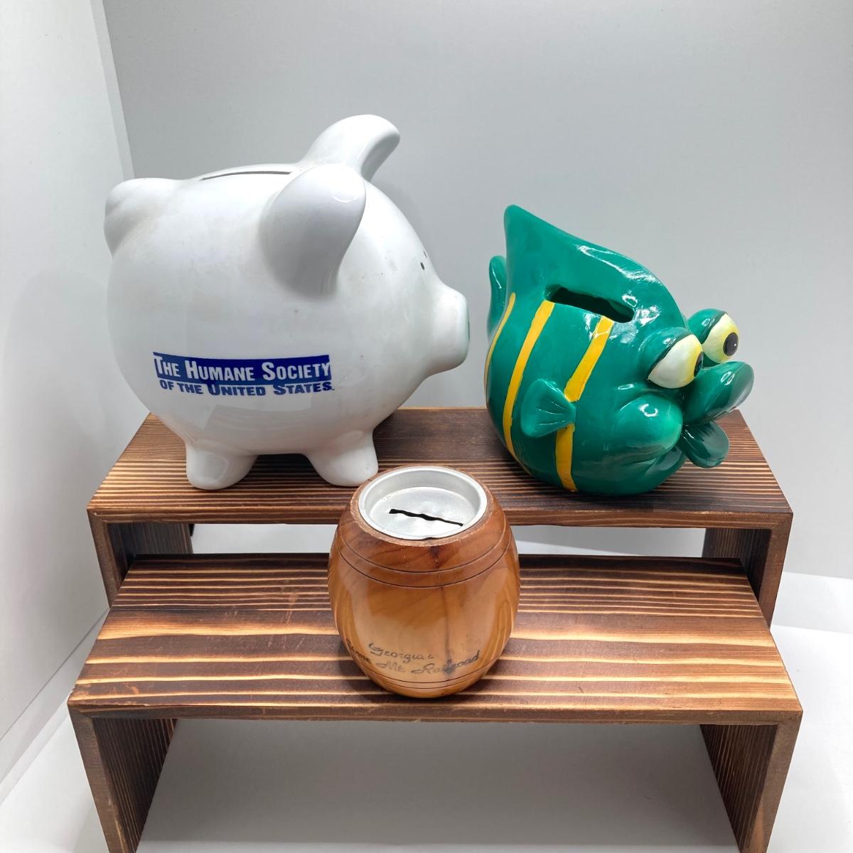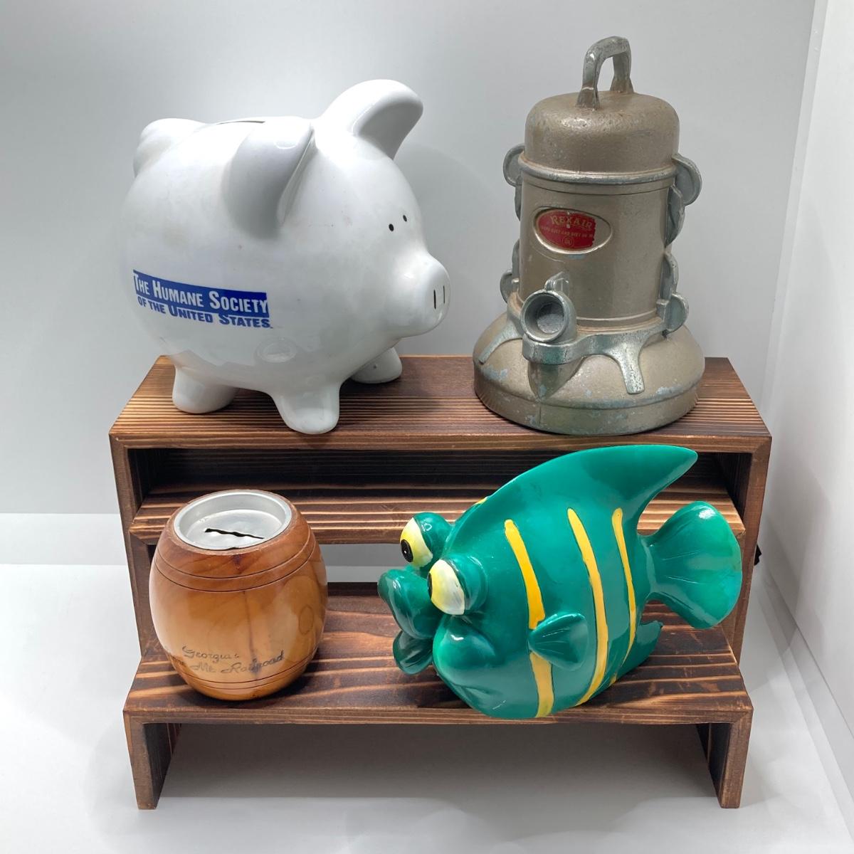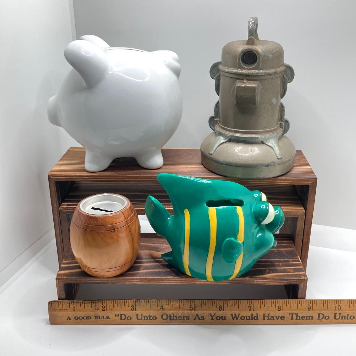 LOT 163: Collection of Coin Banks - Vintage Rexair Vacuum, Humane Society Piggy, Tropical Fish and Souvenir Barrell