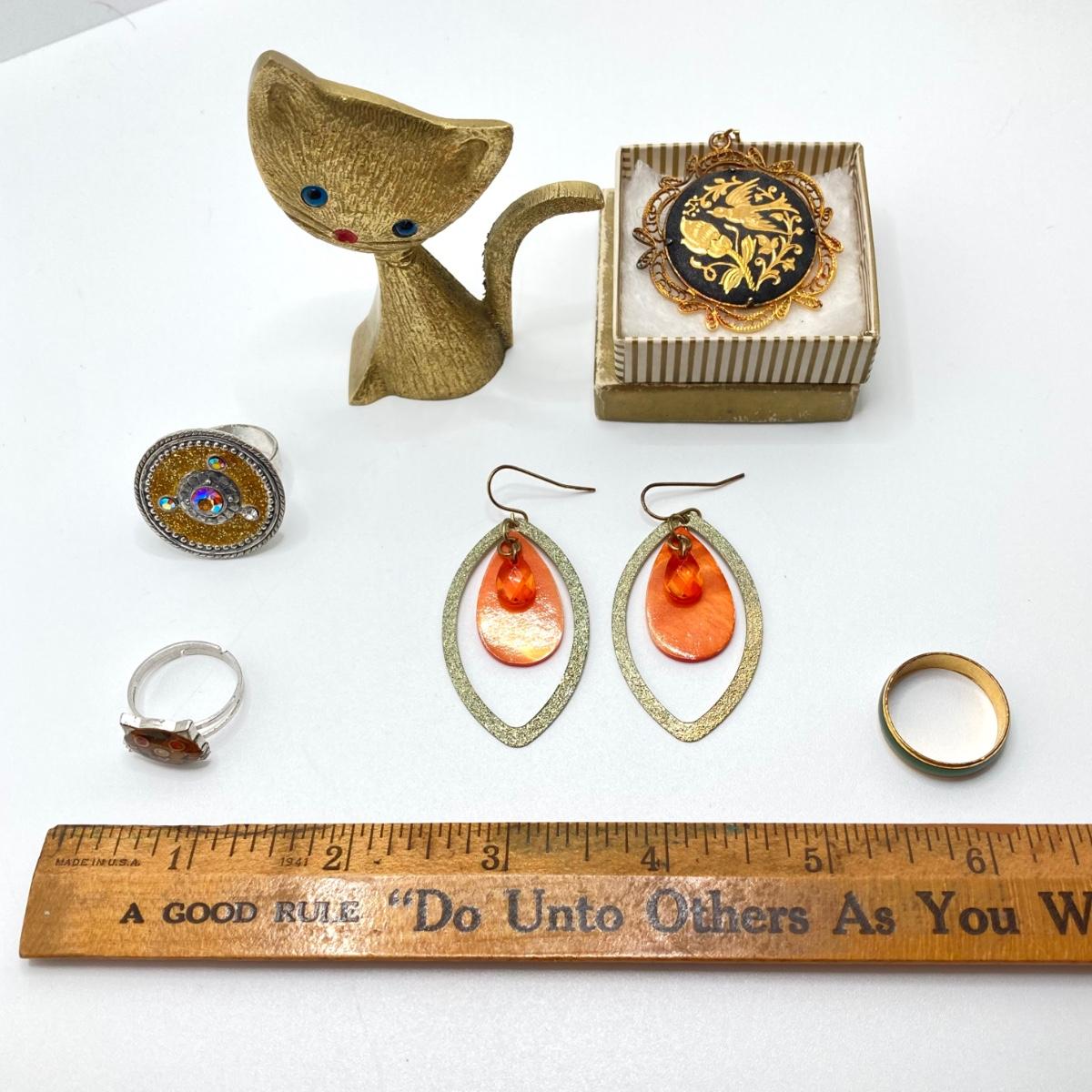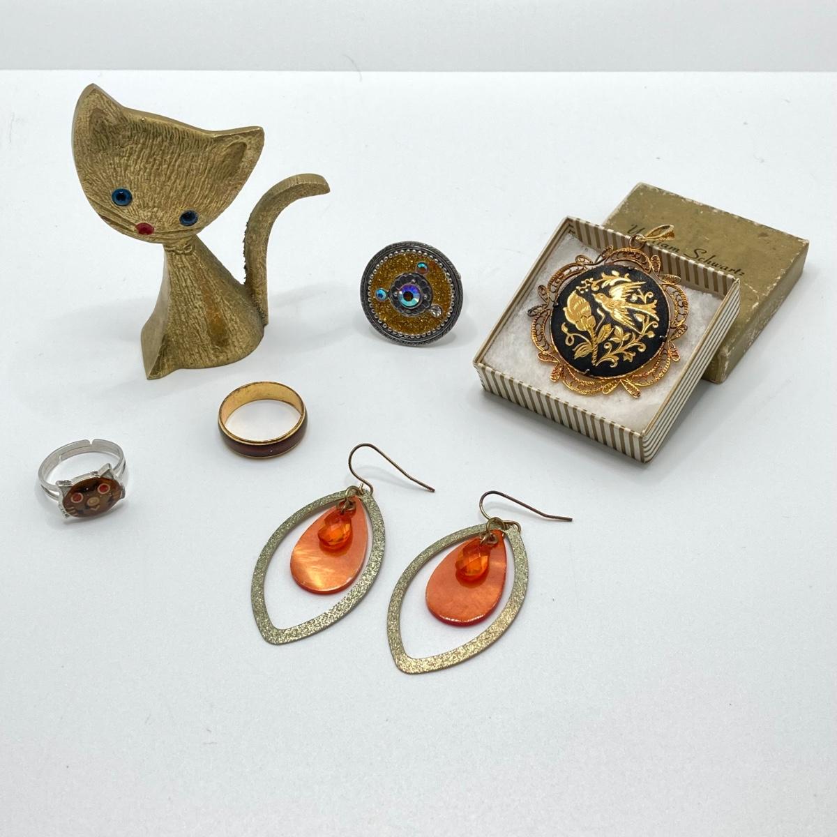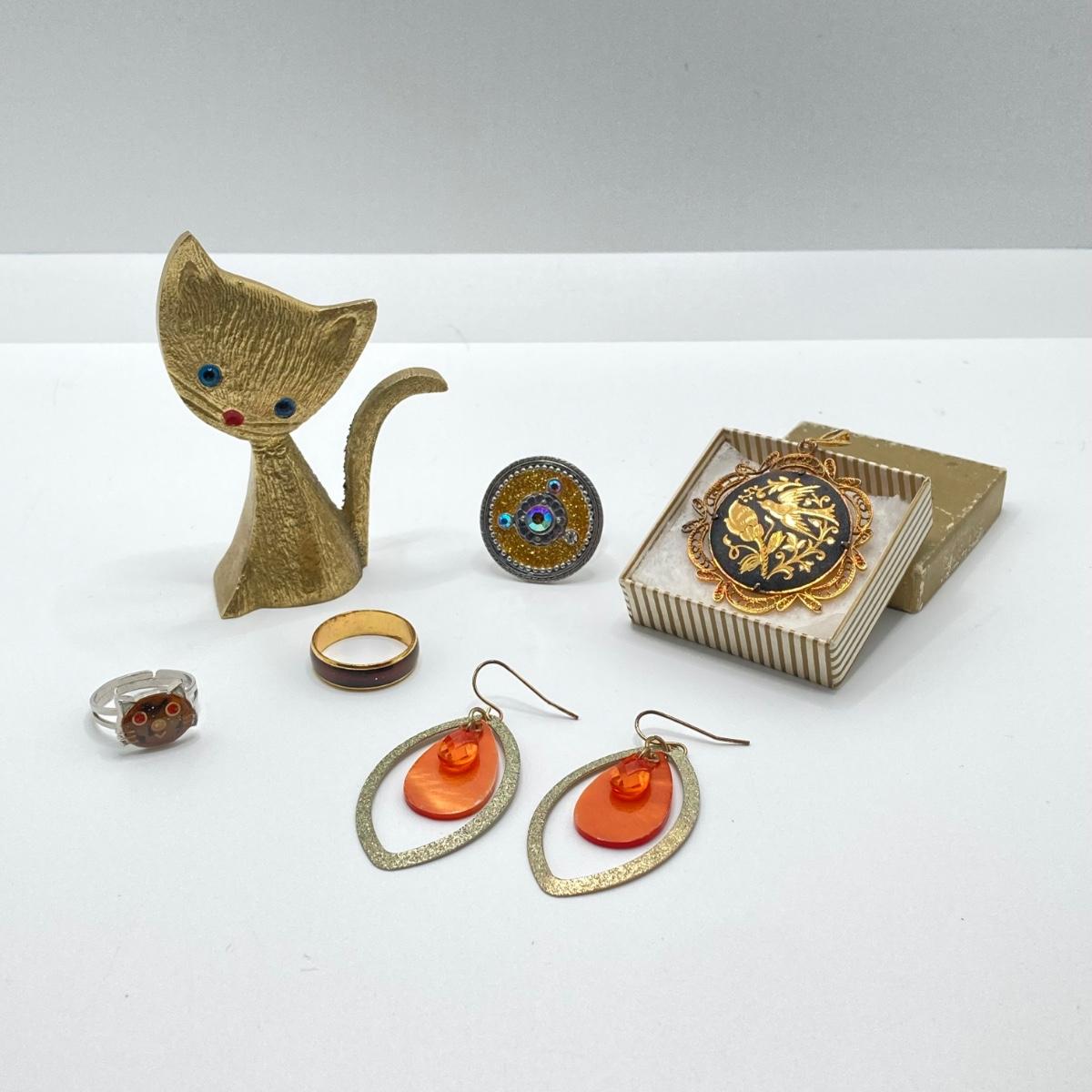 LOT 164: Vintage Jewelry and Ring Holder - Gold Tone Cat Ring Holder, Damascene Pendant, Mood Ring and More